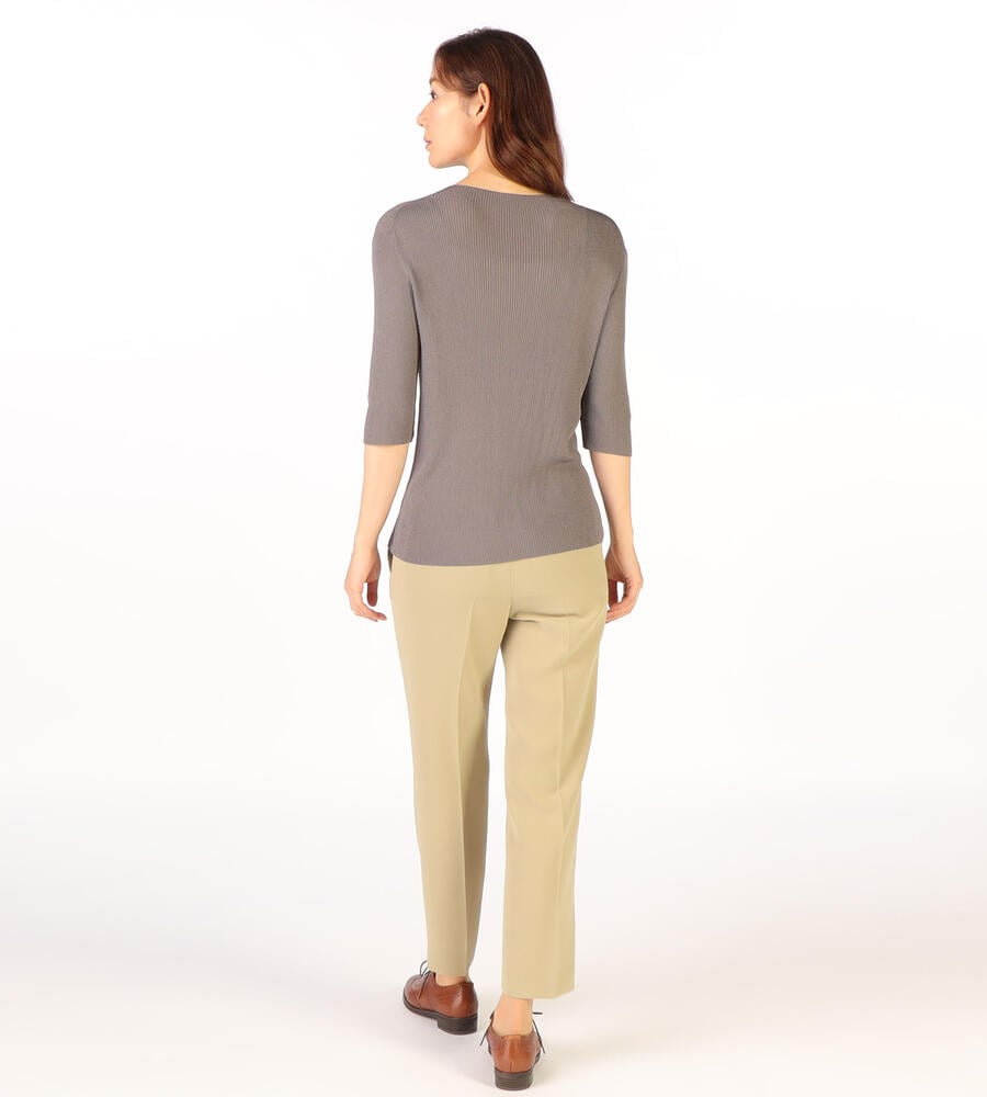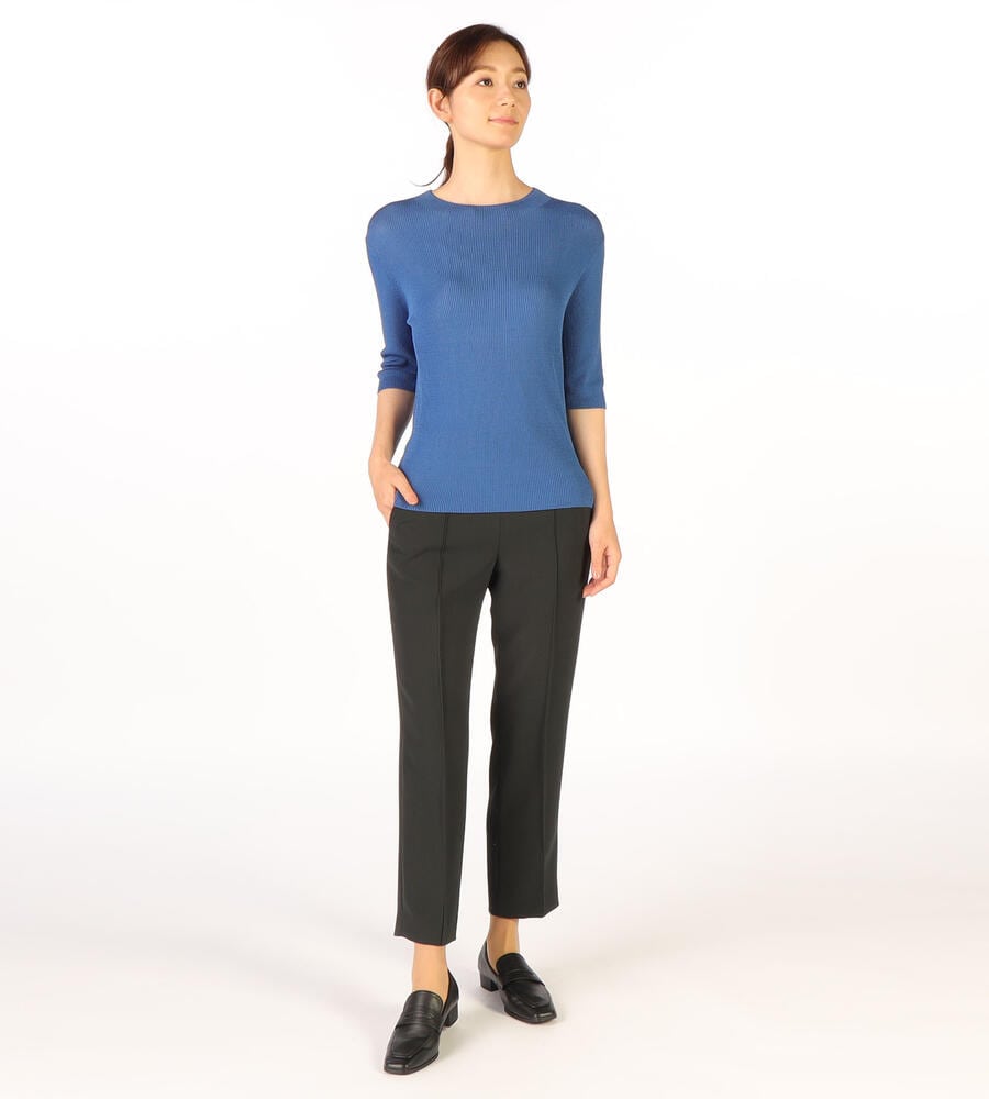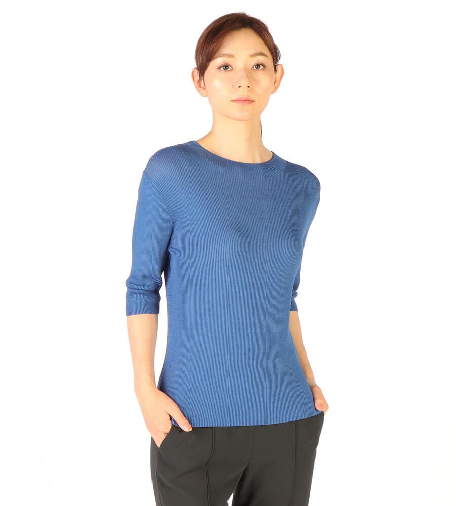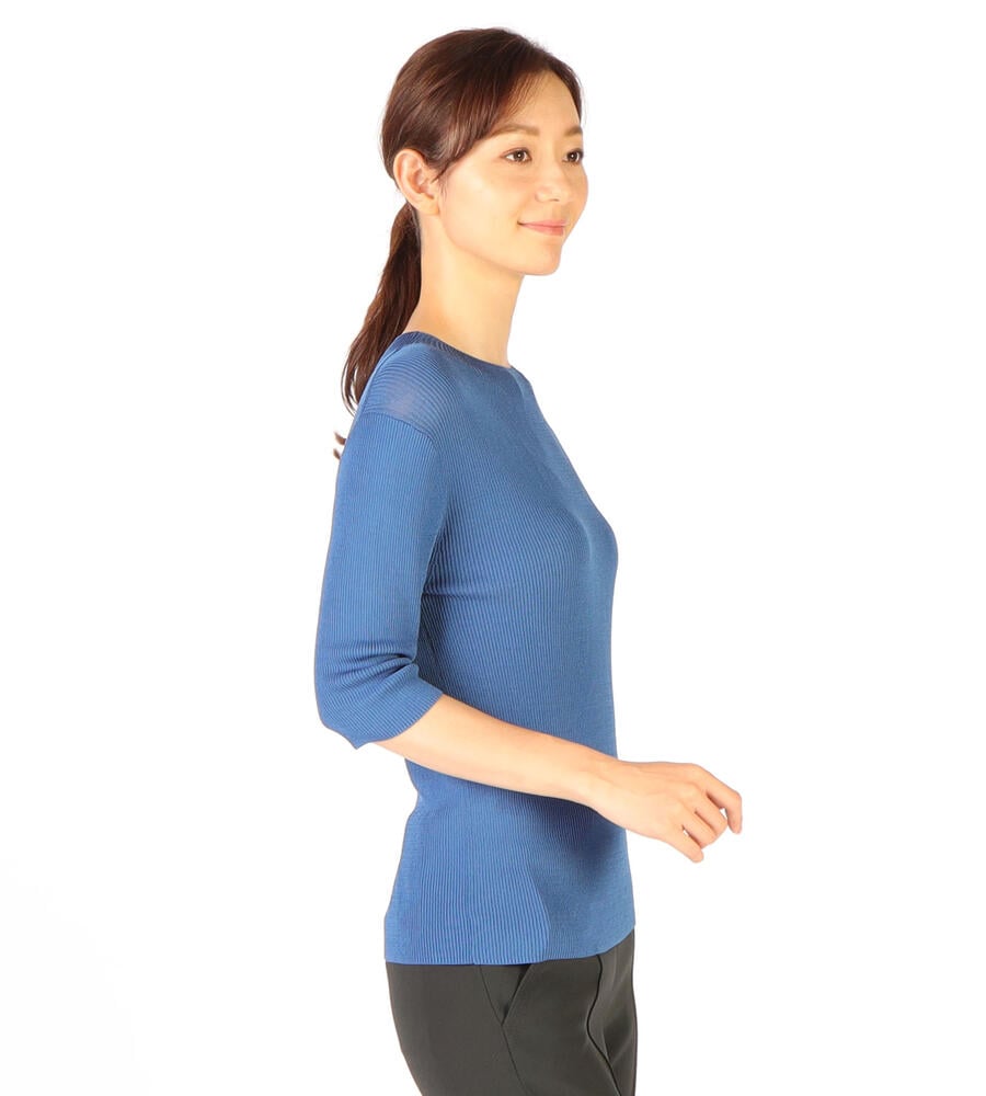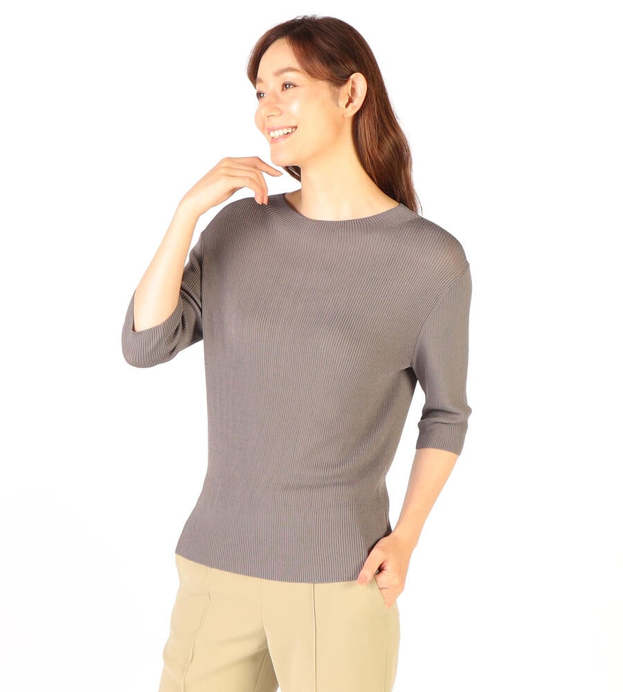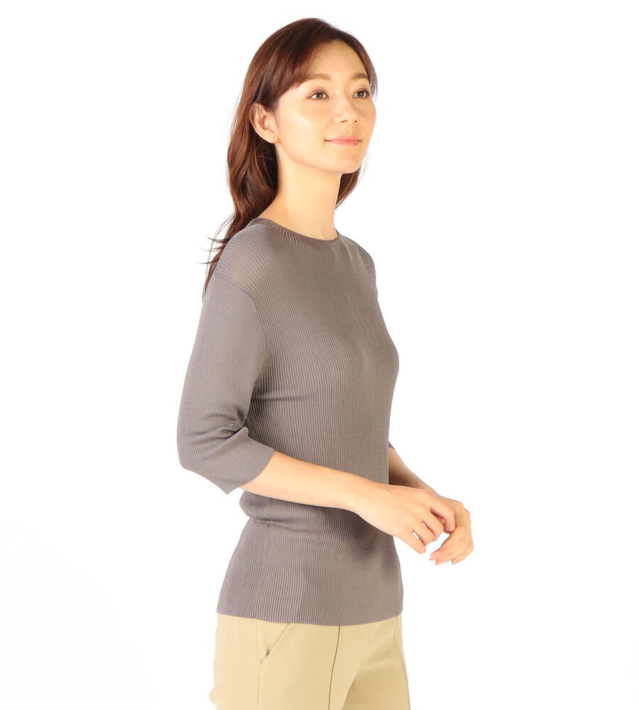 上品な光沢感と鮮やかな発色が魅力の、ブライトストレッチニット素材の5分袖ニット。トレンドの細リブ編みが今年らしいデザイン。ストレッチ素材なので、身体の動きに合わせて伸縮し、ストレスフリーな快適な着心地。シンプルなデザインでボトムを選ばず着こなせて、デイリーに活躍するアイテムです。
