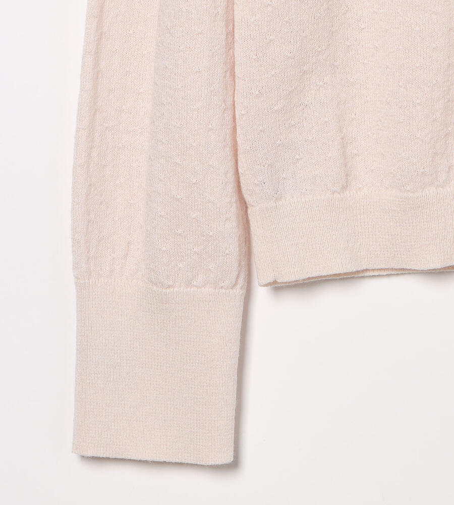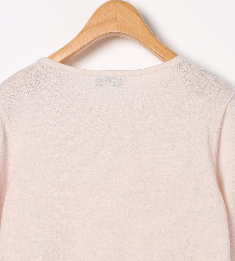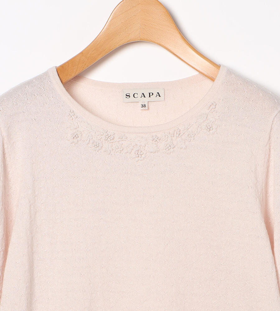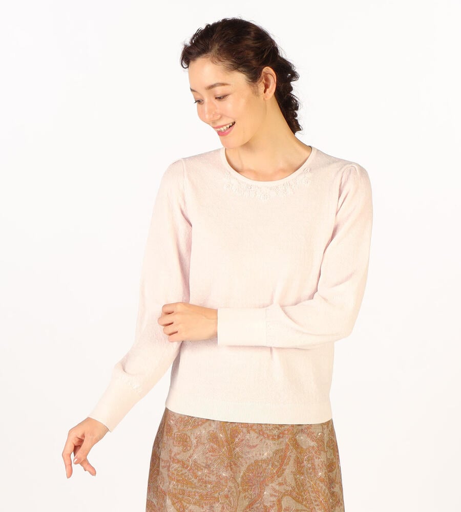 首もとに可憐なフラワーモチーフを同色でさりげなくあしらったニットトップス。シンプルな中にも愛らしいエッセンスをプラスし、洗練された大人の甘さを取り入れたアイテムです。コンパクトなシルエットはボトムスと合わせやすく、上品に着こなしていただけます。