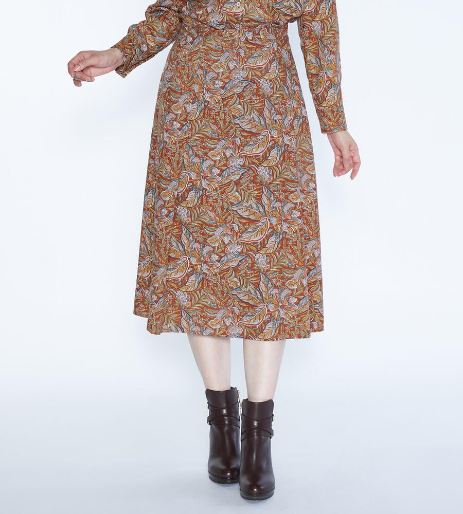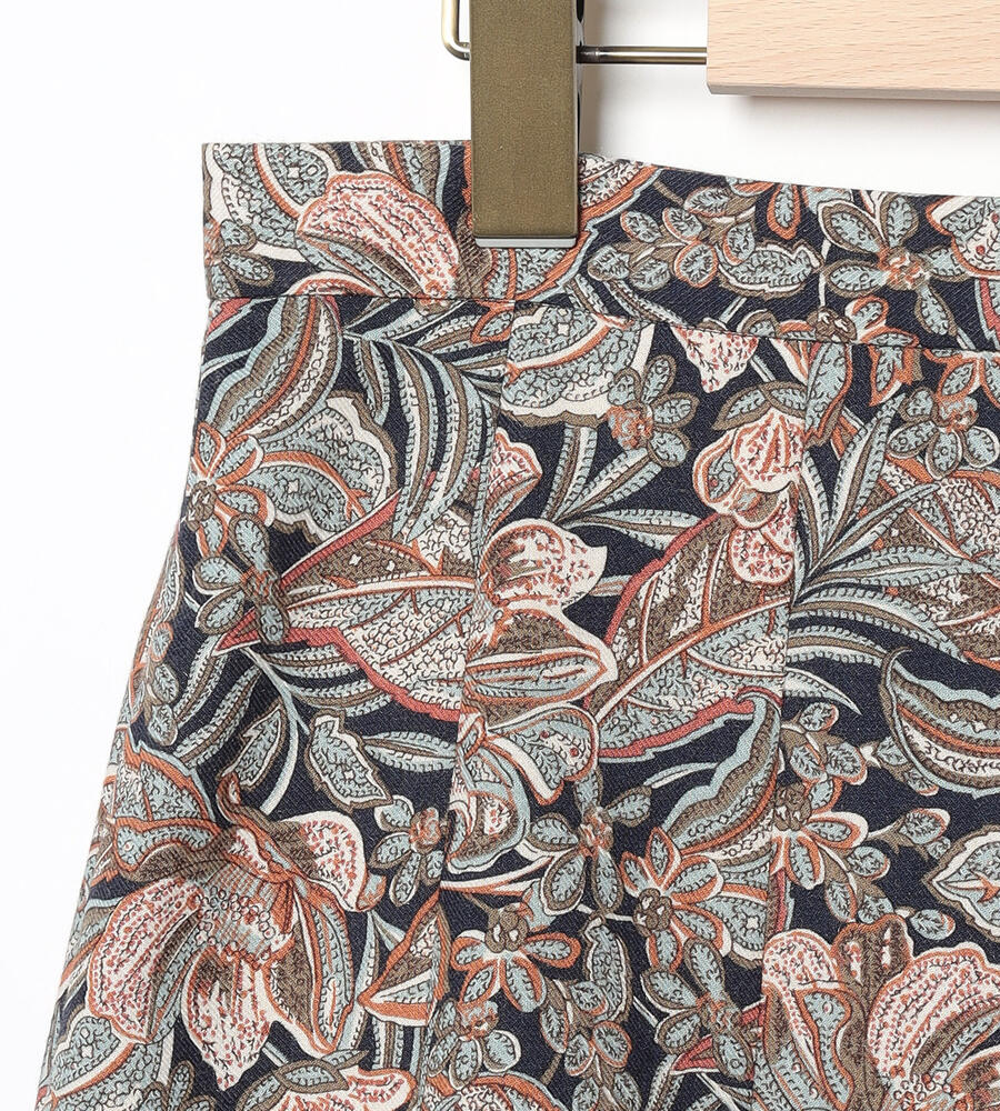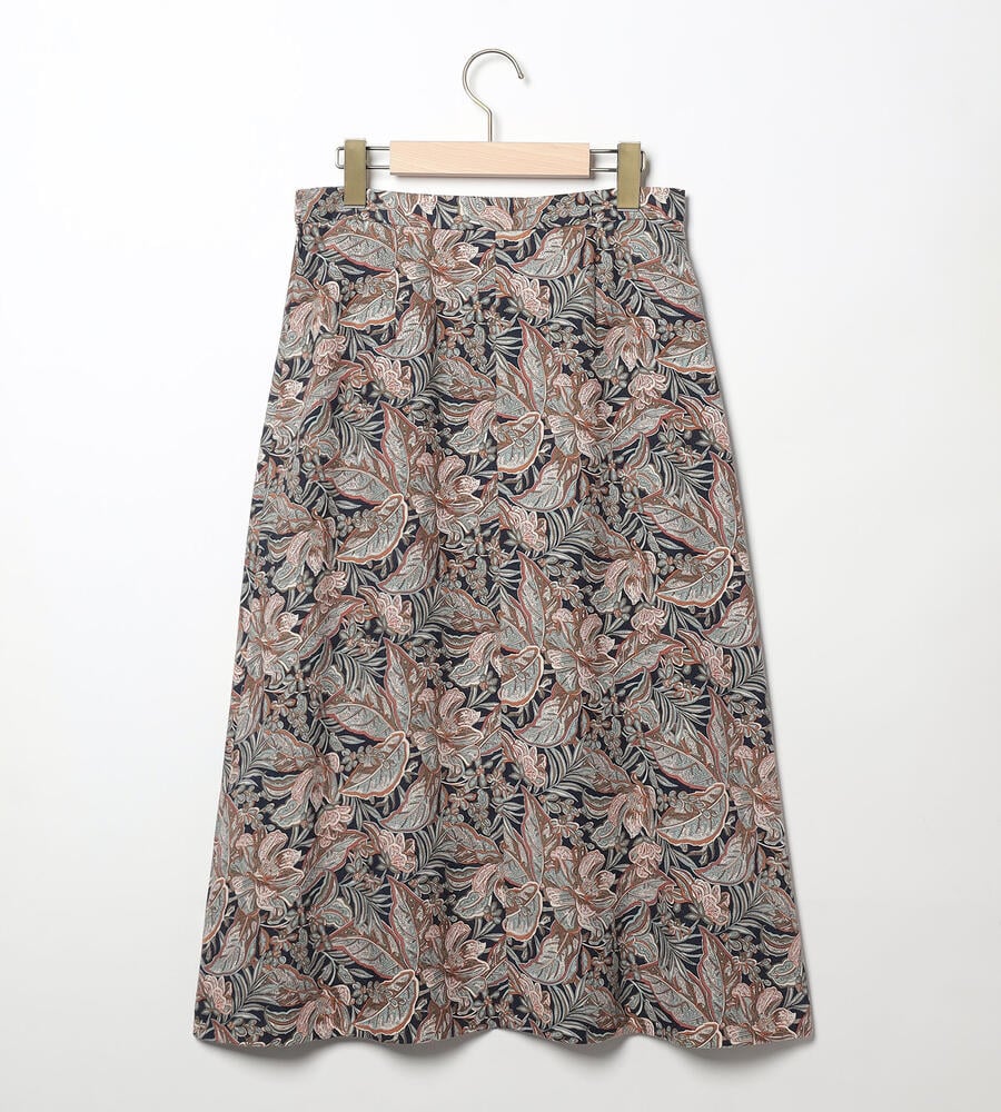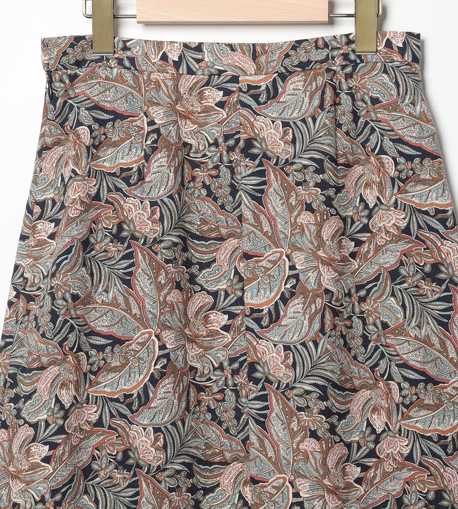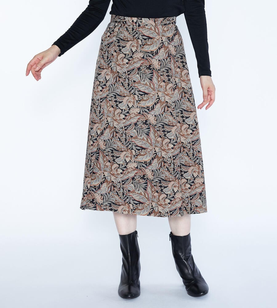 ポリエステルをベースにウールを織り交ぜた、上質な素材を用いたスカートです。落ち着いたトーンのペーズリー柄を載せて、オリエンタルな空気感に仕上げています。優雅に揺れるフレアで、着こなしの品位をキープ。膝が隠れる程度の着丈は、秋冬の淑女の装いにぴったりです。ウエストをきちんとマークできるのもポイント。