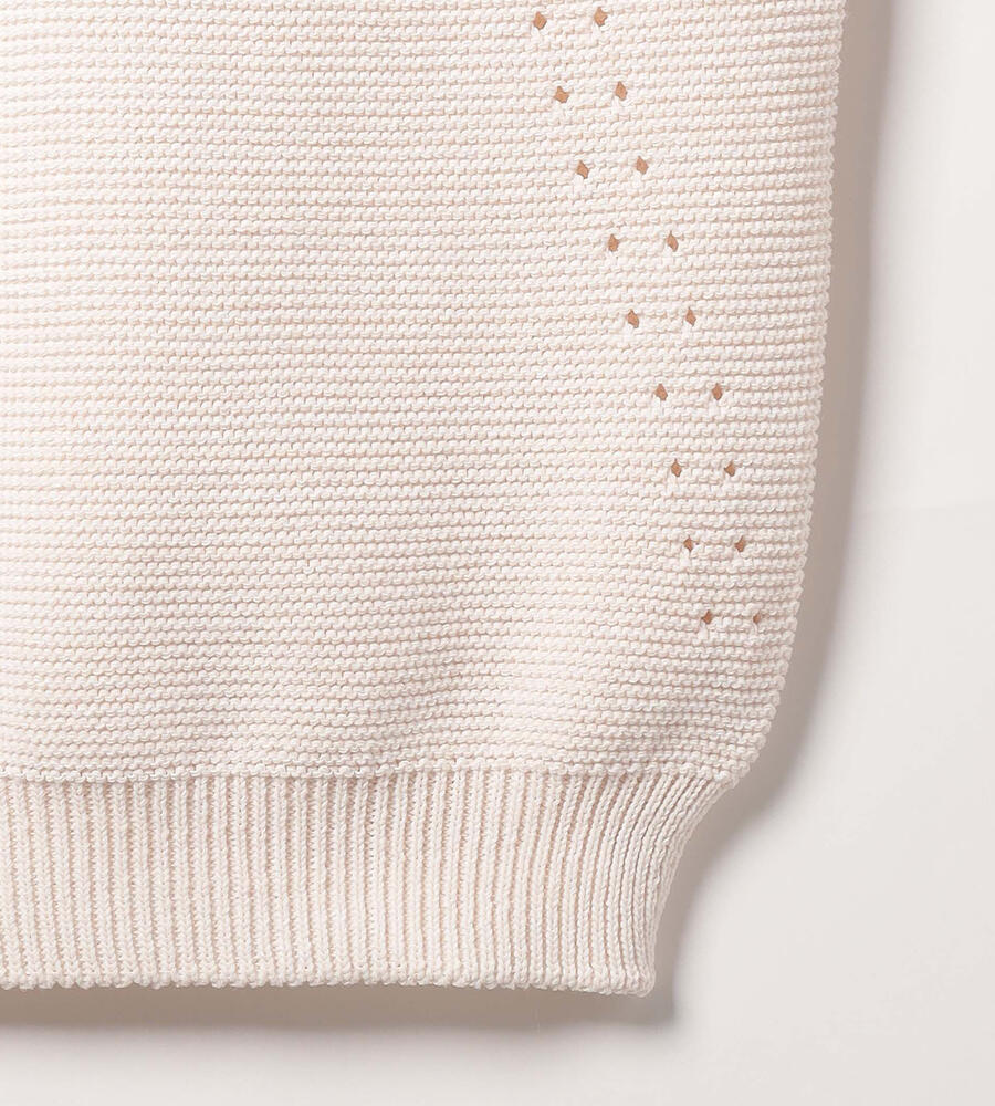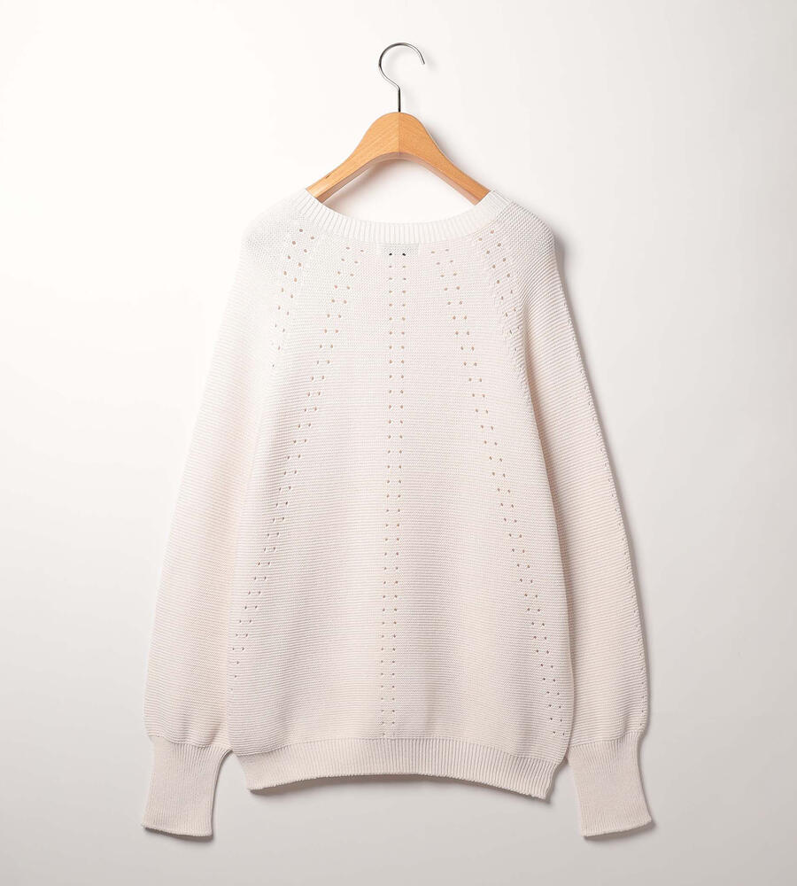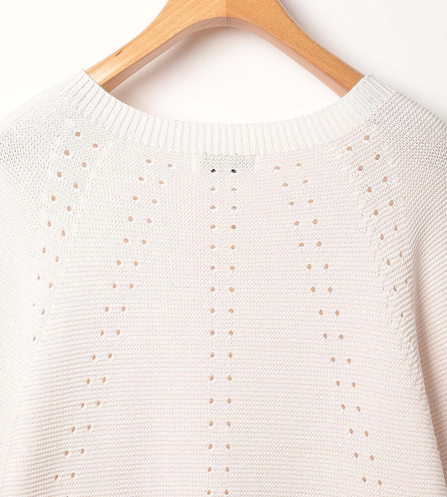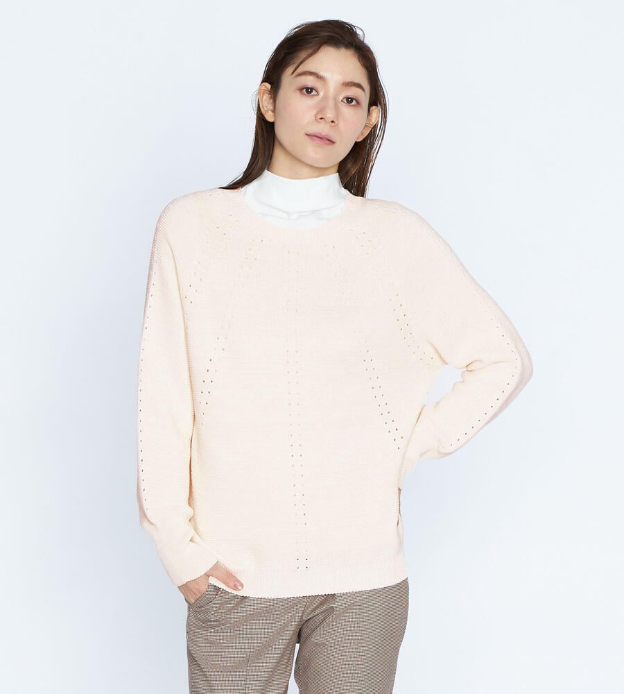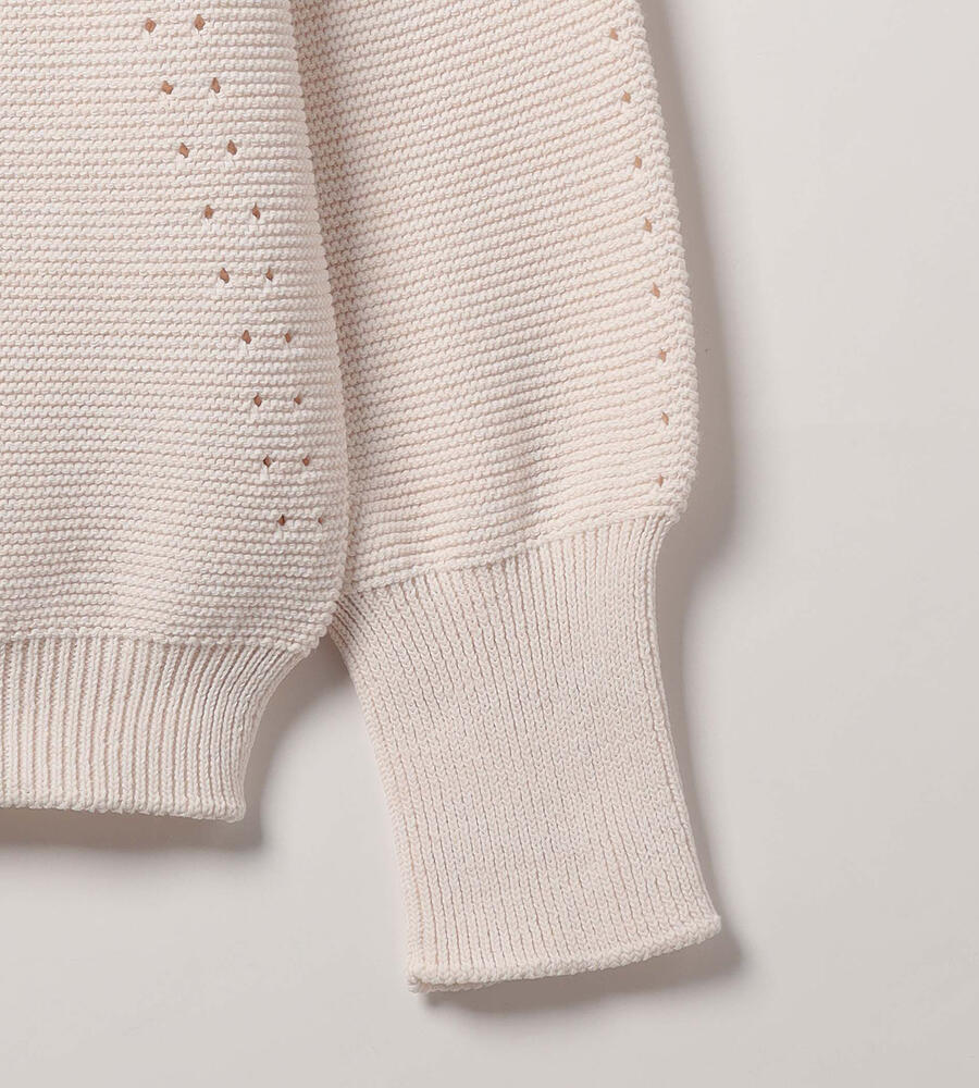 ニュアンスカラーが美しい長袖ニット。袖口と裾はシルエットにメリハリを与えるリブ編み。一部ドットの透かし編みを取り入れた、軽やかなムードのデザインも魅力。コーディネート次第で、カジュアルにもシックにも着こなせるシンプルかつエレガントな一枚。ボトムを選ばず毎日のスタイリングで活躍します。