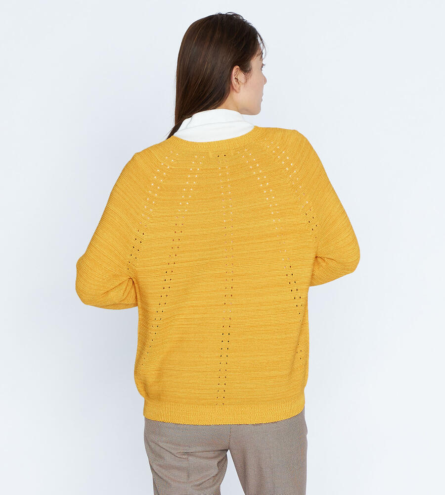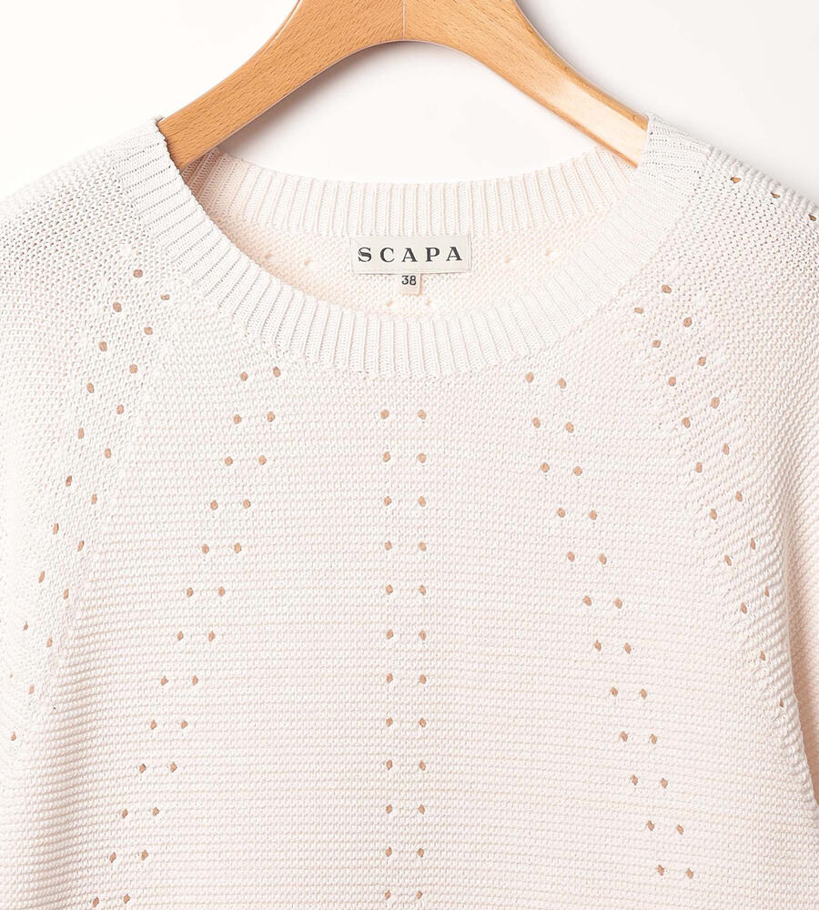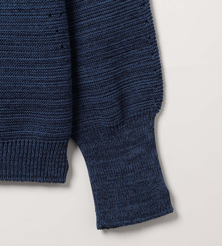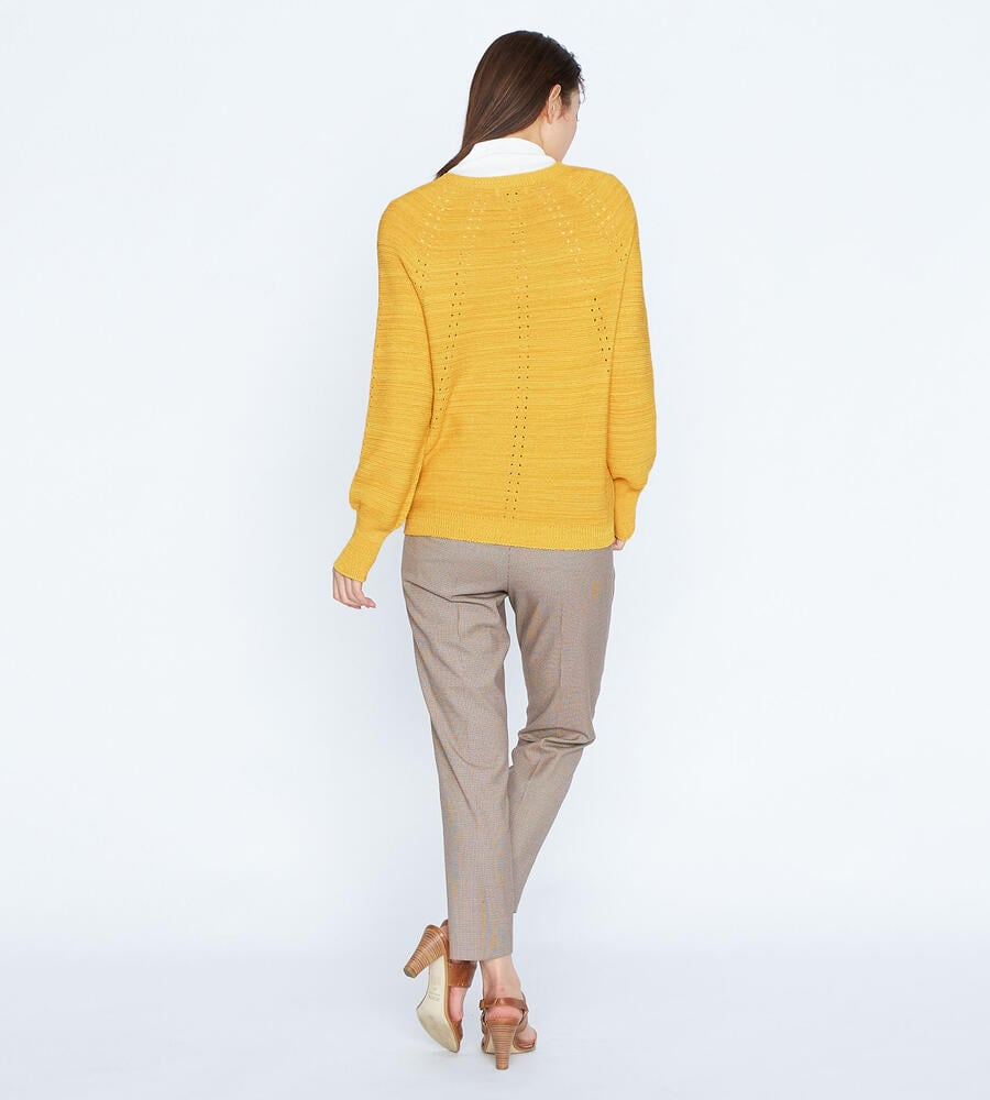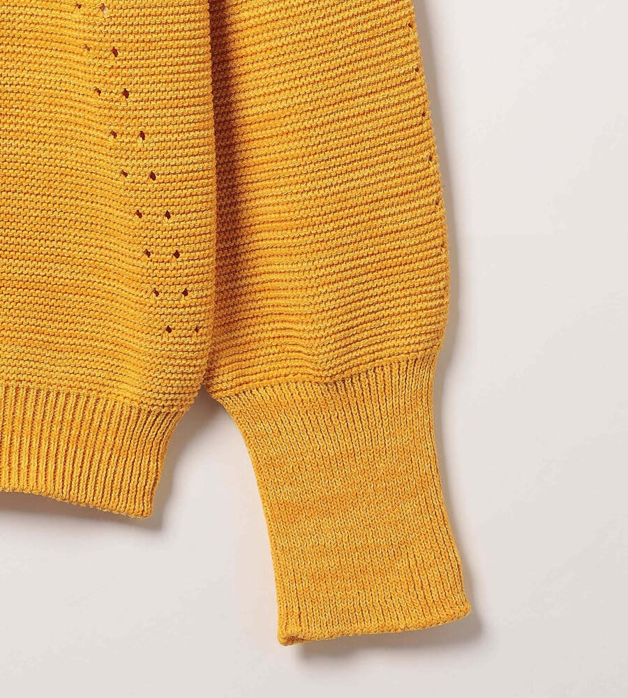ニュアンスカラーが美しい長袖ニット。袖口と裾はシルエットにメリハリを与えるリブ編み。一部ドットの透かし編みを取り入れた、軽やかなムードのデザインも魅力。コーディネート次第で、カジュアルにもシックにも着こなせるシンプルかつエレガントな一枚。ボトムを選ばず毎日のスタイリングで活躍します。