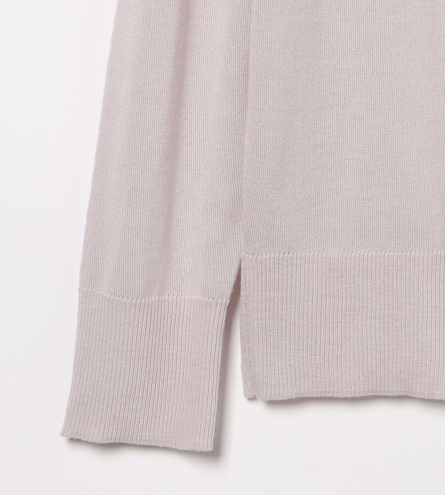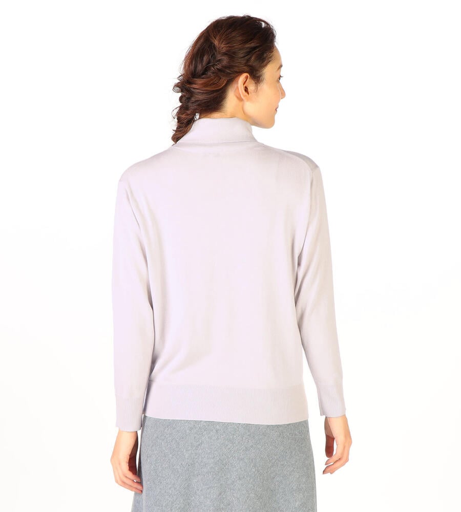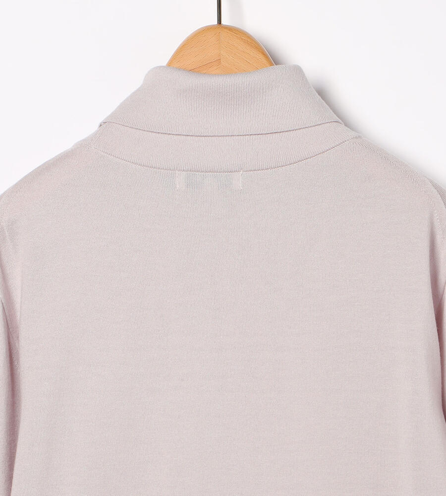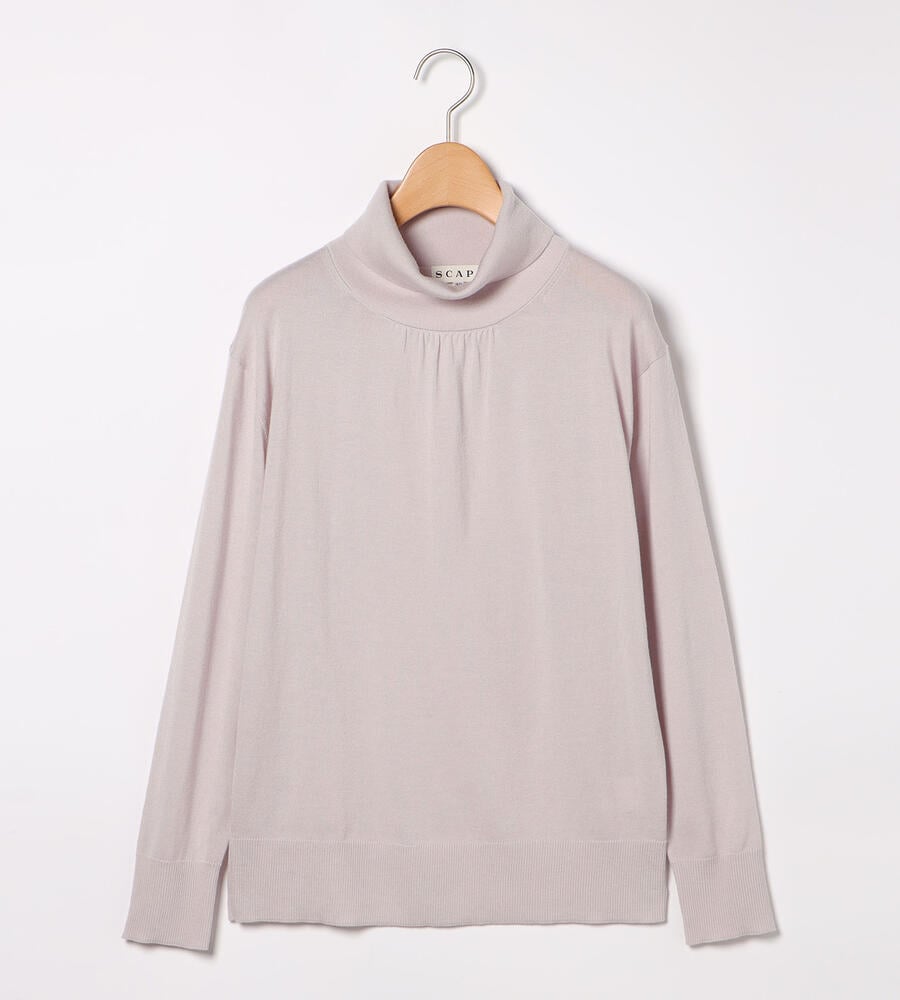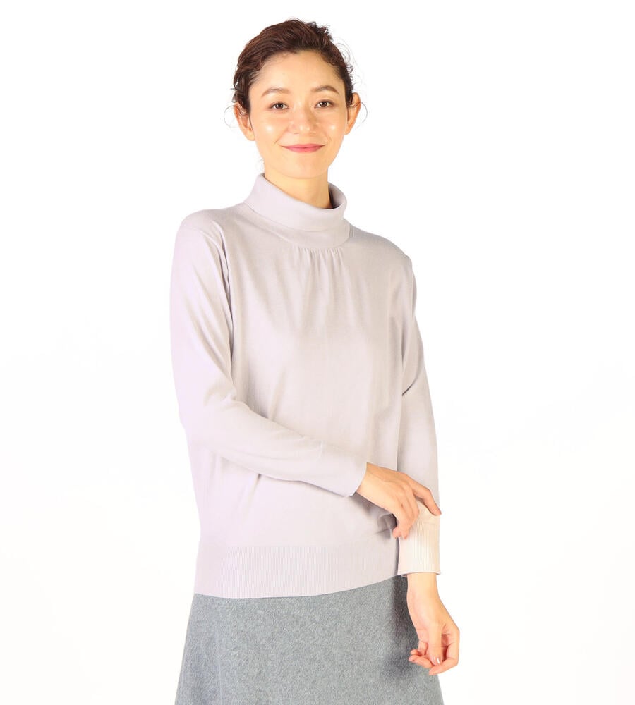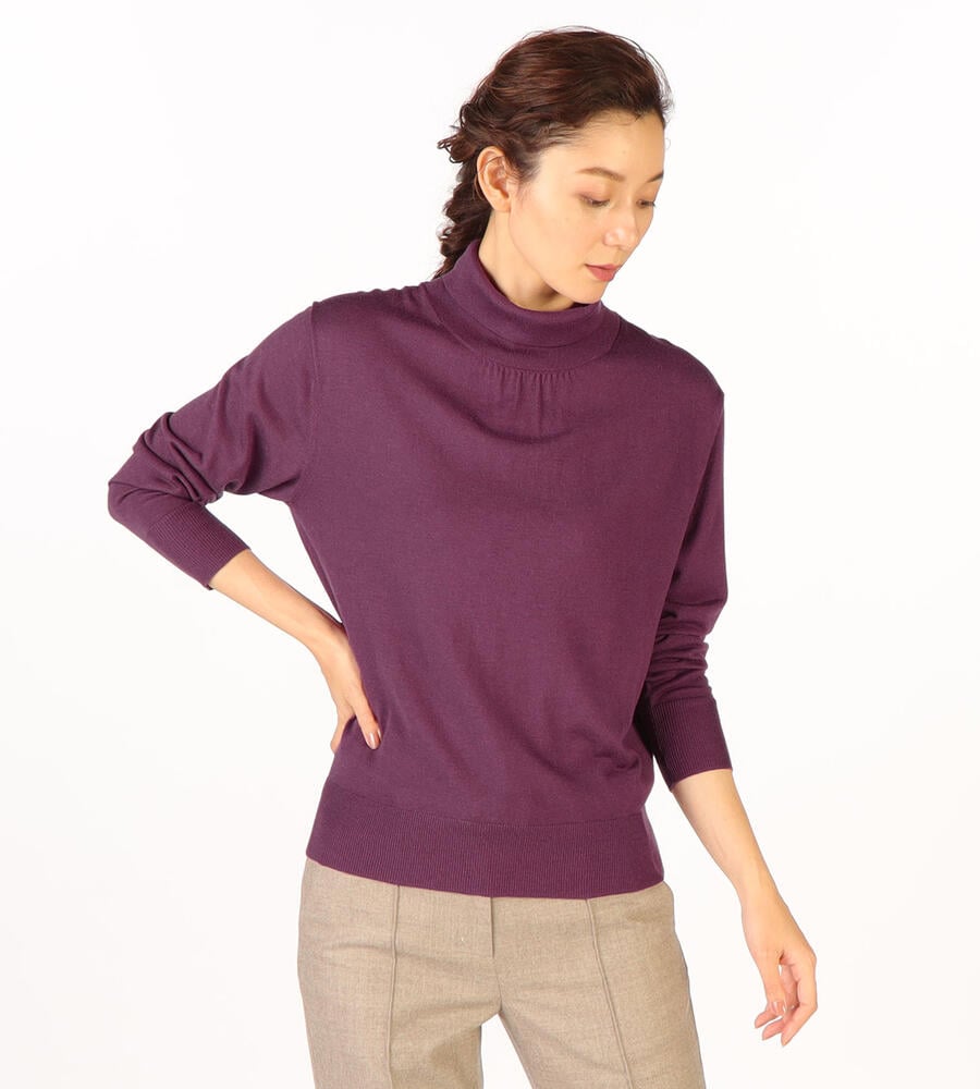 シンプルなデザインがコーディネートのベーシックとして活躍するニットトップス。毛とシルクのブレンド素材は滑らかな肌触りで快適な着心地。折り返しのハイネックデザイン、首もとにはさりげなくギャザーをほどこしワンポイントに。ゆったりとしたドロップショルダーで仕上げています。