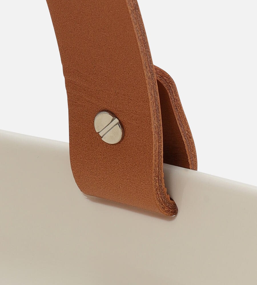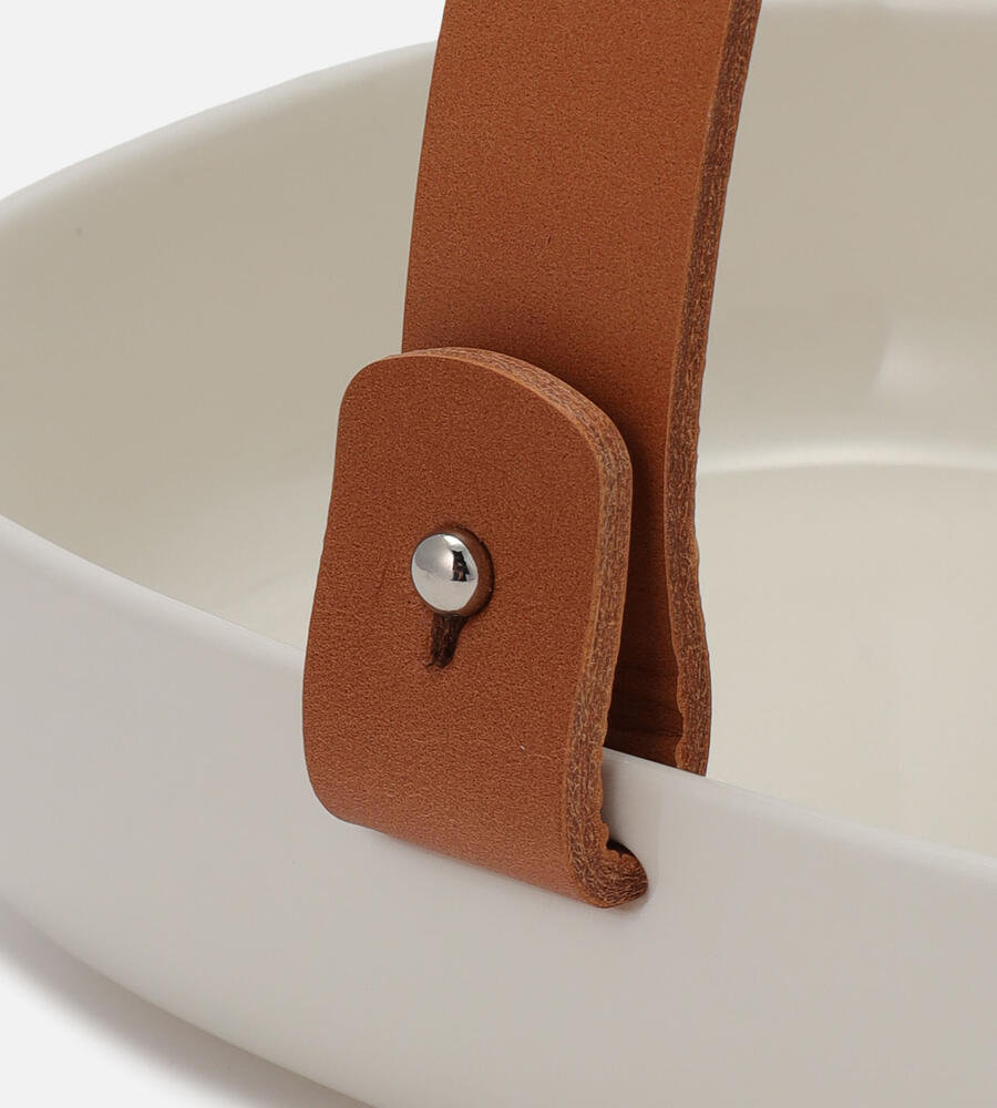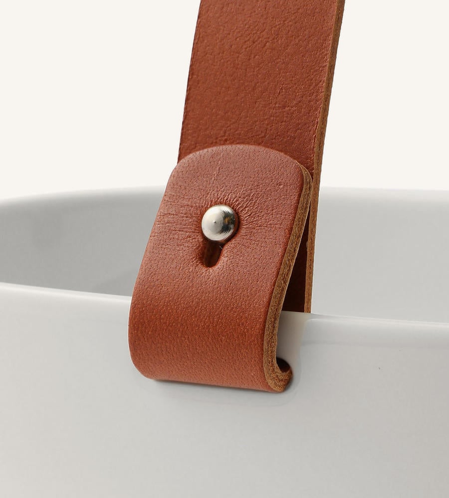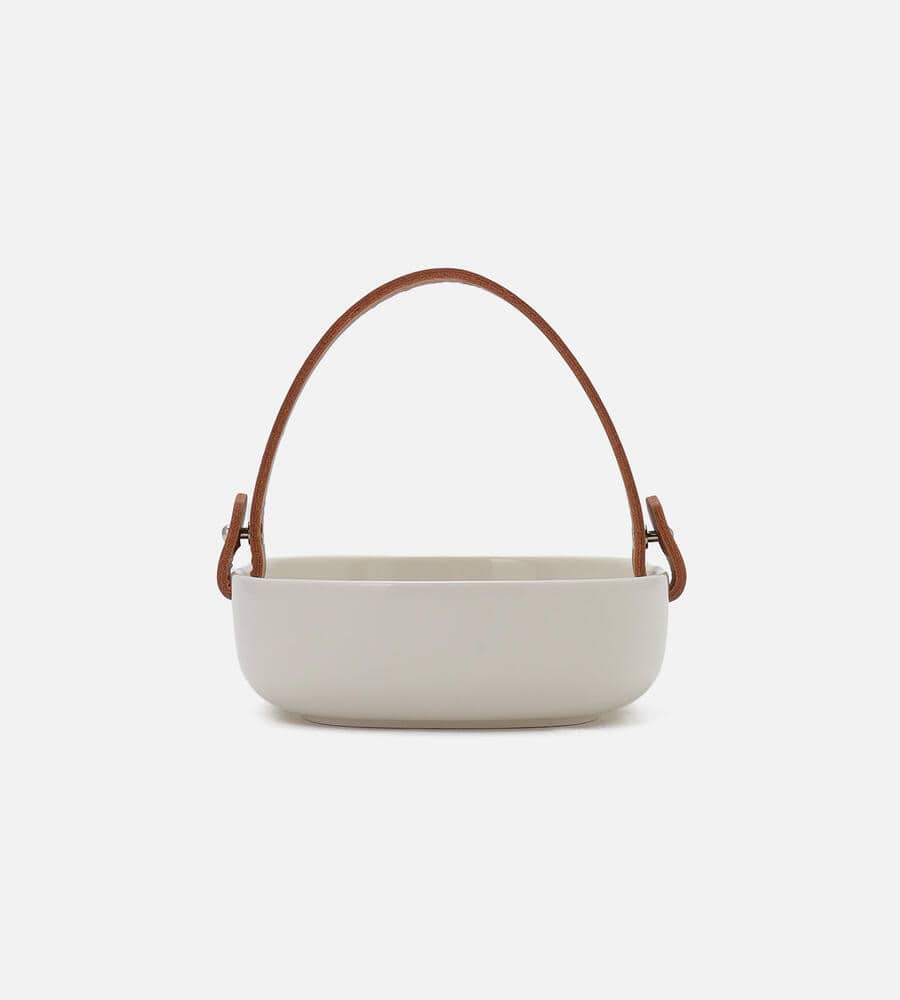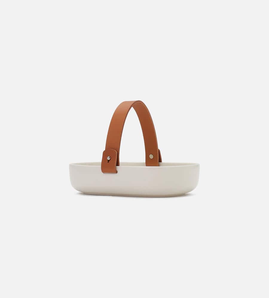 「OIVA」シリーズのセラミックバスケット。深めのフォルムでパンやフルーツを盛り付けるのにぴったり。毎日の食卓はもちろん、友人同士で集まるホームパーティーにもおすすめです。レザーハンドル付き。
