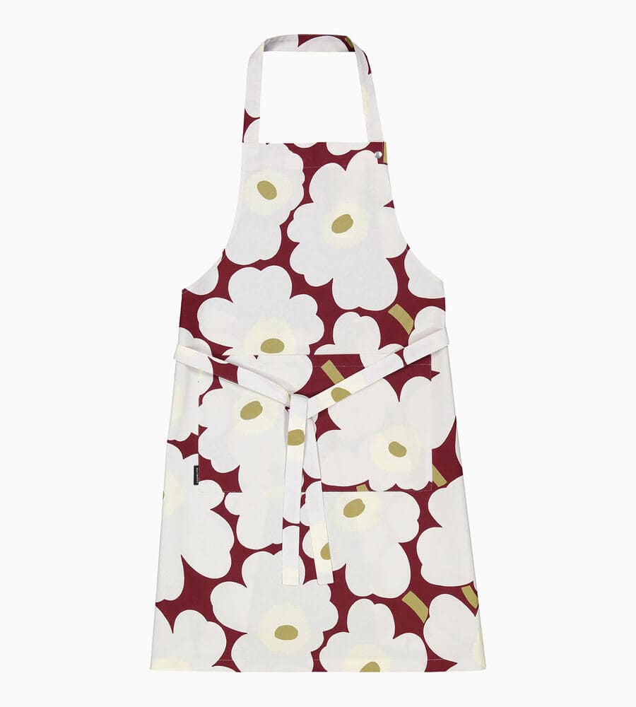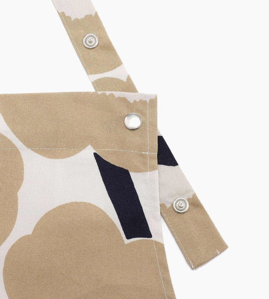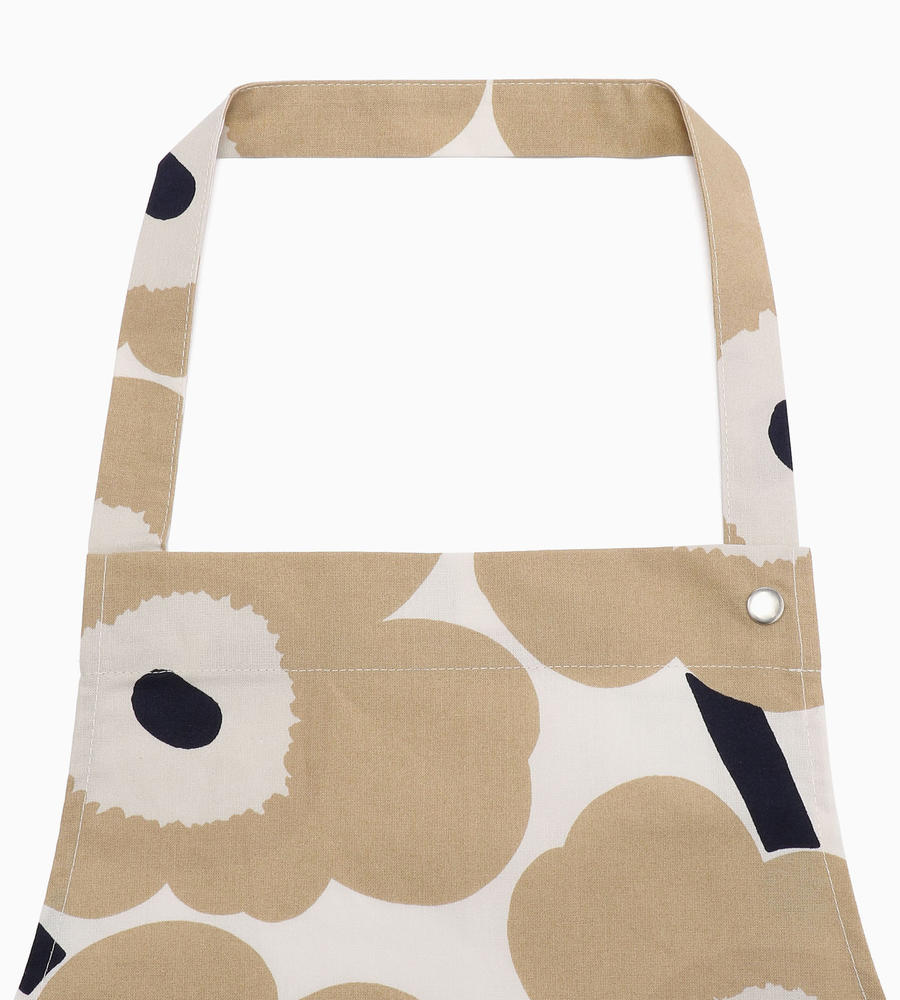 花を表現したPieni Unikkoプリントのエプロン。シックな色味が落ち着いた印象で大人に最適な1枚です。大きなフロントポケットは小物の出し入れがスムーズに行えます。さらりとしたコットンファブリックにより肌触りも快適。首にかけるストラップは3段階での長さ調節が可能です。