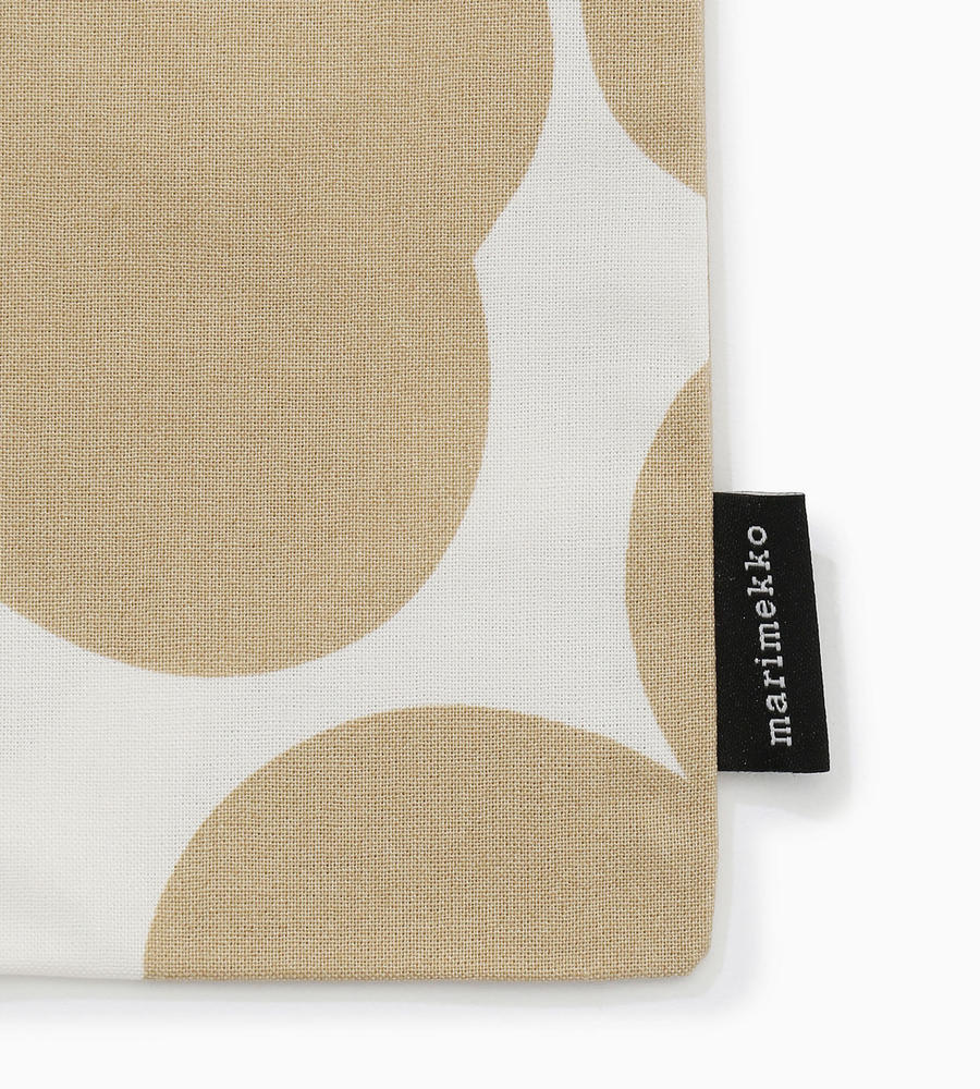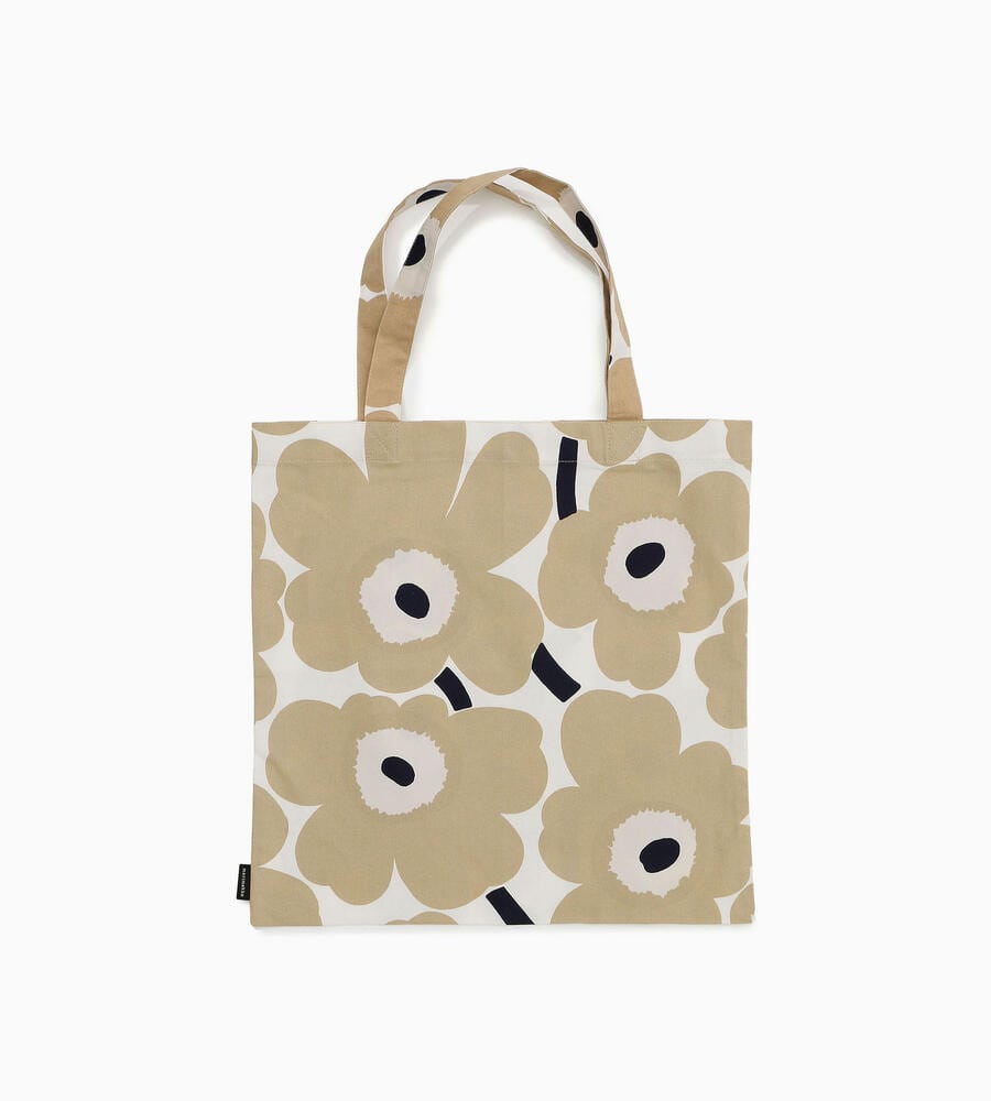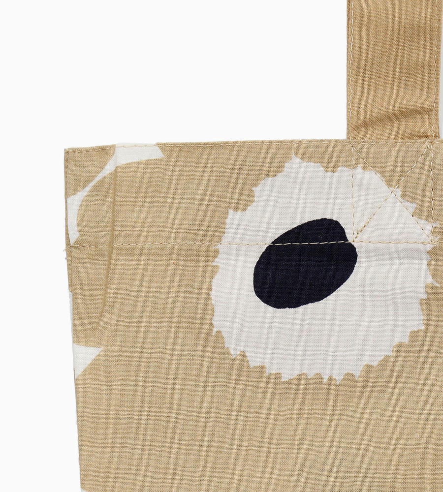 花をモチーフにしたUnikkoプリントをシックなベージュで表現したファブリックバッグ。さらりとしたコットン地を採用。マチのない薄型フォルムは折りたたんでもかさばらないため、サブバッグとしても活躍します。