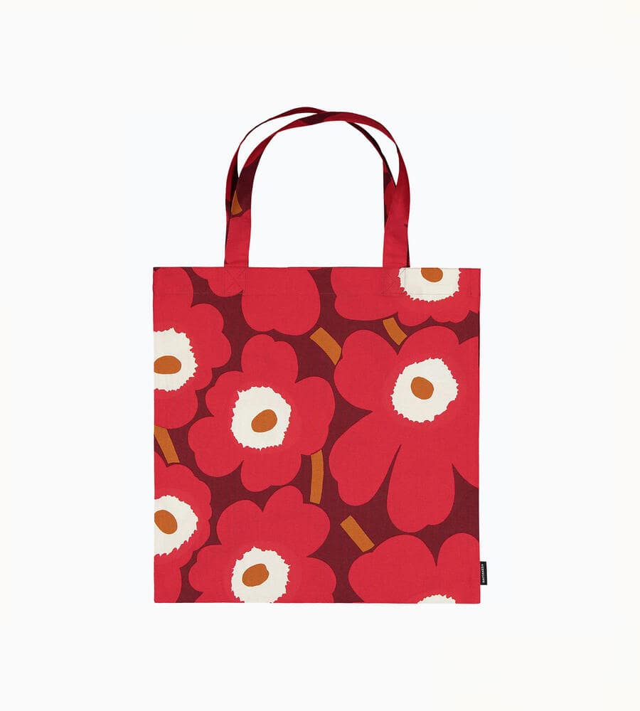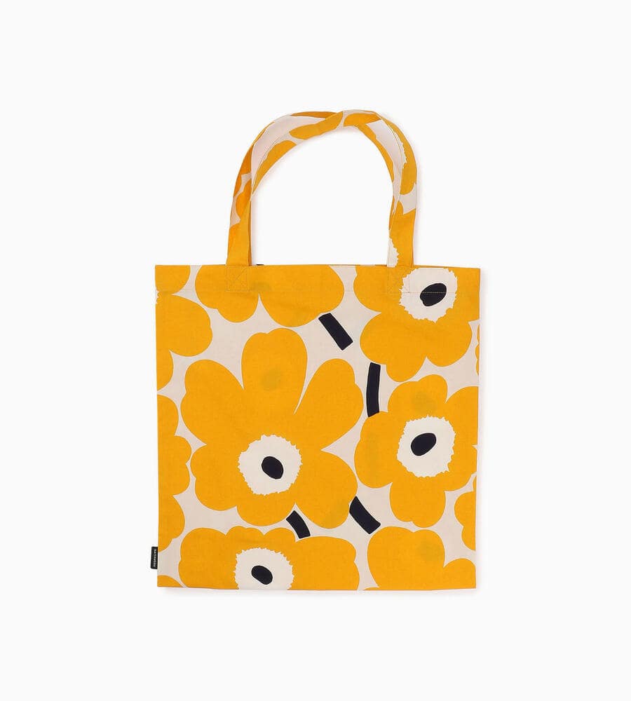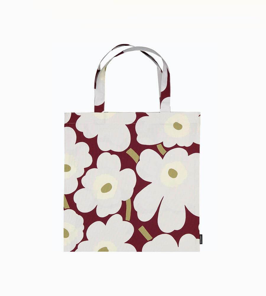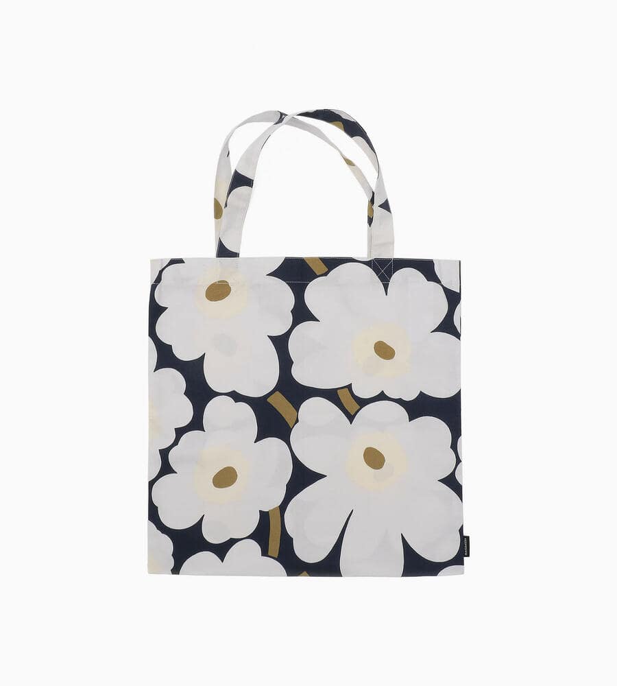 花をモチーフにしたUnikkoプリントをシックなベージュで表現したファブリックバッグ。さらりとしたコットン地を採用。マチのない薄型フォルムは折りたたんでもかさばらないため、サブバッグとしても活躍します。