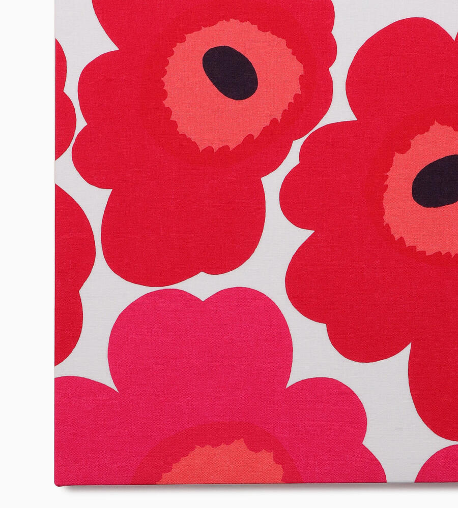 Marimekkoを代表するUnikko柄のファブリックボード。可愛らしい花を、レッドやピンク色で描いた華やかなデザインです。壁にかけたり、棚に置くだけで、空白が気になりがちなスペースにアクセントをプラス。同柄のキッチングッズや寝具などと合わせて統一感をもたせるのもおすすめです。