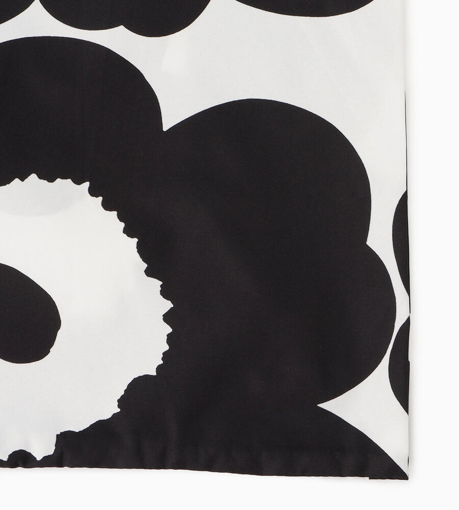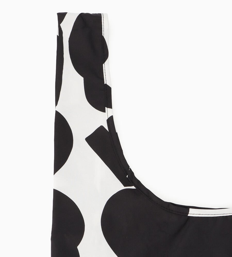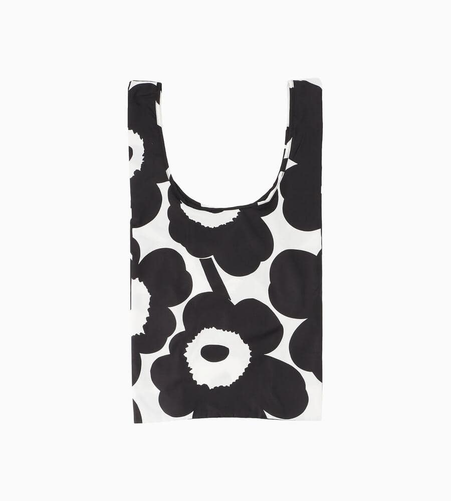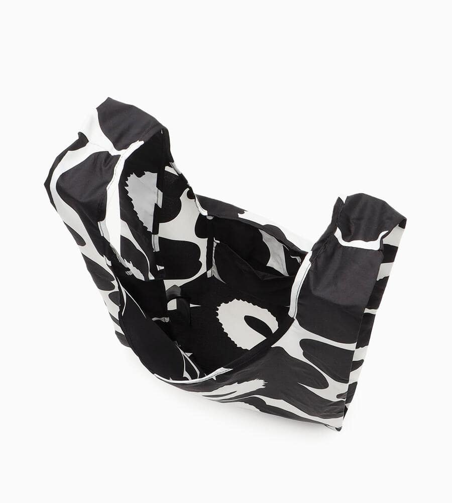 花をモチーフにしたUnikkoパターンをブラック×ホワイトでスタイリッシュに仕上げたスマートバッグ。持ち運ぶにも嵩張らないポケッタブル仕様。デイリーに活躍するアイテムは、プチギフトとしてもおすすめです。