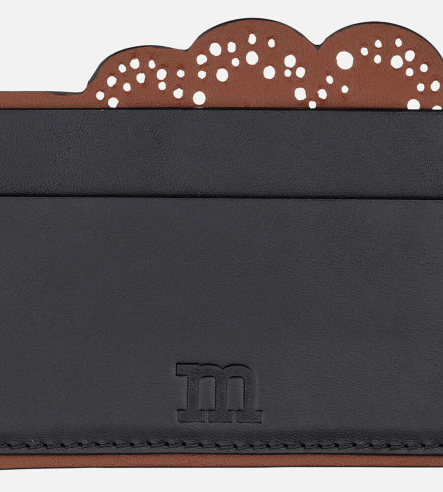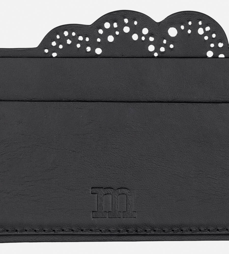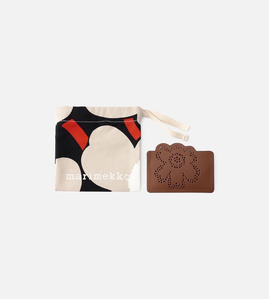 Unikko柄の花を穴あきドットで表現したデザインのレザーカードケース。立体的なカッティングが魅力の愛らしいデザインフォルム。ブランドアルファベットの”m”の型押しをあしらい、細部までこだわりを感じられるデザイン。便利な2段のカードホルダーで、デイリーに活躍するアイテムです。