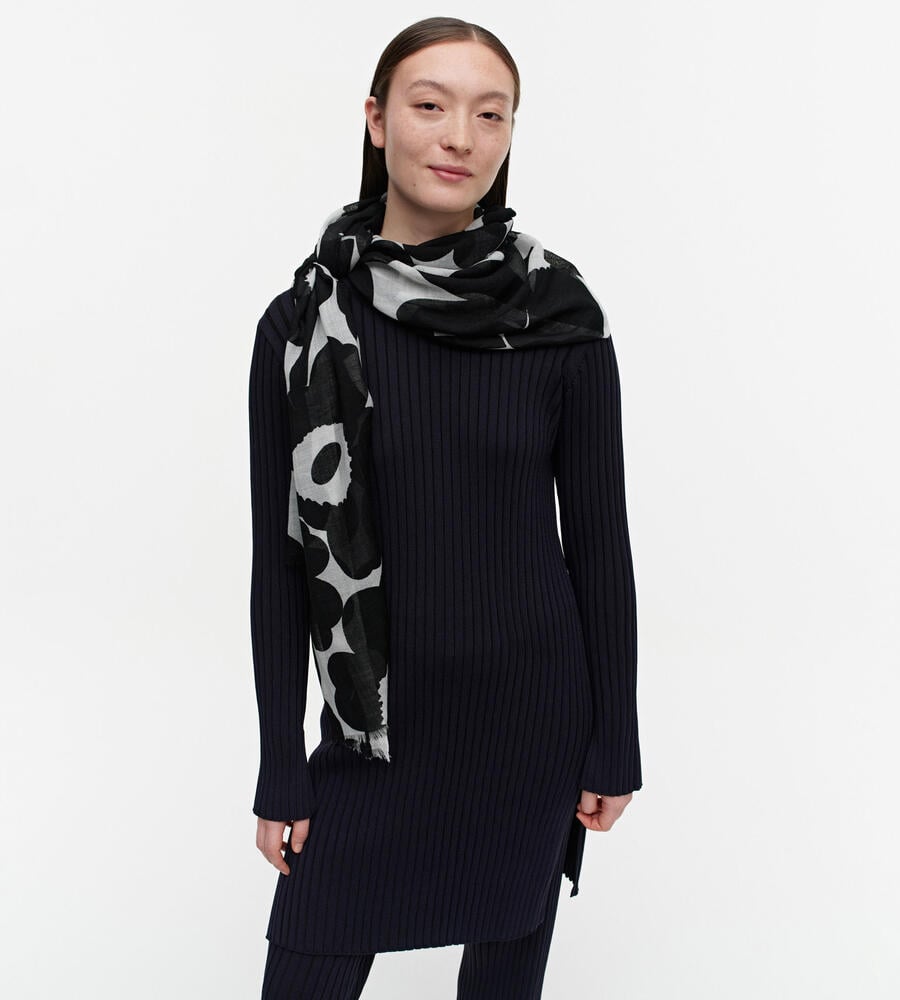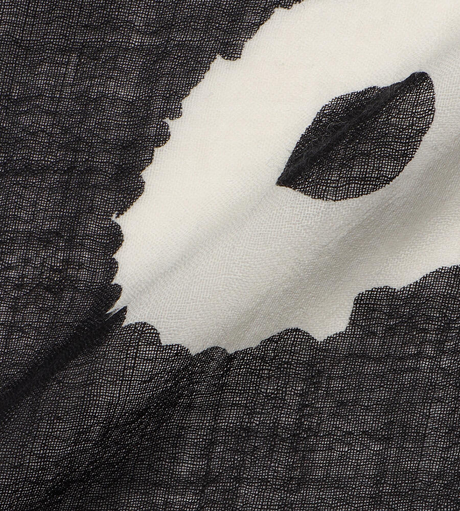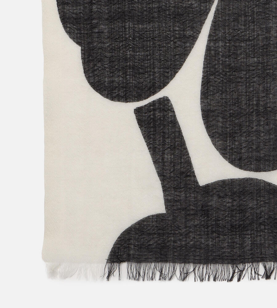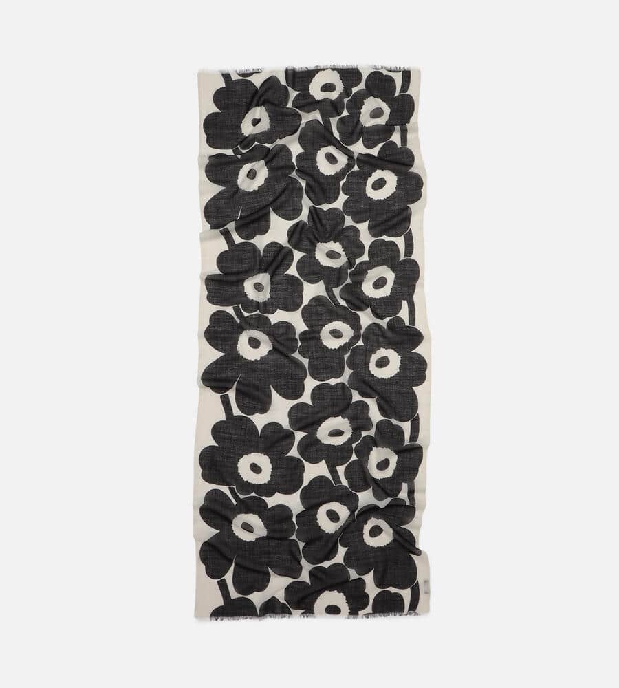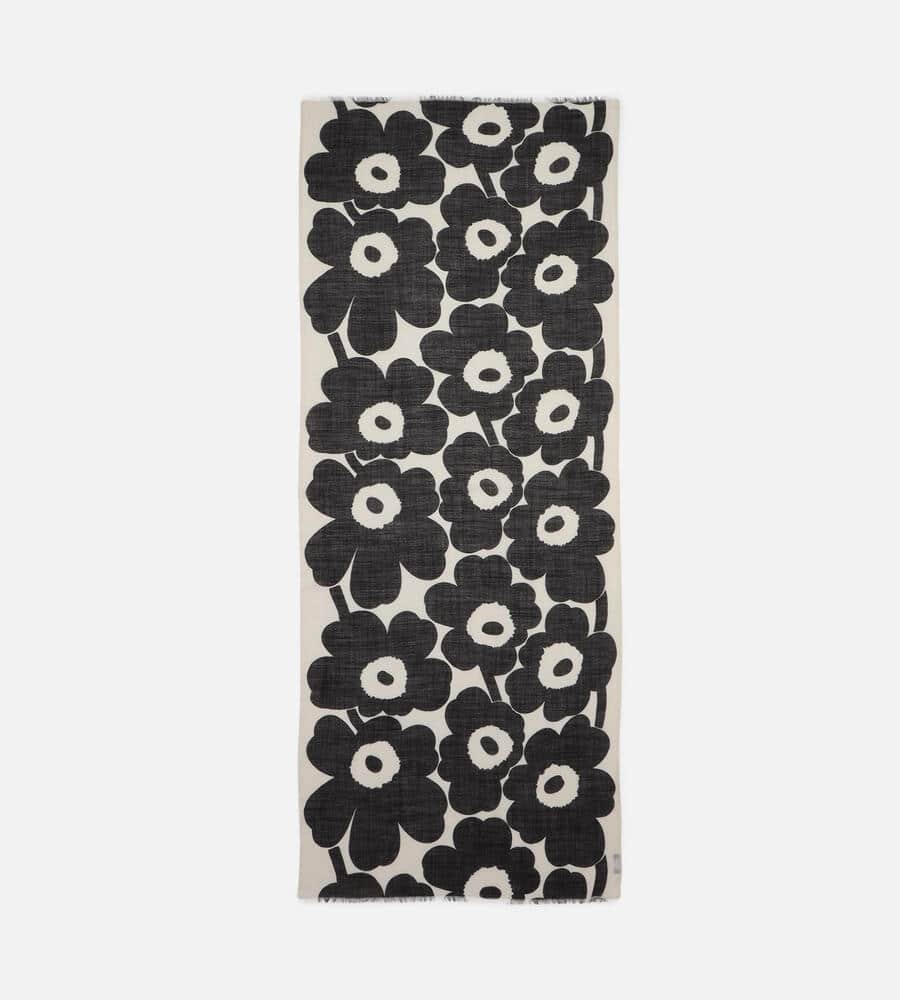 軽やかな着け心地が魅力のシアーなウールストール。花をモチーフにしたUnikko柄がスタイリングのワンポイントに際立ち、顔まわりを華やかに仕上げます。端にはショートフリンジがほどこされ、薄手の素材はアレンジしやすいのもポイントです。