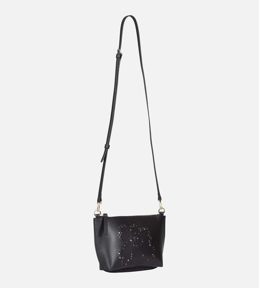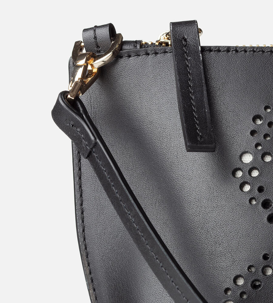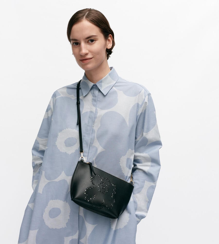 花をモチーフにしたUnikko柄をパンチングで表現したレザー ショルダーバッグ。スタイリッシュな雰囲気で持てるスリムなショルダーベルトはフック仕様で取り外しも可能。間口はファスナー開閉。内部はプリントで切り替え、愛らしい雰囲気を漂わせています。