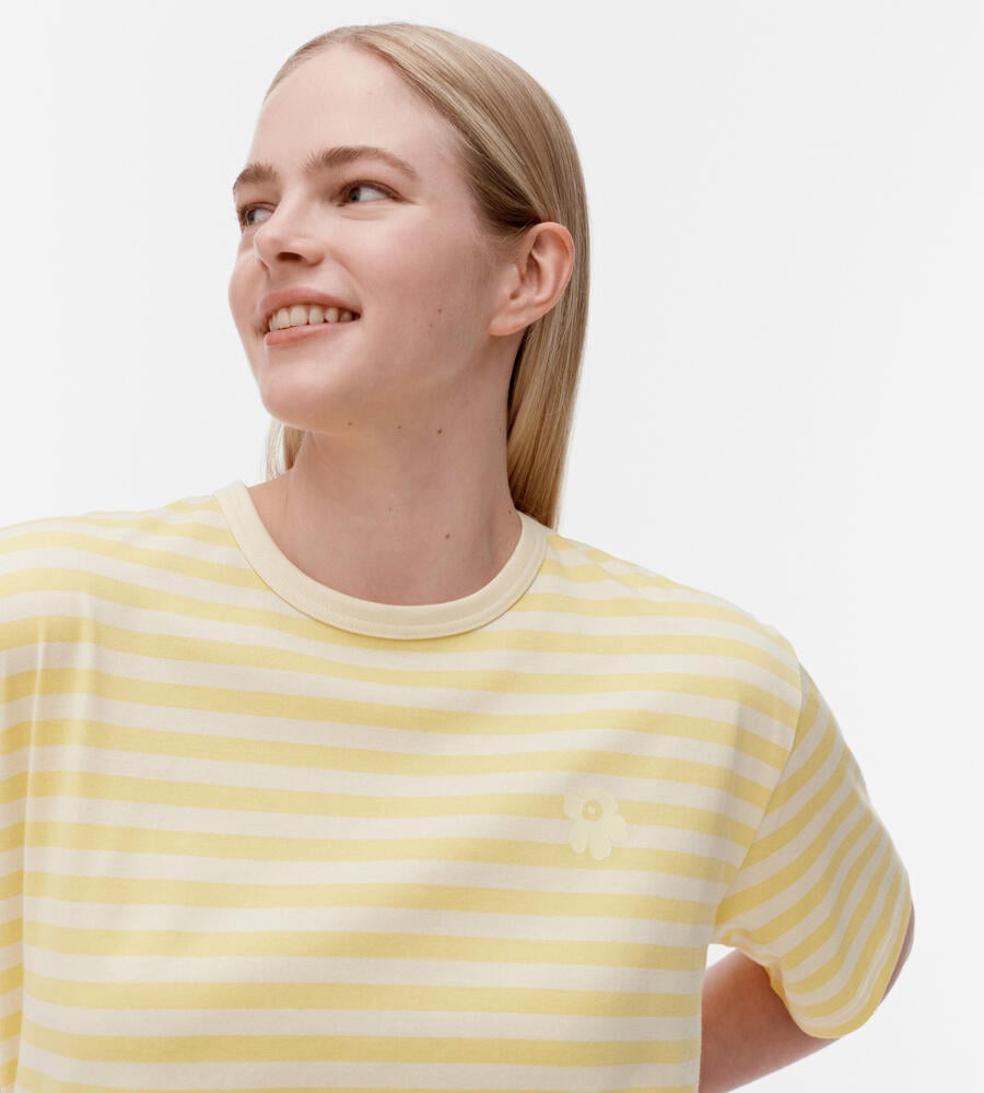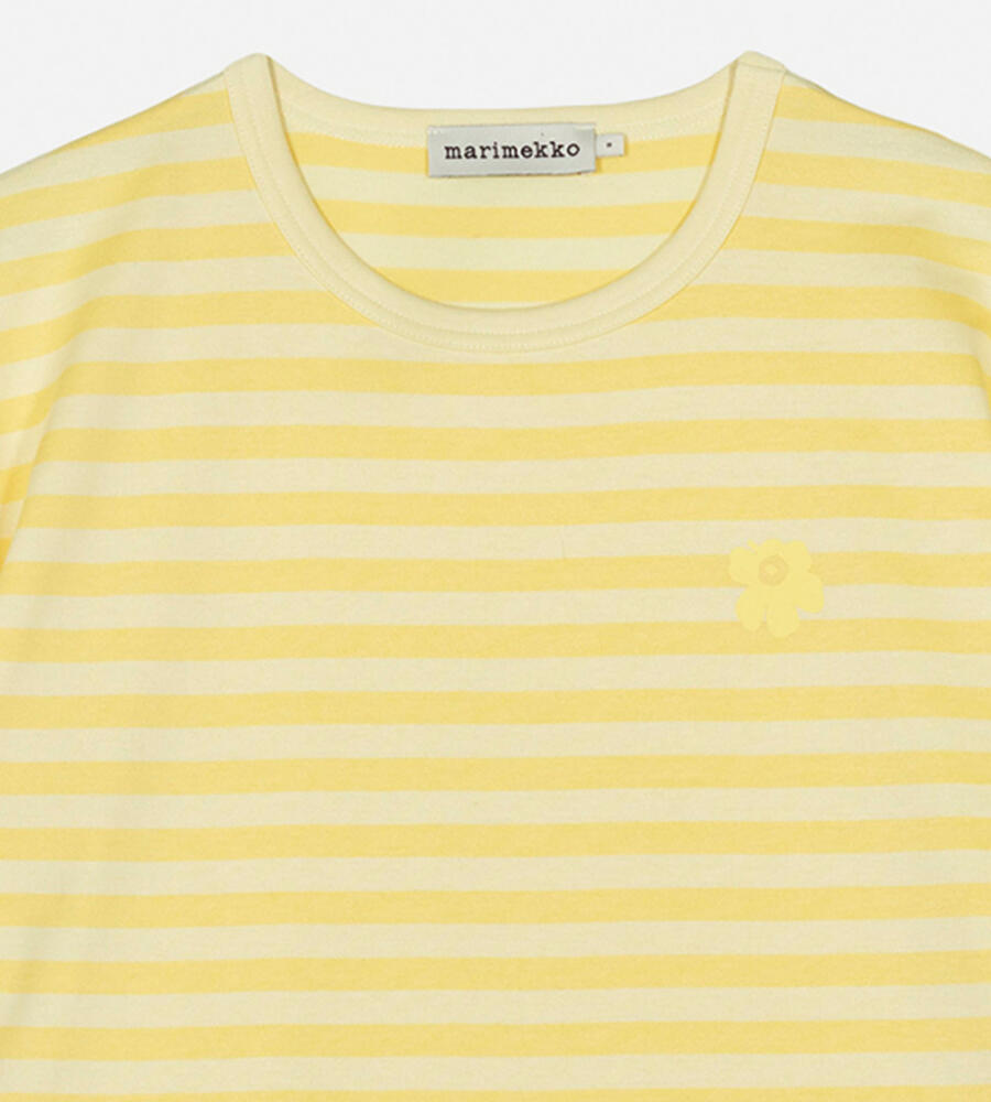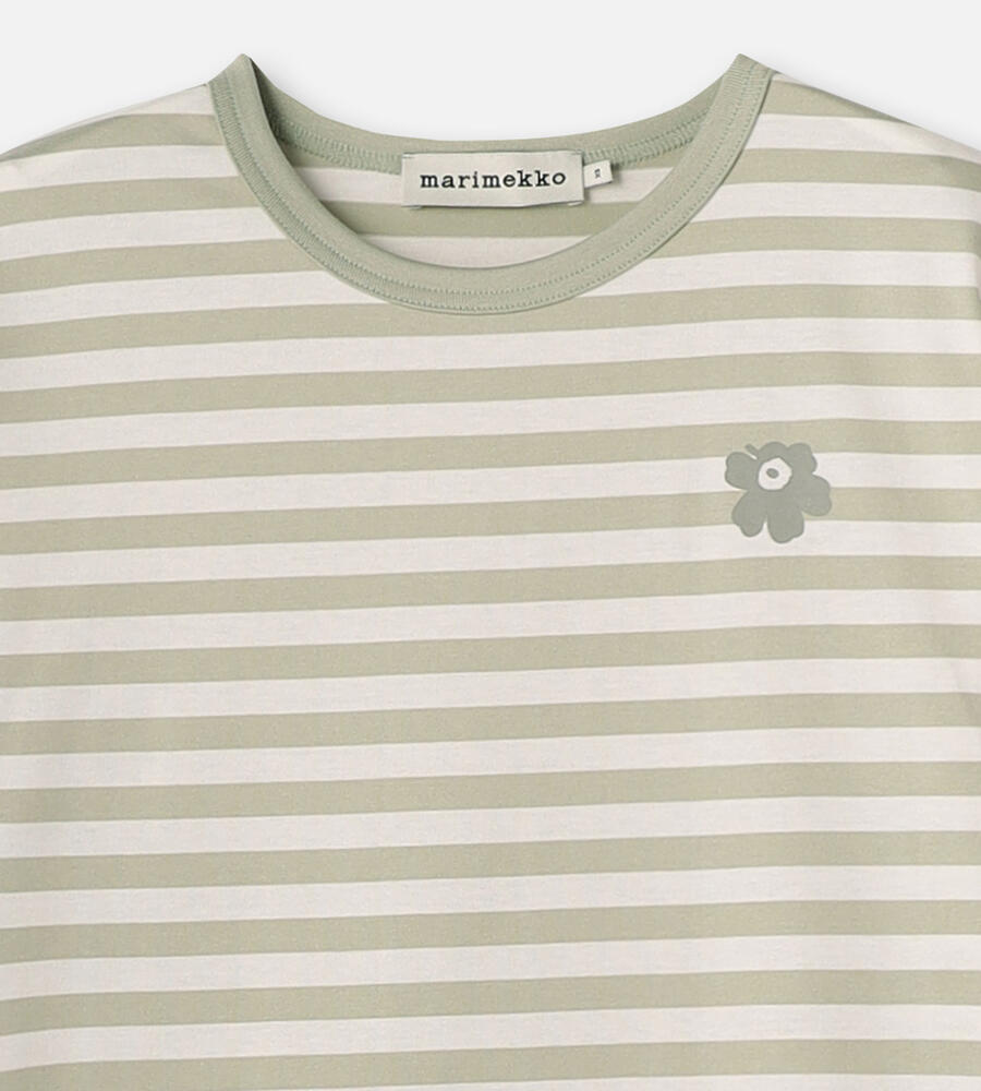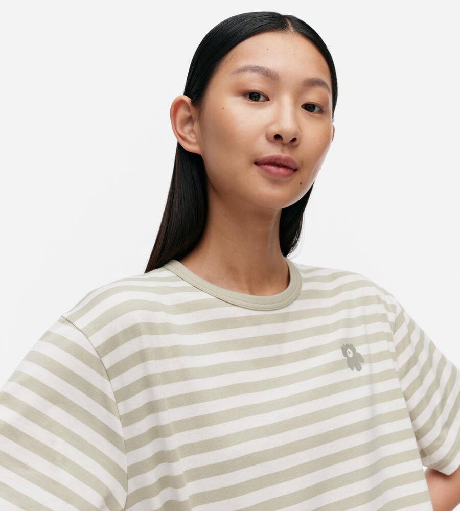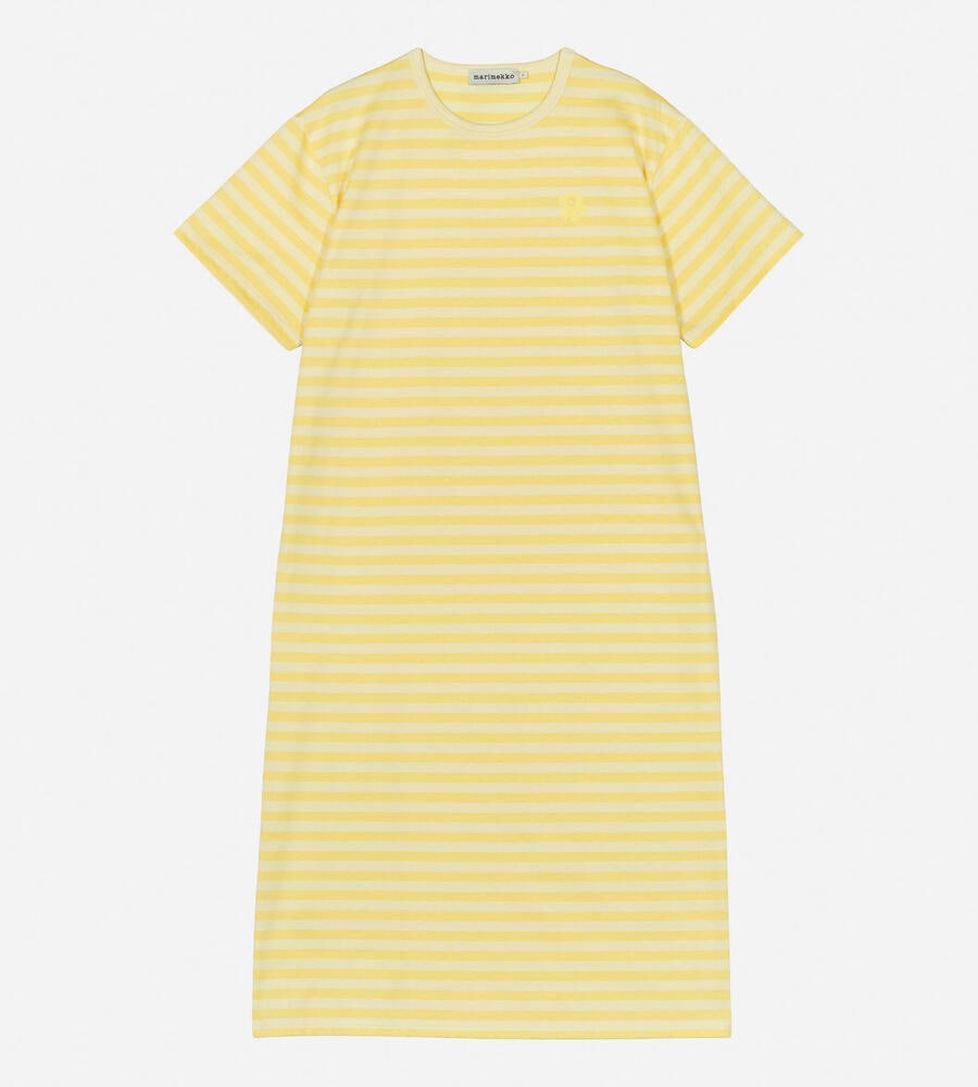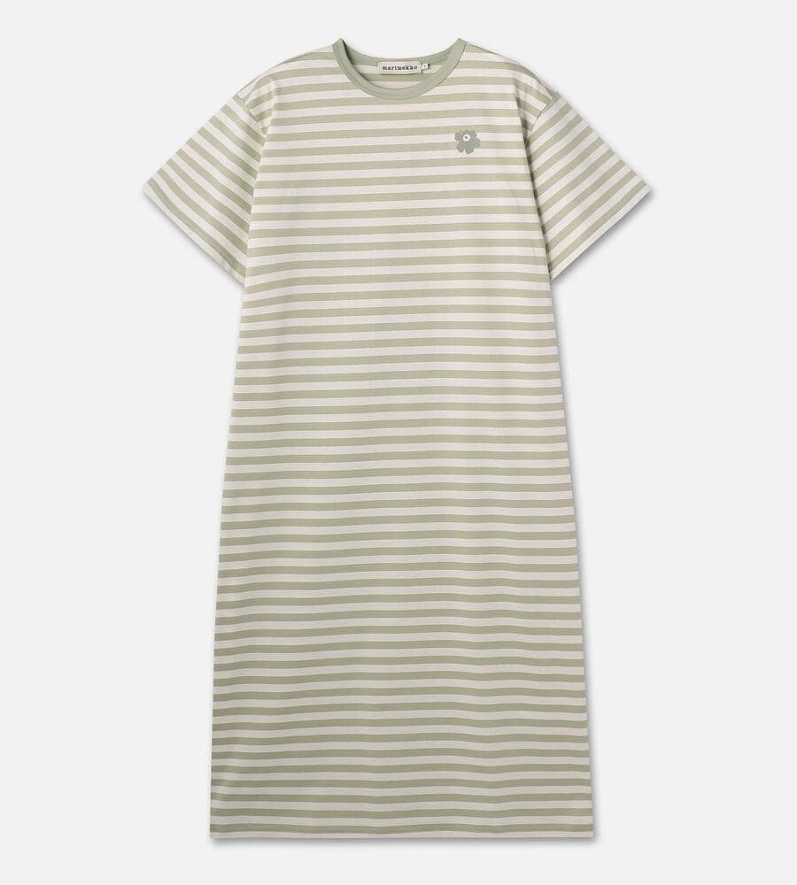 着こなしのアクセントになる細めのストライプ柄がさわやかなムードの半袖Tシャツワンピース。左胸にはMarimekkoを代表するUnikko柄のモチーフのワンポイントがスタイリッシュなアクセント。少しゆとりのあるリラックスフィットのシルエット。一枚で春夏シーズンらしいコーディネートが完成するアイテムです。