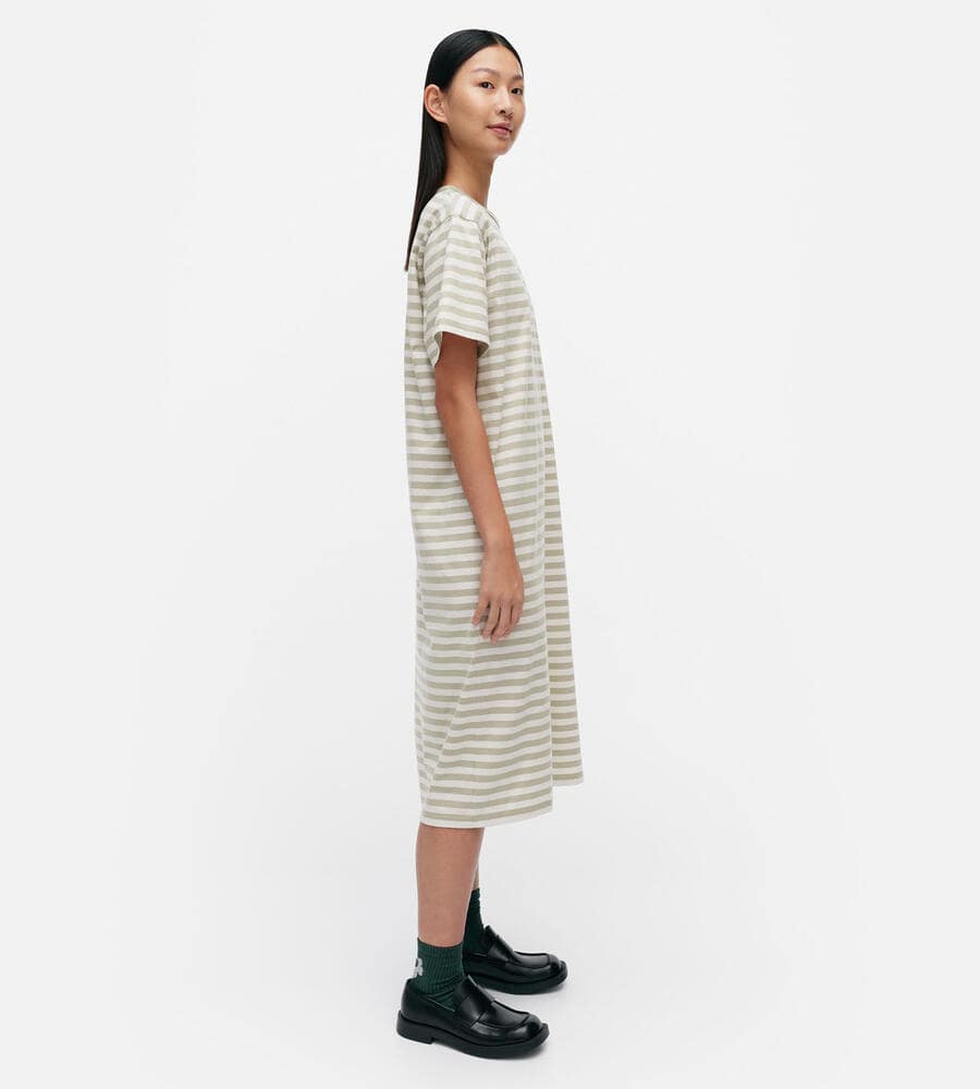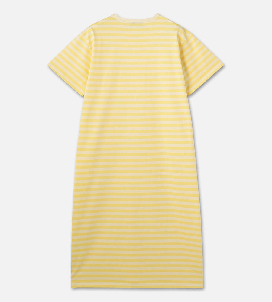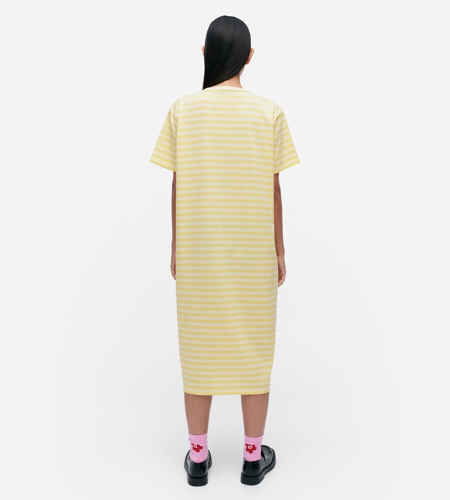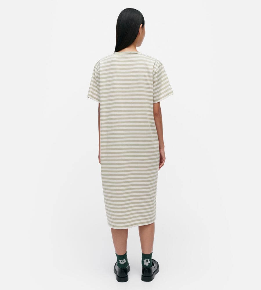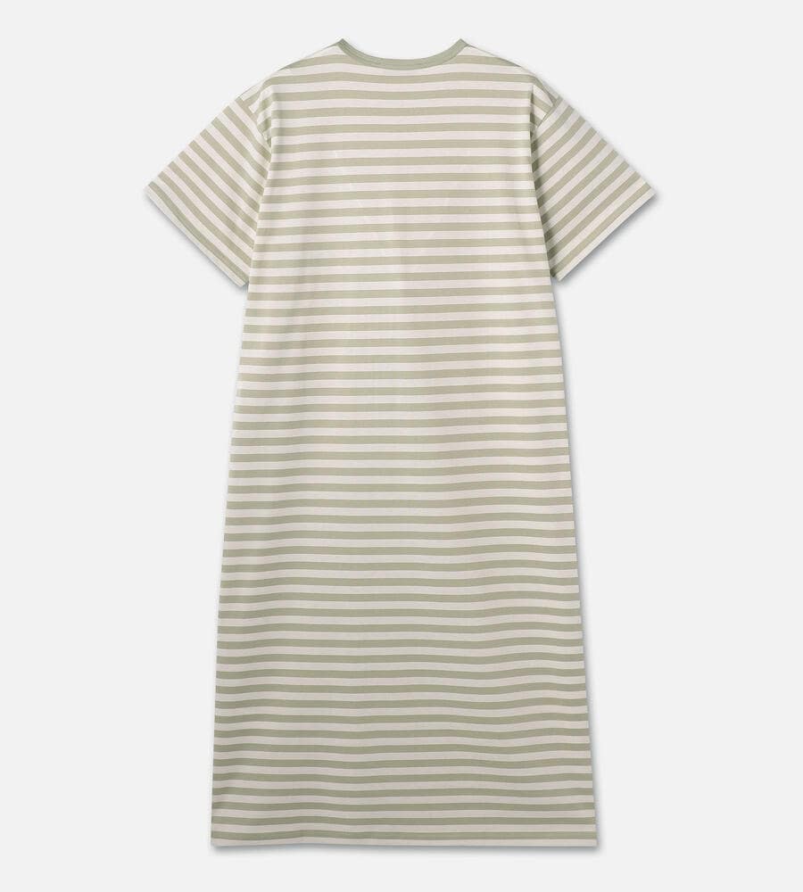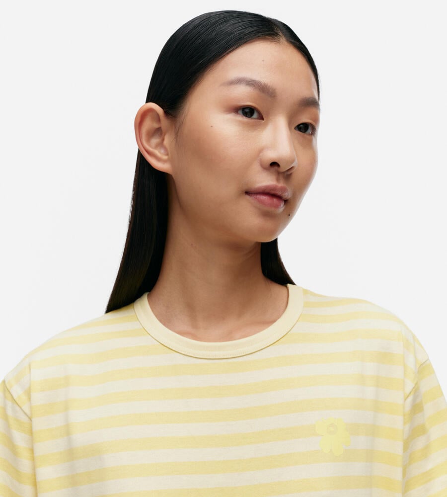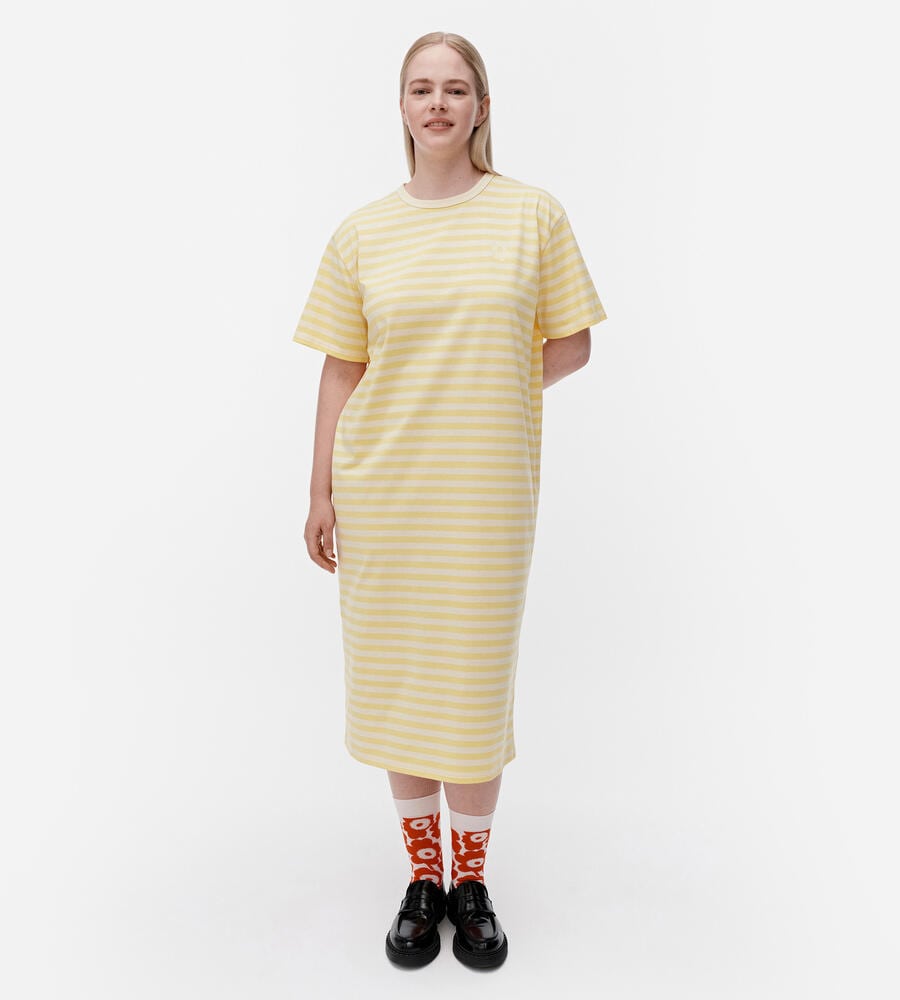 着こなしのアクセントになる細めのストライプ柄がさわやかなムードの半袖Tシャツワンピース。左胸にはMarimekkoを代表するUnikko柄のモチーフのワンポイントがスタイリッシュなアクセント。少しゆとりのあるリラックスフィットのシルエット。一枚で春夏シーズンらしいコーディネートが完成するアイテムです。