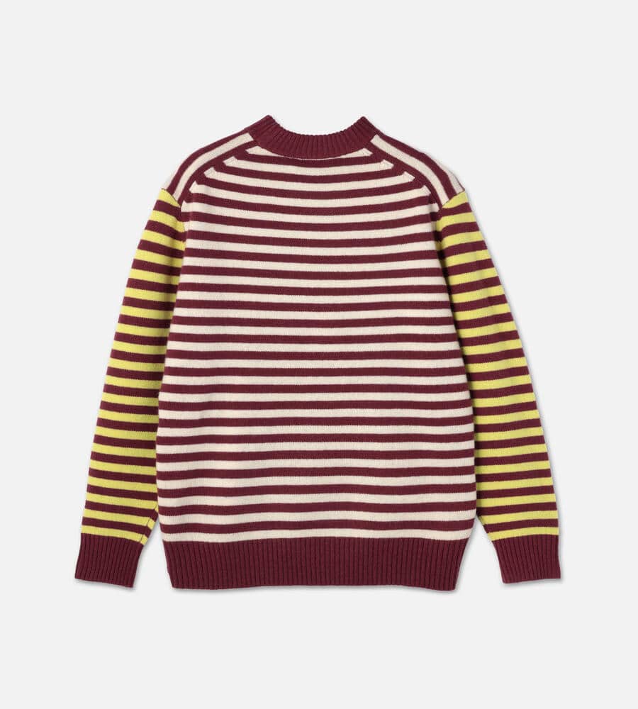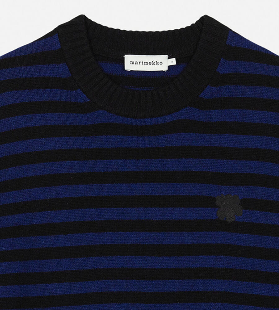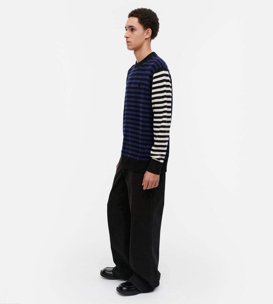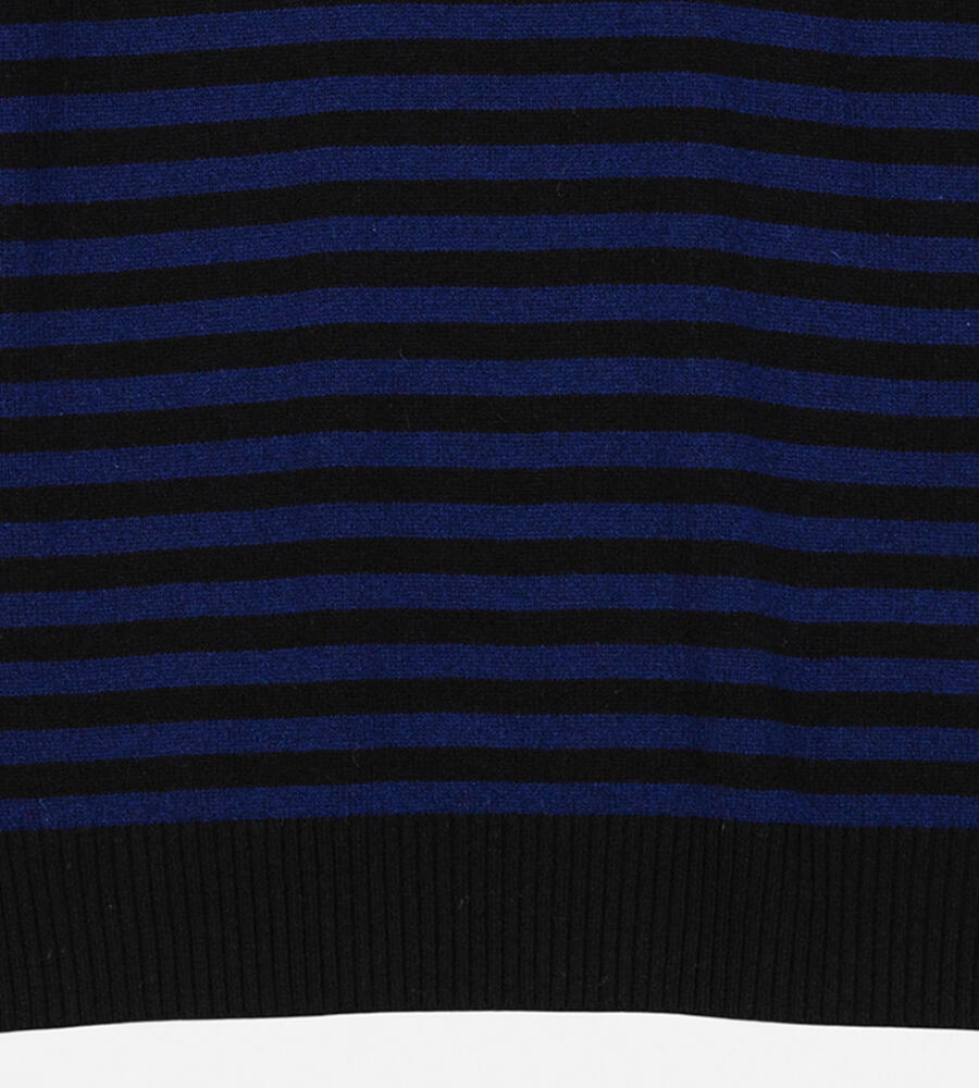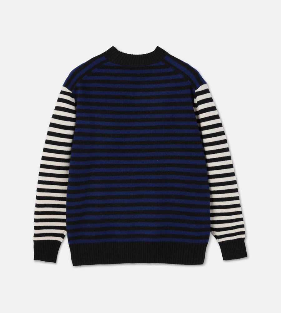 配色が異なる2種類のボーダーを組み合わせたニットプルオーバー。ピッチは揃えて、統一感を出しています。胸元にはモチーフのワンポイントをデザイン。肩線を少し落としてゆる感のあるシルエットに仕上げています。シンプルなデニムパンツや無地のチノパンとも相性が良く、デイリーカジュアルの主役にぴったりです。
