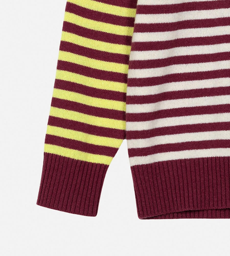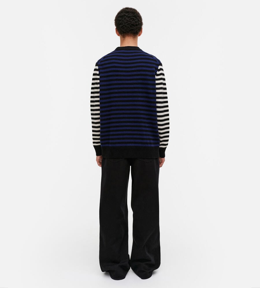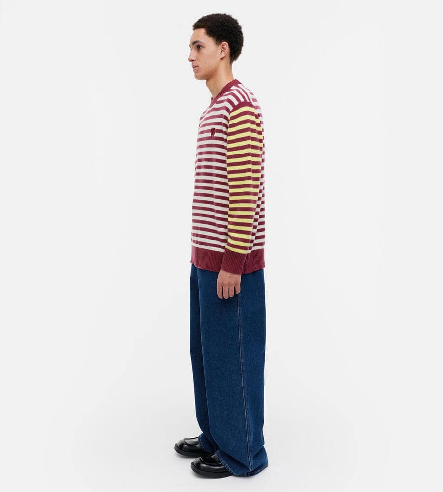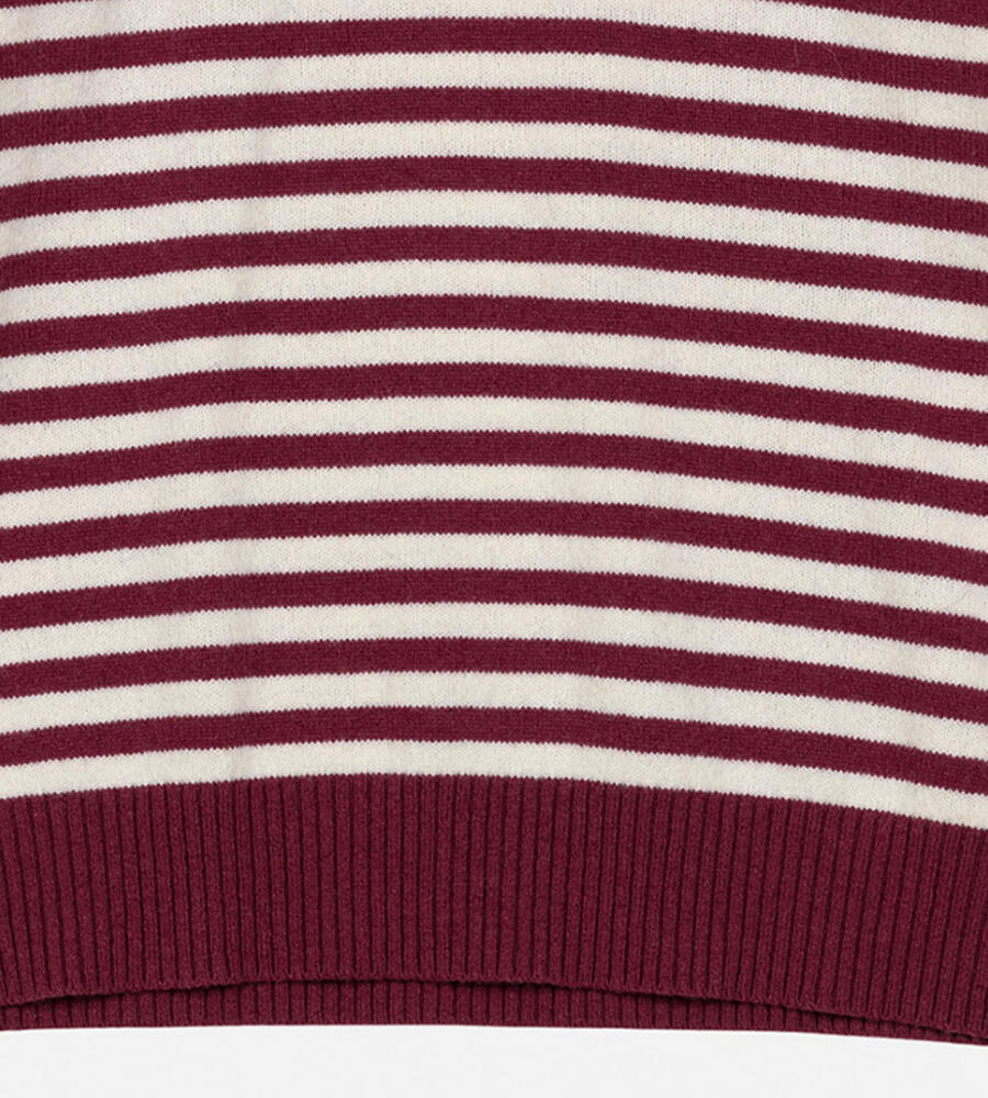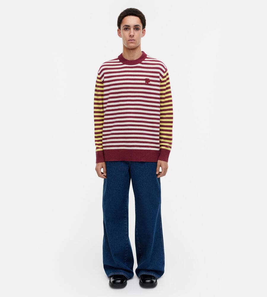 配色が異なる2種類のボーダーを組み合わせたニットプルオーバー。ピッチは揃えて、統一感を出しています。胸元にはモチーフのワンポイントをデザイン。肩線を少し落としてゆる感のあるシルエットに仕上げています。シンプルなデニムパンツや無地のチノパンとも相性が良く、デイリーカジュアルの主役にぴったりです。