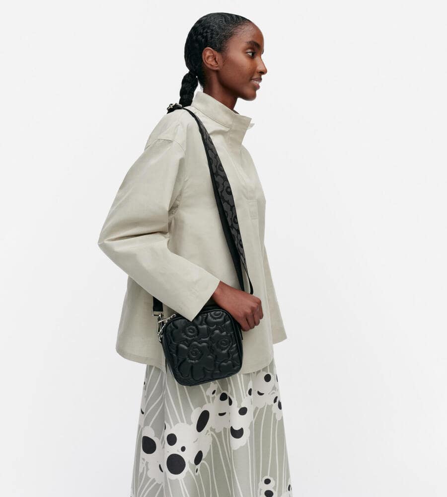 Unikko柄をユニークなキルティング仕立てで仕立てたショルダーバッグです。丸みを帯びたフォルムが、柄の愛らしさを引き立てます。スマートフォンやミニ財布などがすっきり収まるコンパクトなサイジング。レジャーやトラベルシーン等でも活躍するアイテムです。ショルダーストラップにも柄を配しているのもポイント。