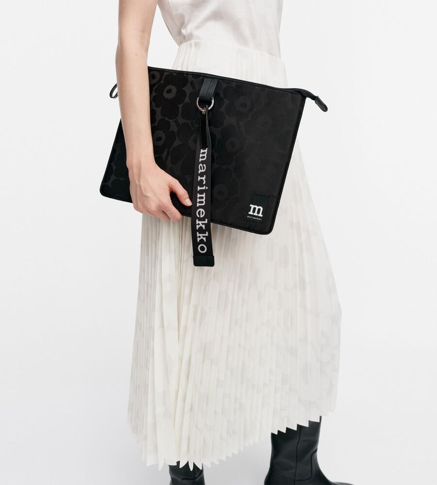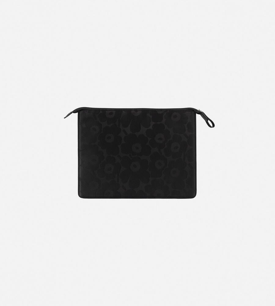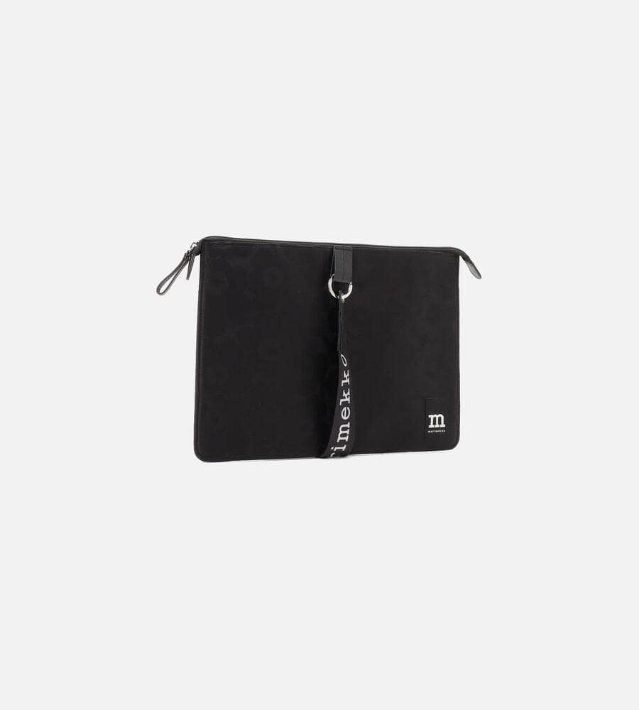 センターに添えたロゴ入りのストラップがスタイリッシュなラップトップPC用ケース。シンプルながらも大人にふさわしい、モダンな感性が光るアイテムです。フロントには織りで表現したUnikko柄を用いて、ブランドらしさをアピール。トップはジップで大きく開くため、PCの出し入れも容易に行えます。