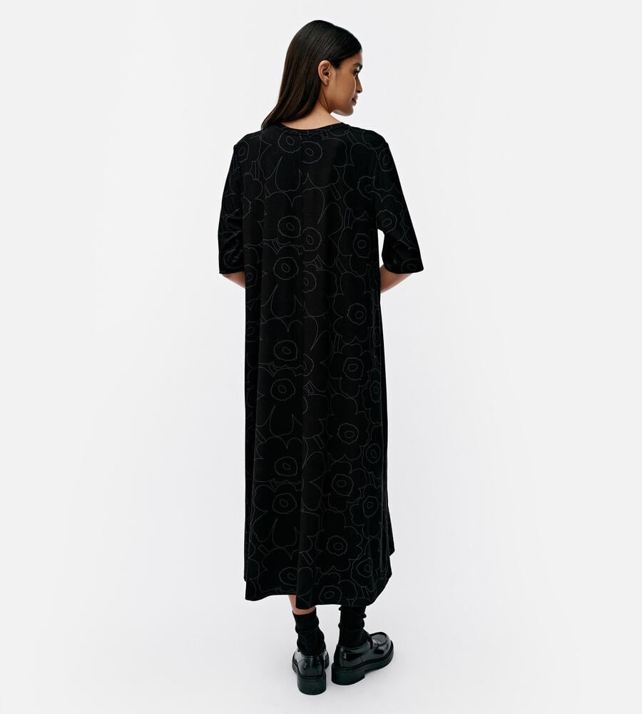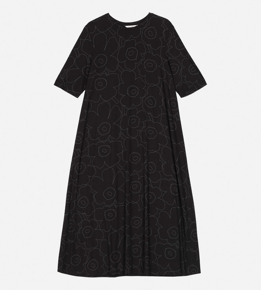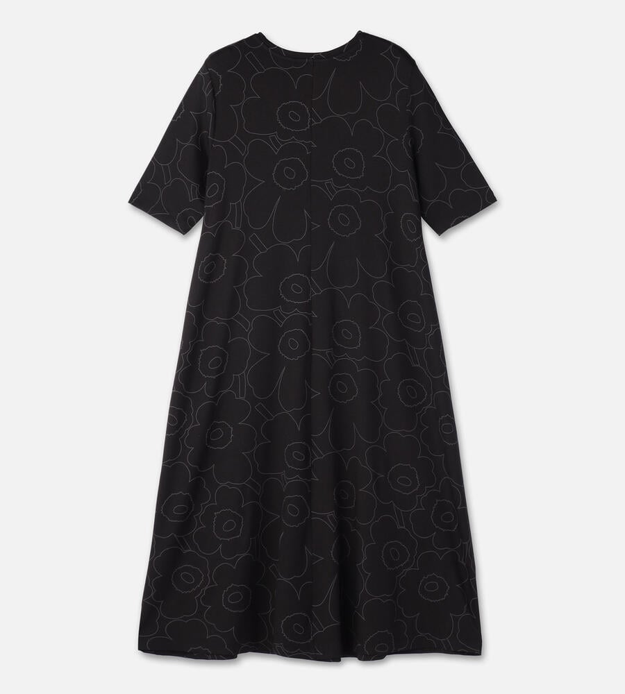 Unikkoパターンのグラフィカルなラインを強調したPiirto Unikko柄ロングワンピース。腕まわりをカバーするハーフスリーブ。やわらかな素材感で着心地が良く、裾に向かってゆるやかに広がるフレアラインからコンフォートなムードが漂います。