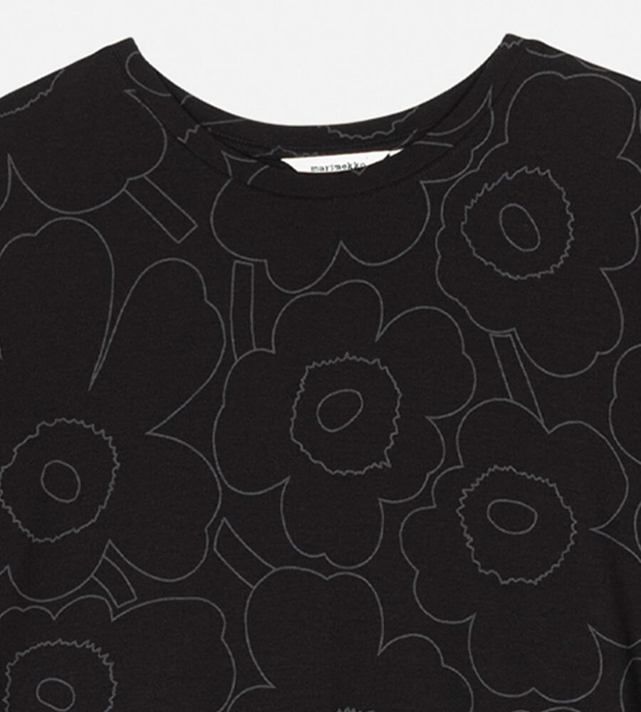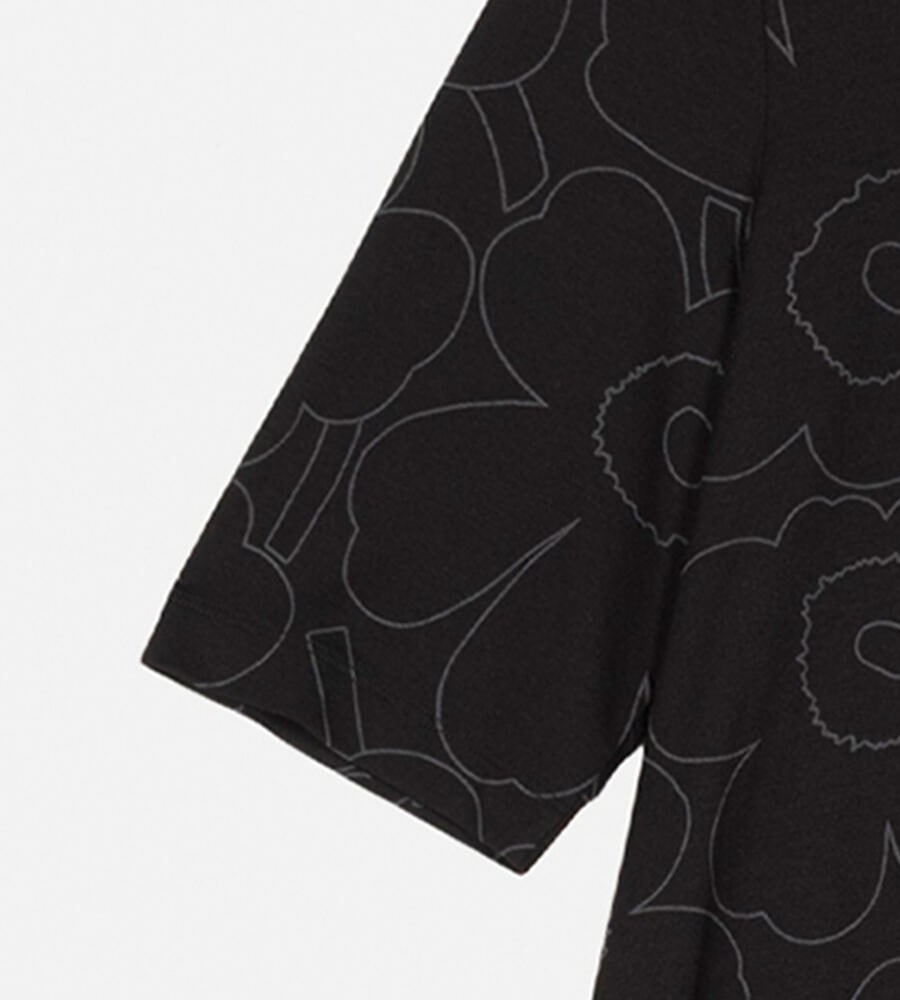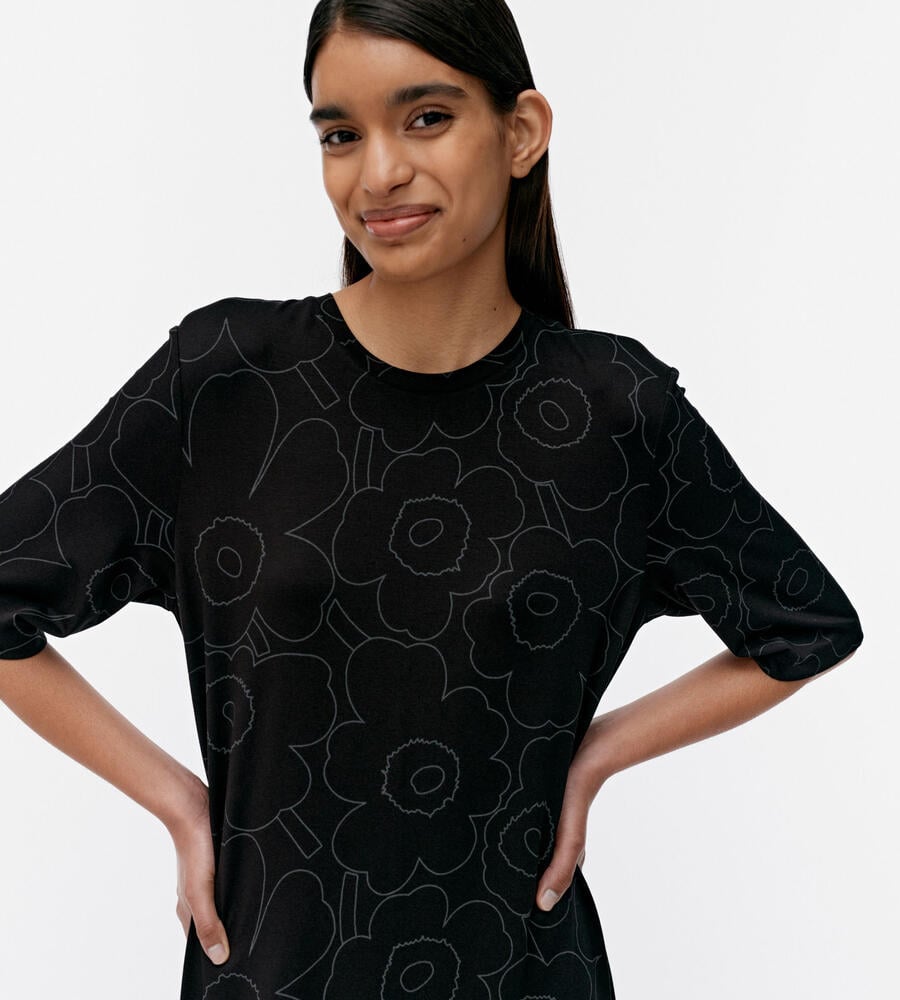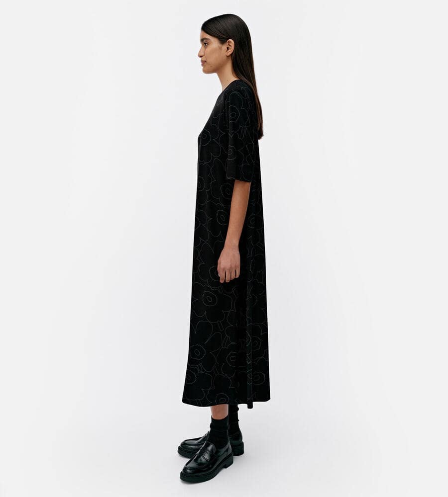 Unikkoパターンのグラフィカルなラインを強調したPiirto Unikko柄ロングワンピース。腕まわりをカバーするハーフスリーブ。やわらかな素材感で着心地が良く、裾に向かってゆるやかに広がるフレアラインからコンフォートなムードが漂います。