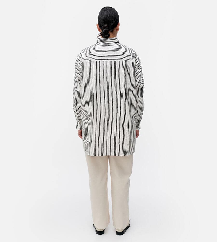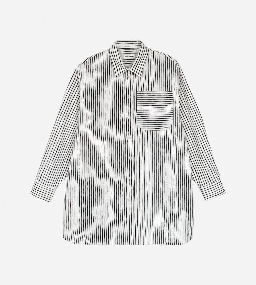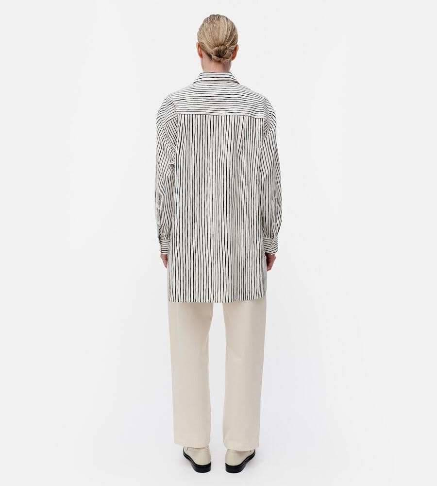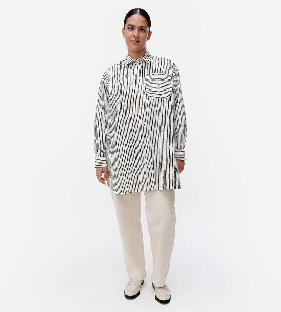 フェンスをモチーフにしたAitaパターンのボタンアップシャツ。オーガニックコットンのシャンブレー素材で作られており、オーバーサイズのシルエットがリラックスしたムードを演出。左胸には大きめのパッチポケットを配置し、サイドには深めのスリットがほどこされています。