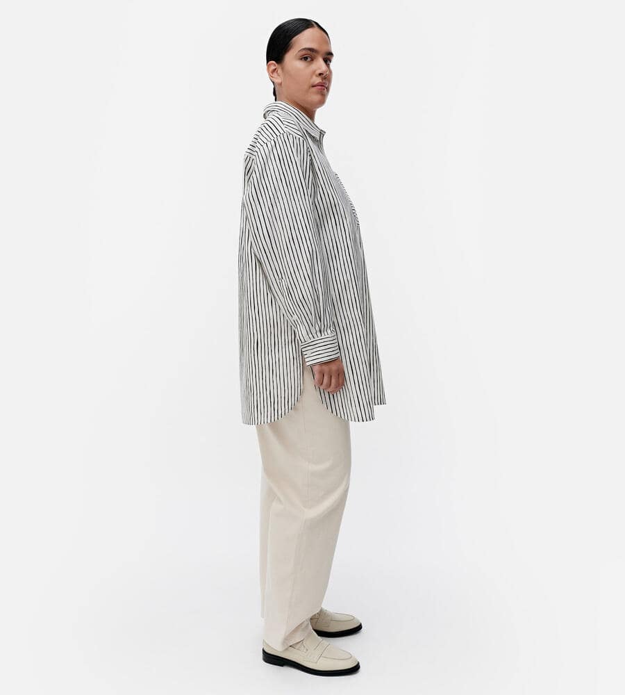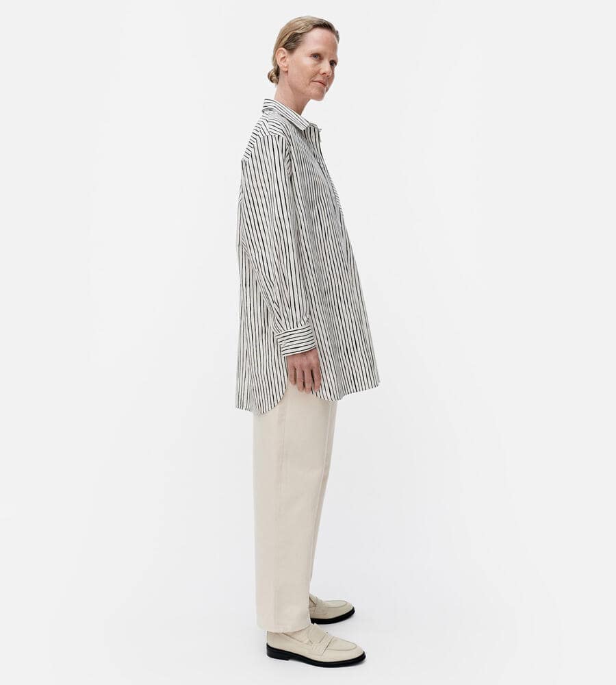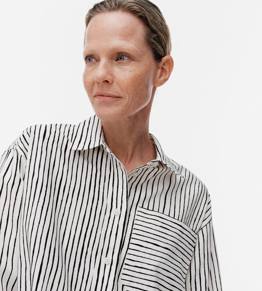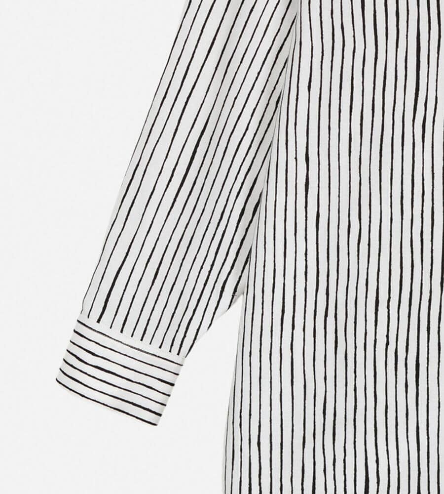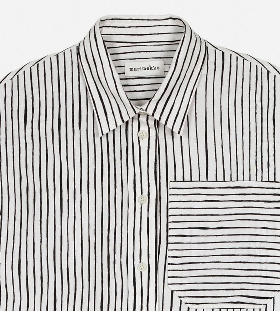 フェンスをモチーフにしたAitaパターンのボタンアップシャツ。オーガニックコットンのシャンブレー素材で作られており、オーバーサイズのシルエットがリラックスしたムードを演出。左胸には大きめのパッチポケットを配置し、サイドには深めのスリットがほどこされています。