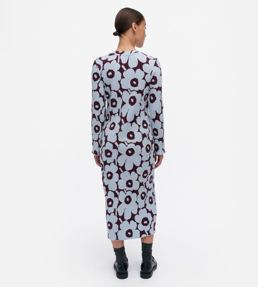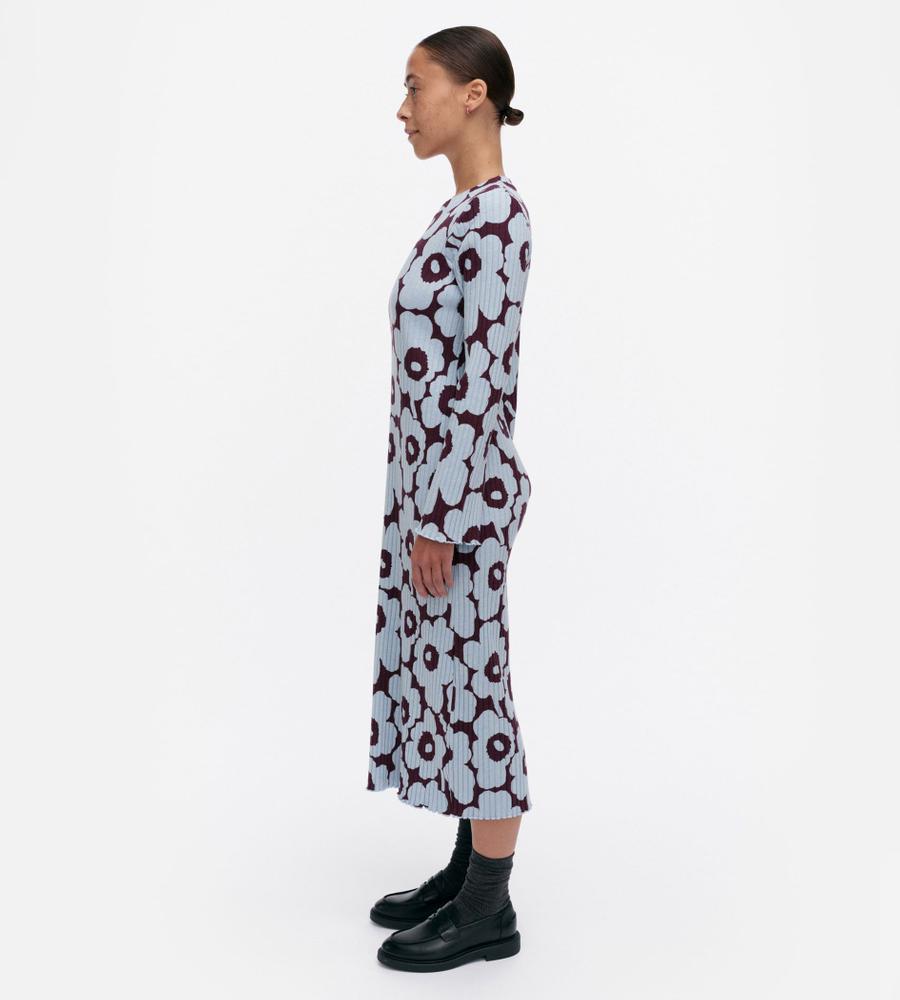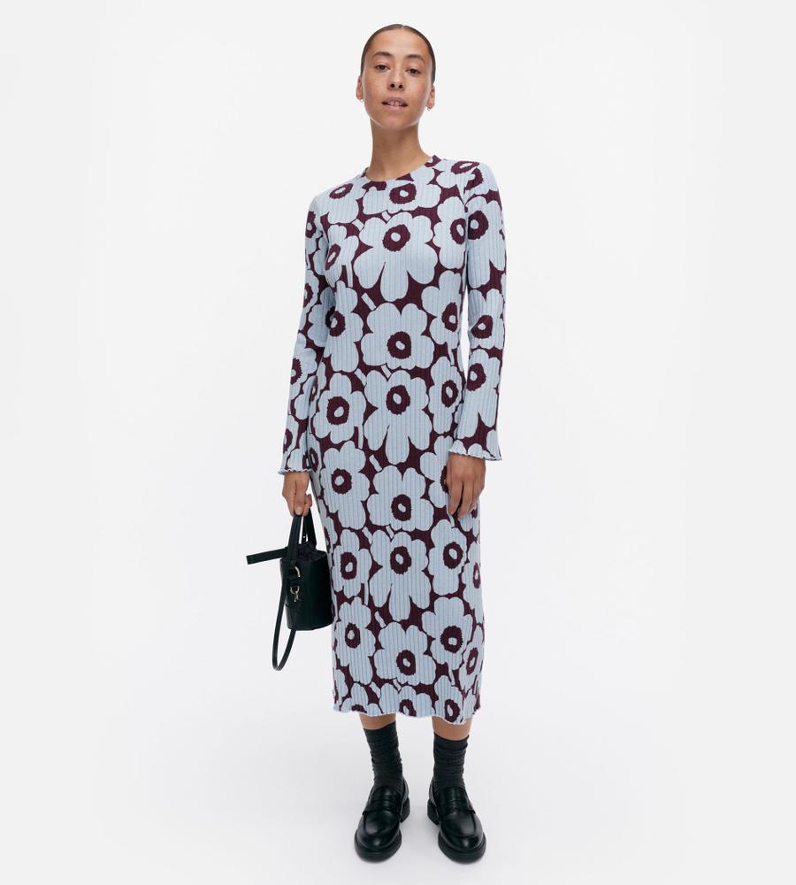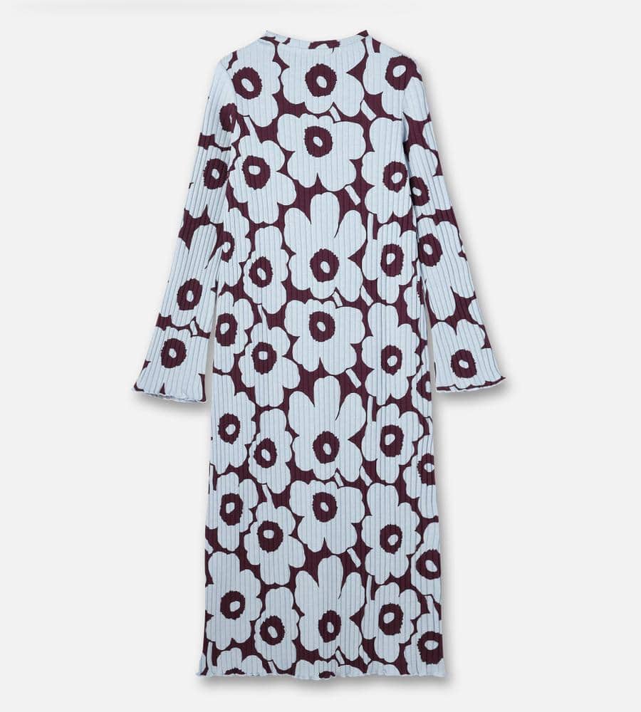 Unikko柄が全面にプリントされた華やかなロング丈ワンピース。スリムでストレートなフィット感が特徴です。Oネックで、袖口に向かって広がるフレアな袖がエレガントなポイント。細くロールアップされた袖口と裾もデザインポイント。一枚でスタイリッシュなお出かけコーディネートが完成するアイテムです。