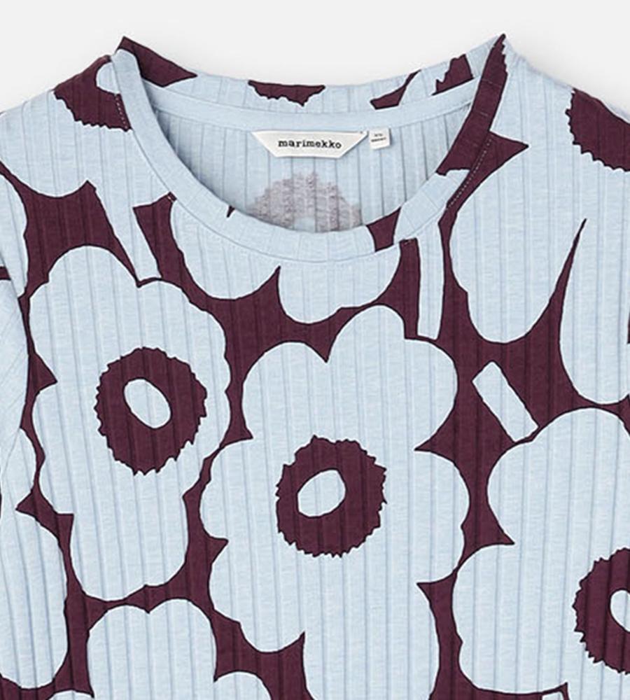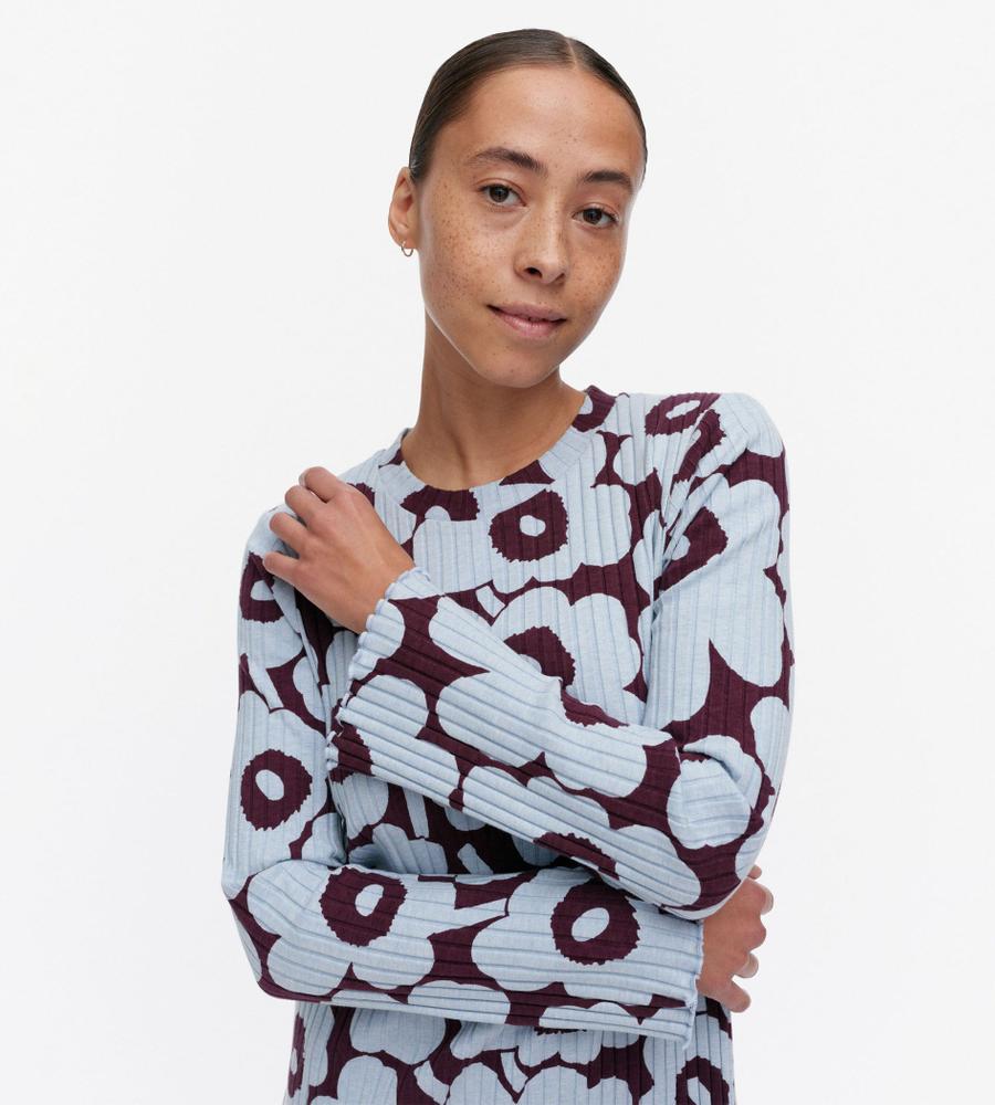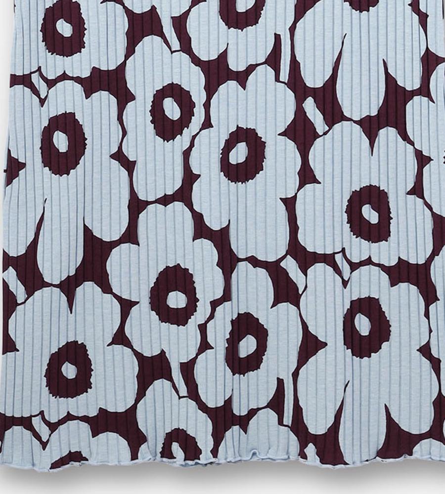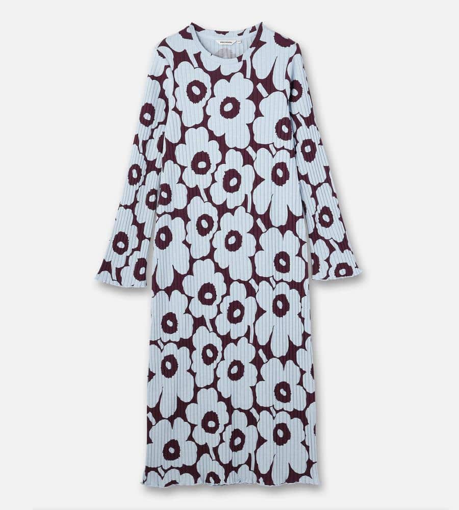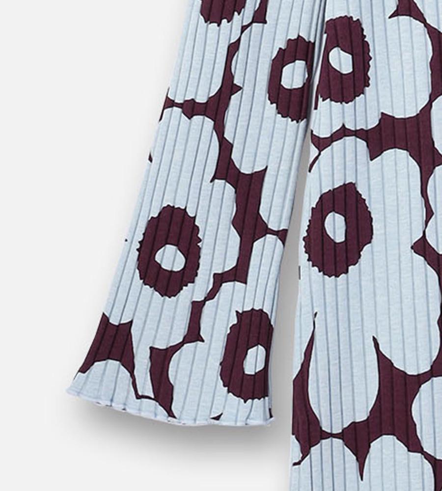 Unikko柄が全面にプリントされた華やかなロング丈ワンピース。スリムでストレートなフィット感が特徴です。Oネックで、袖口に向かって広がるフレアな袖がエレガントなポイント。細くロールアップされた袖口と裾もデザインポイント。一枚でスタイリッシュなお出かけコーディネートが完成するアイテムです。