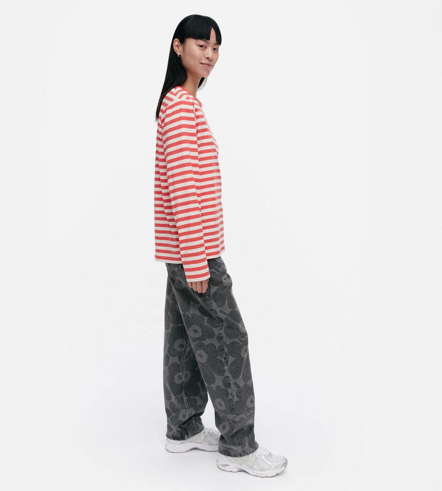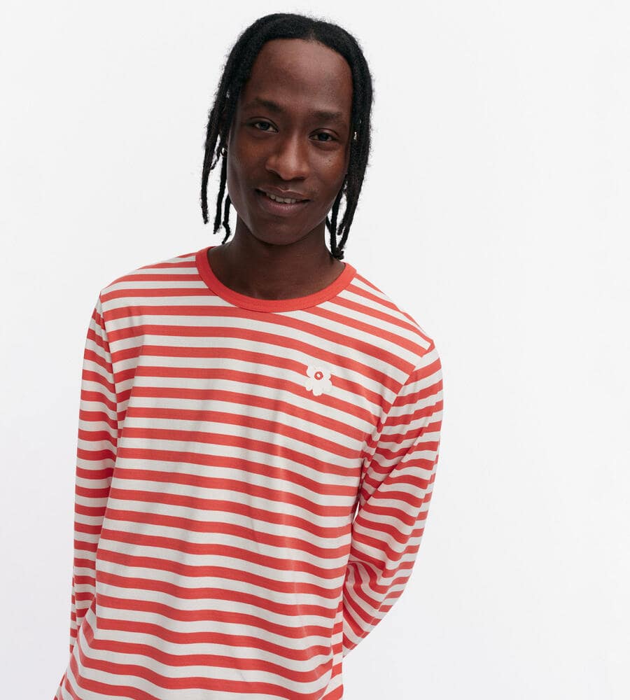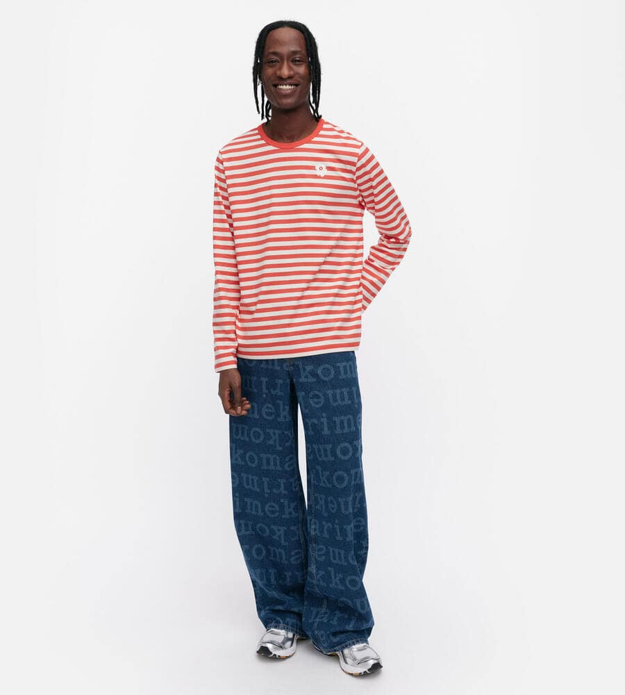 肌当たりのよいコットンの天竺素材を用いたカットソーです。ボーダー柄の胸元にUnikko柄のプリントを配しているのが、ブランドならではの遊び心あるアクセント。ゆったりとしたサイジングで、性別を問わずにお楽しみいただけるアイテムです。ジャケットなどのインナーとしても活躍します。