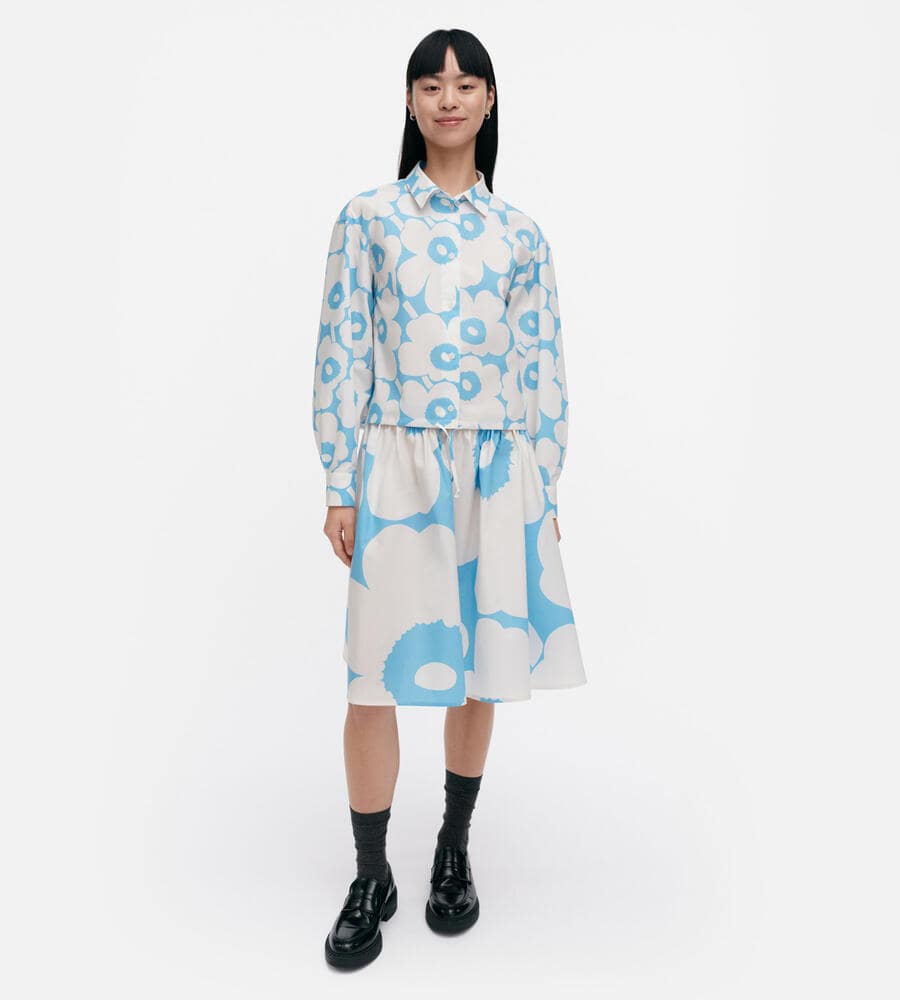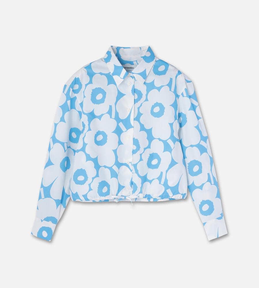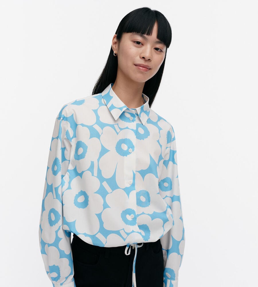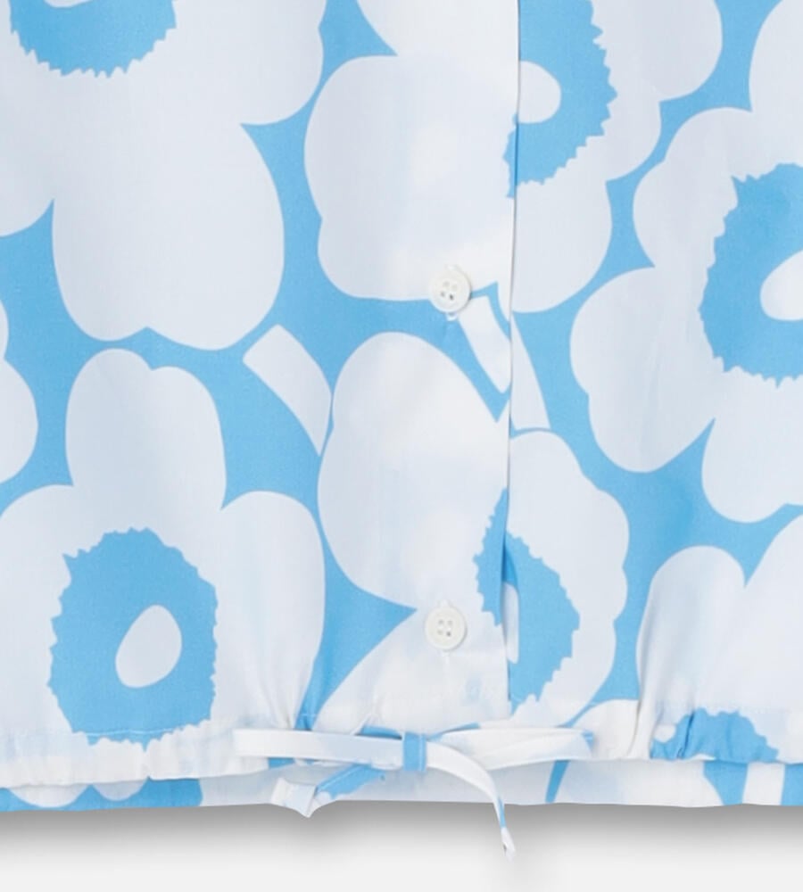 ハリと仄かな透け感を併せ持つコットン素材を用いたブラウス。白と青の爽やかな配色で目を楽しませてくれるUnikko柄を採用しています。身幅にゆとりがありつつ、着丈は短め。ドローコードでふんわりと裾を絞るアレンジも可能です。ワイドなシルエットのボトムスなどを合わせても、メリハリのあるスタイリングを楽しめます。