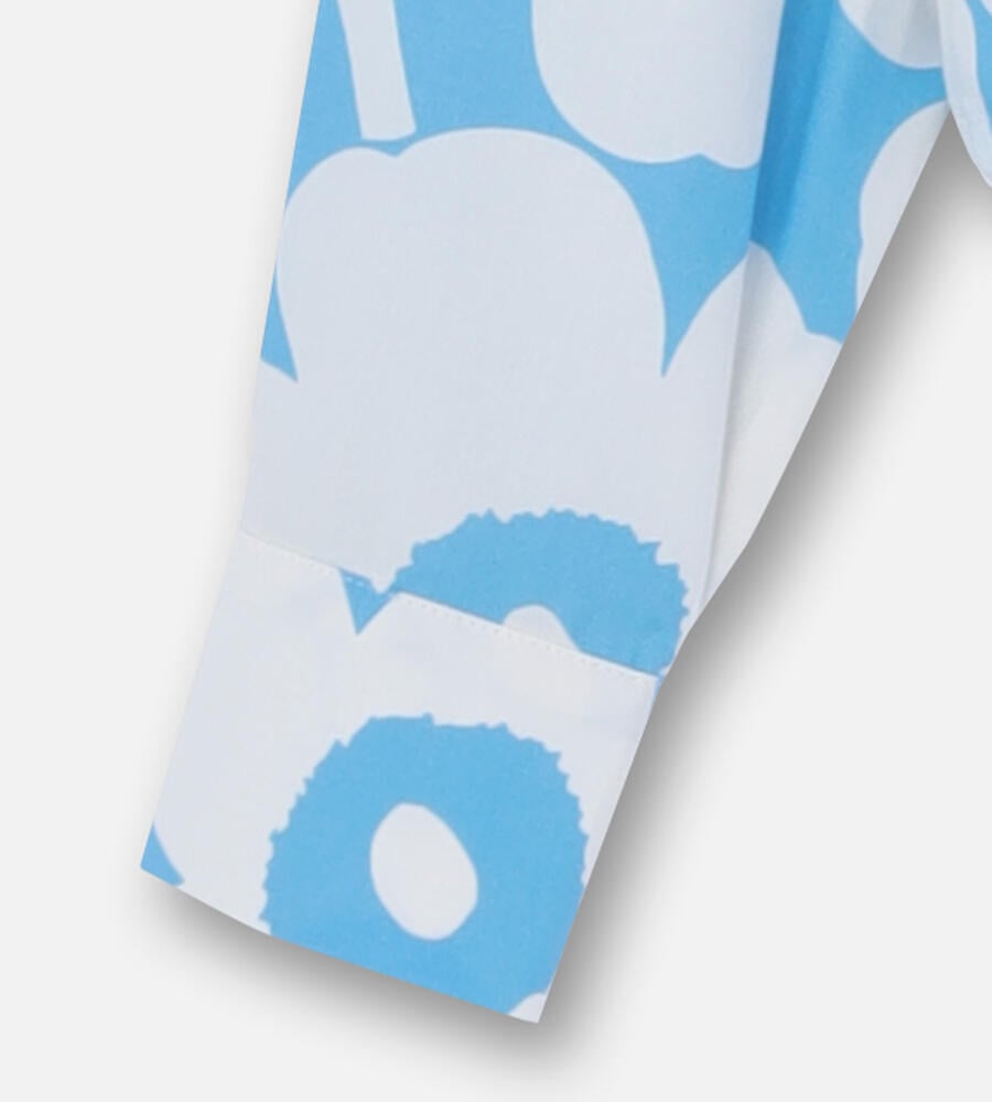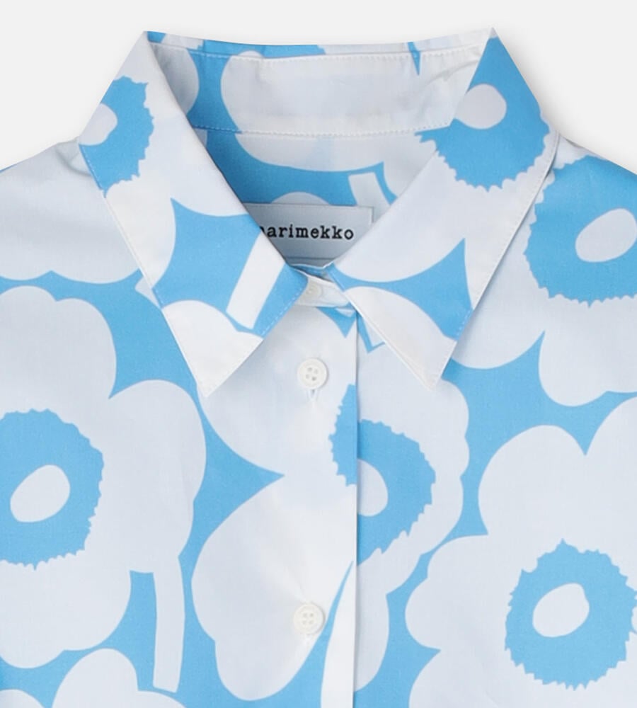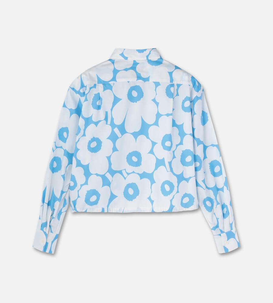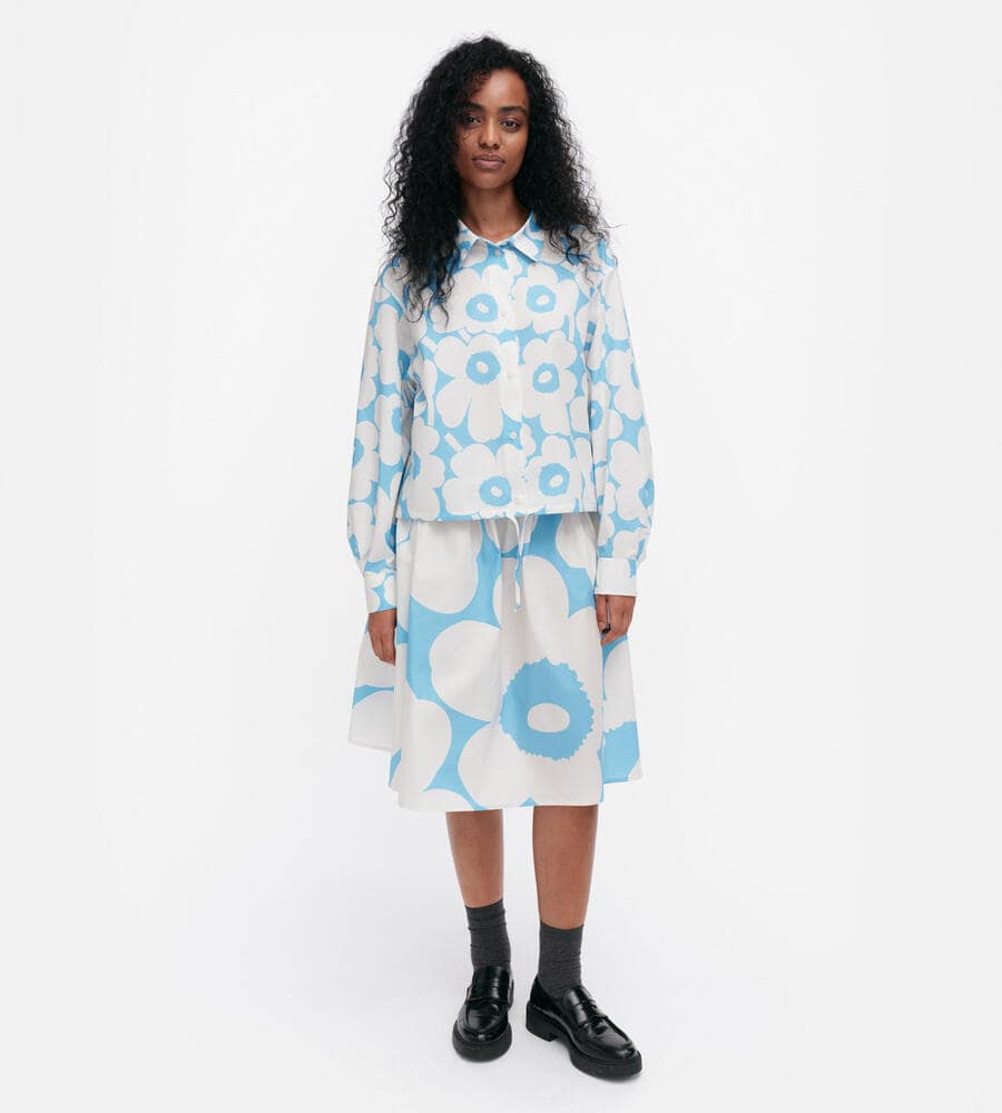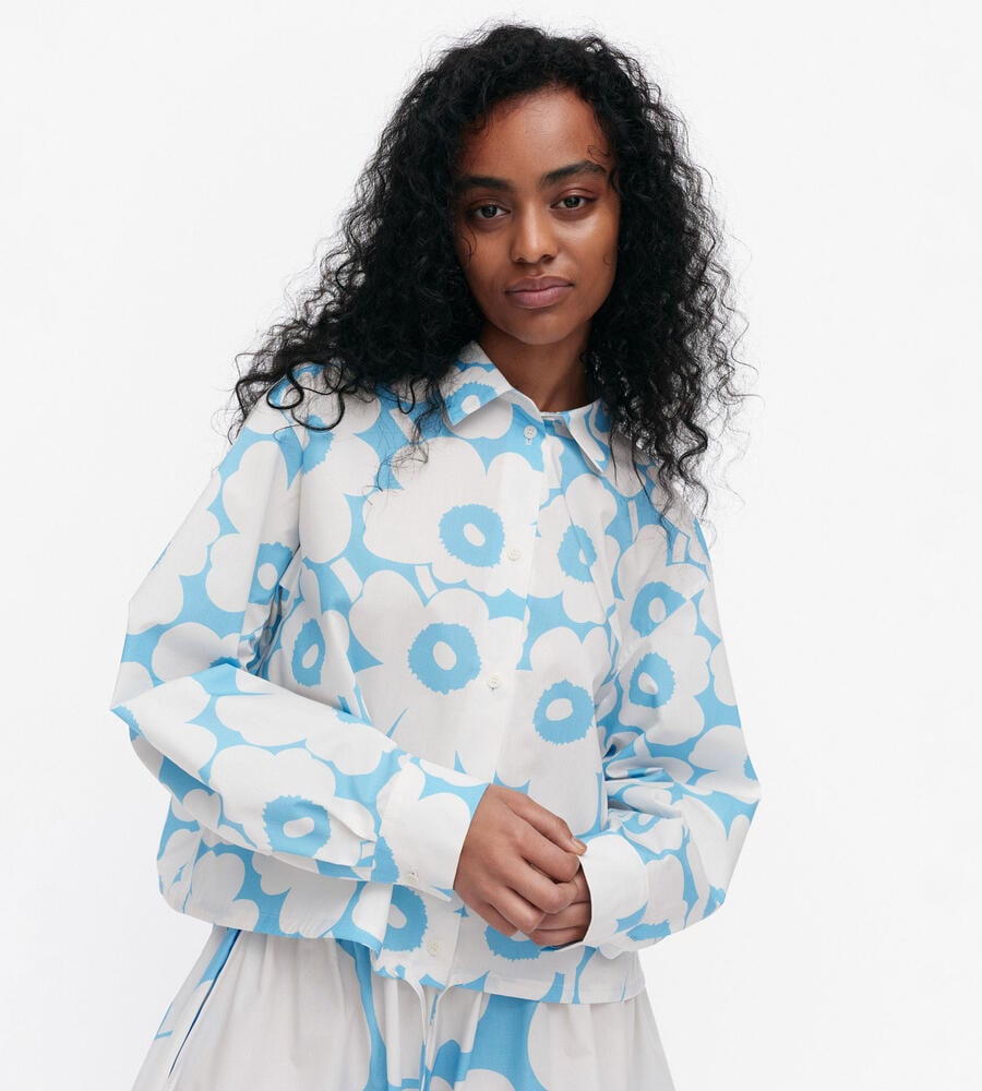 ハリと仄かな透け感を併せ持つコットン素材を用いたブラウス。白と青の爽やかな配色で目を楽しませてくれるUnikko柄を採用しています。身幅にゆとりがありつつ、着丈は短め。ドローコードでふんわりと裾を絞るアレンジも可能です。ワイドなシルエットのボトムスなどを合わせても、メリハリのあるスタイリングを楽しめます。
