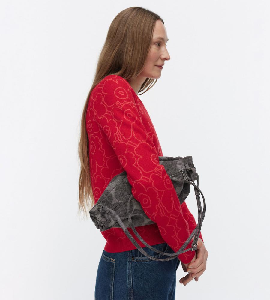 両サイドにタックを入れた、ユニークなフォルムのショルダーバッグ。荷物をいれると膨らみ、檸檬のような愛らしいシルエットになります。カジュアルに持てるデニム生地には、Marimekkoの代表的テキスタイルでもある「Unikko」柄が施されているのが特徴です。華奢なショルダーストラップは、長さの調節が可能。開閉のしやすいファスナートップです。