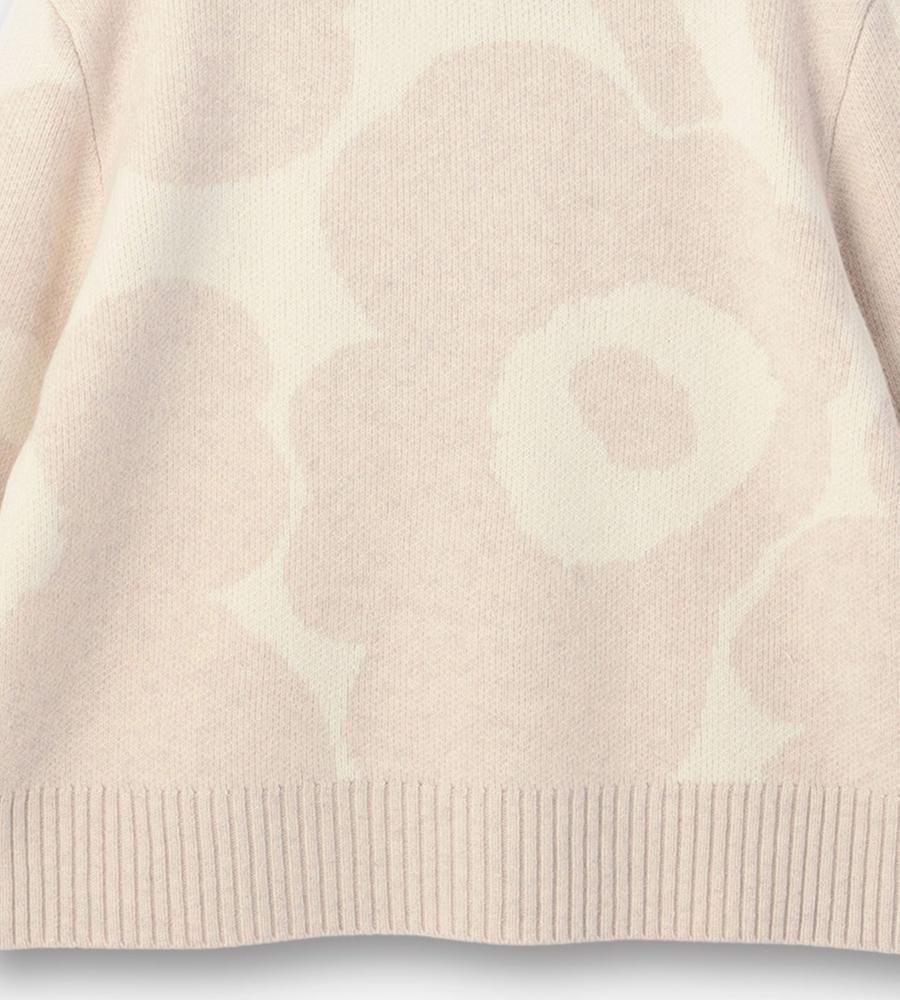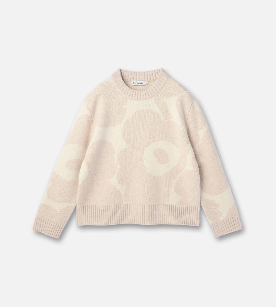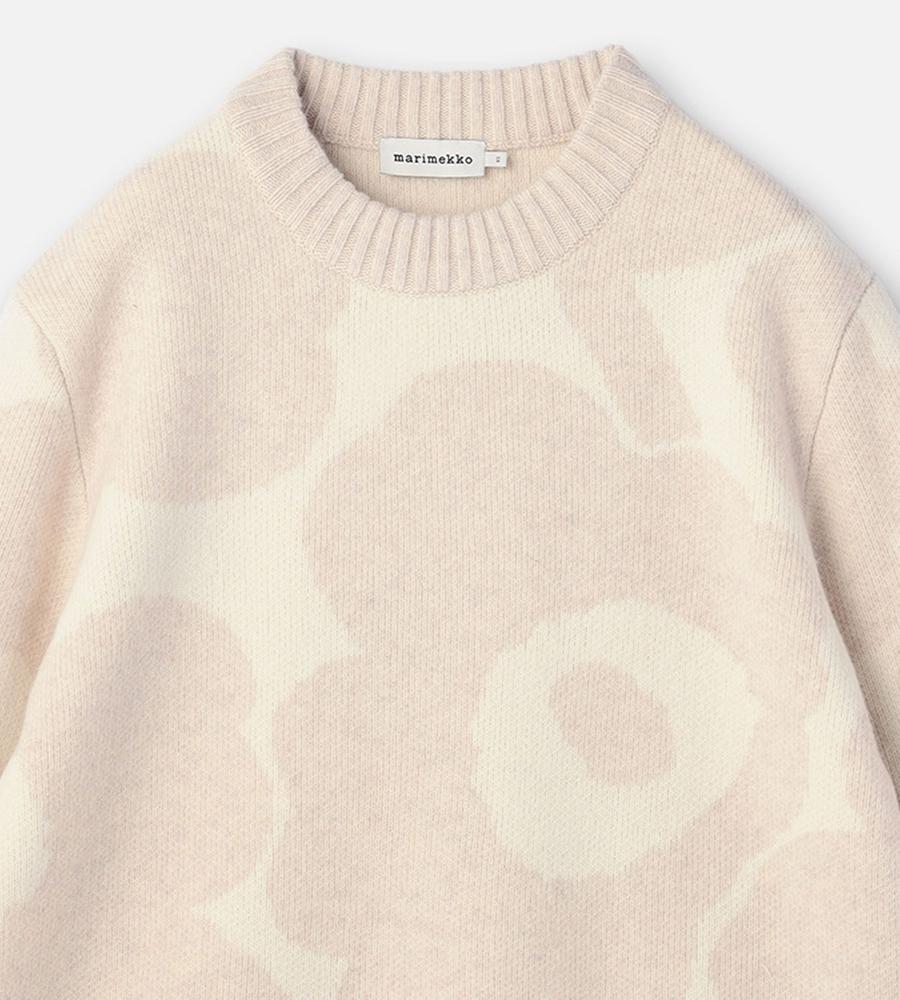 大ぶりなUnikko柄をあしらったクルーネックニットプルオーバー。ライトブラウン×グレーの配色が、落ち着いた雰囲気の中にもさりげなく個性を主張します。シルエットはややリラックス感のある仕上がりで、首元、袖口、裾部分はリブ仕様に。素材は上質で暖かな毛100%を使用しています。