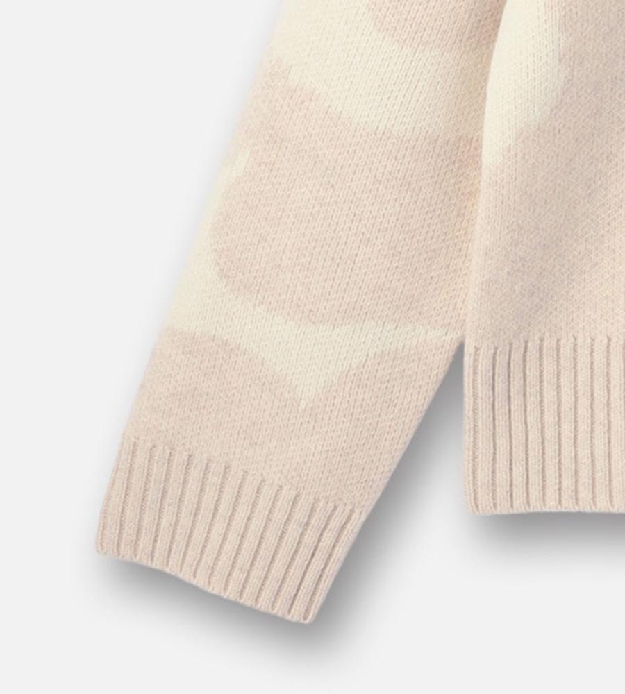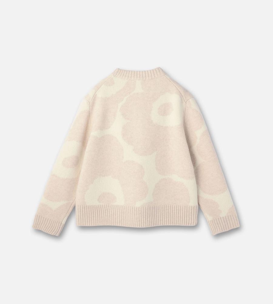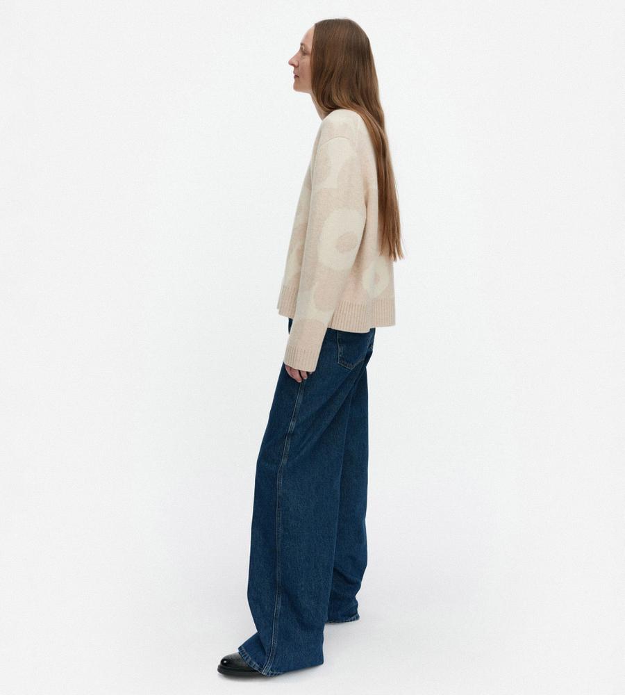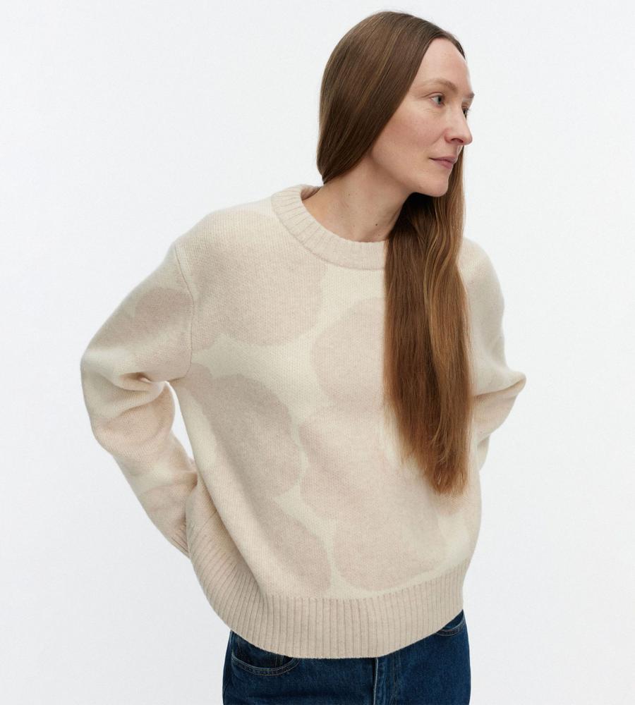 大ぶりなUnikko柄をあしらったクルーネックニットプルオーバー。ライトブラウン×グレーの配色が、落ち着いた雰囲気の中にもさりげなく個性を主張します。シルエットはややリラックス感のある仕上がりで、首元、袖口、裾部分はリブ仕様に。素材は上質で暖かな毛100%を使用しています。