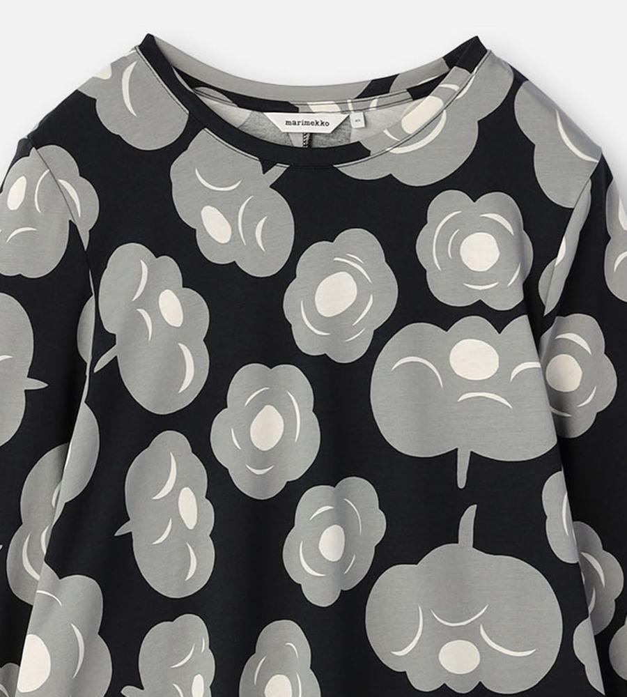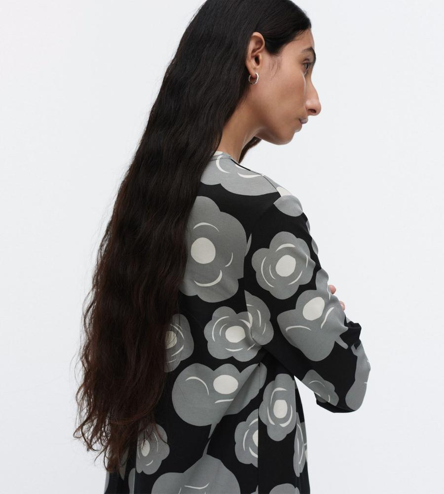 モード感の漂うお花柄のワンピース。歩くたびに揺れる裾が、フェミニンな気分を盛り上げてくれそう。リラックスした気分で過ごしたい日にもおすすめの一枚です。