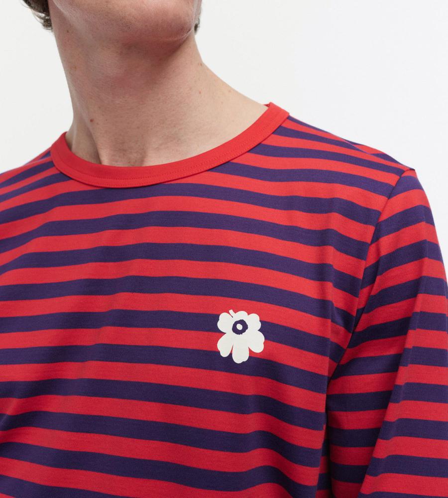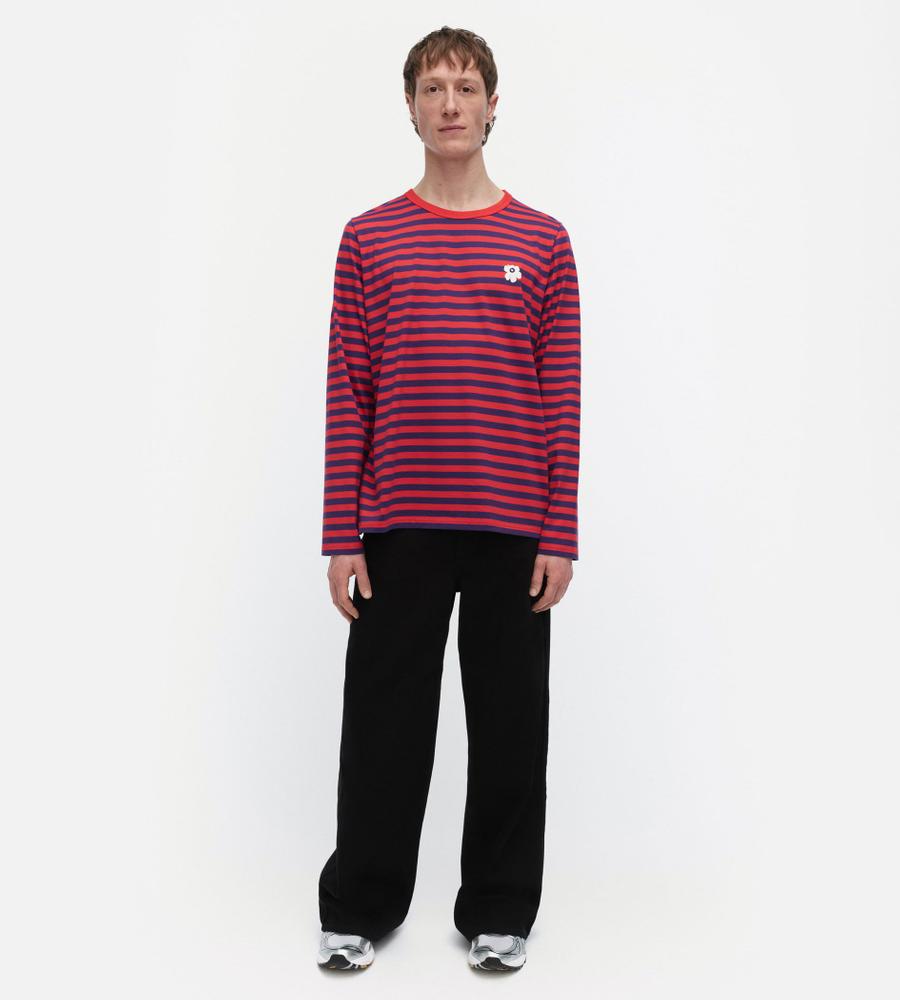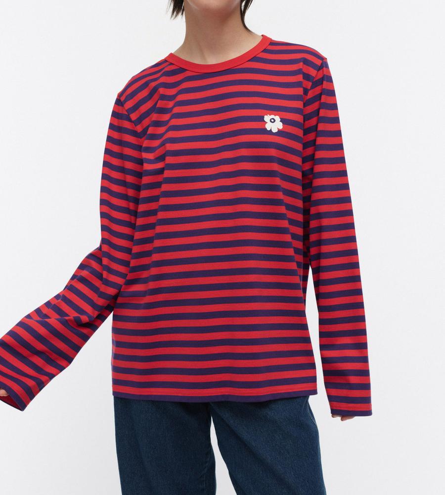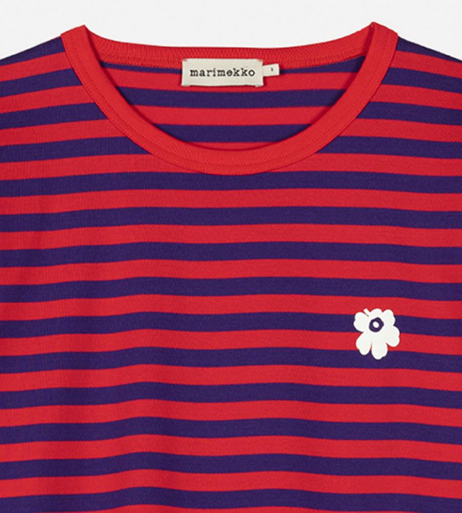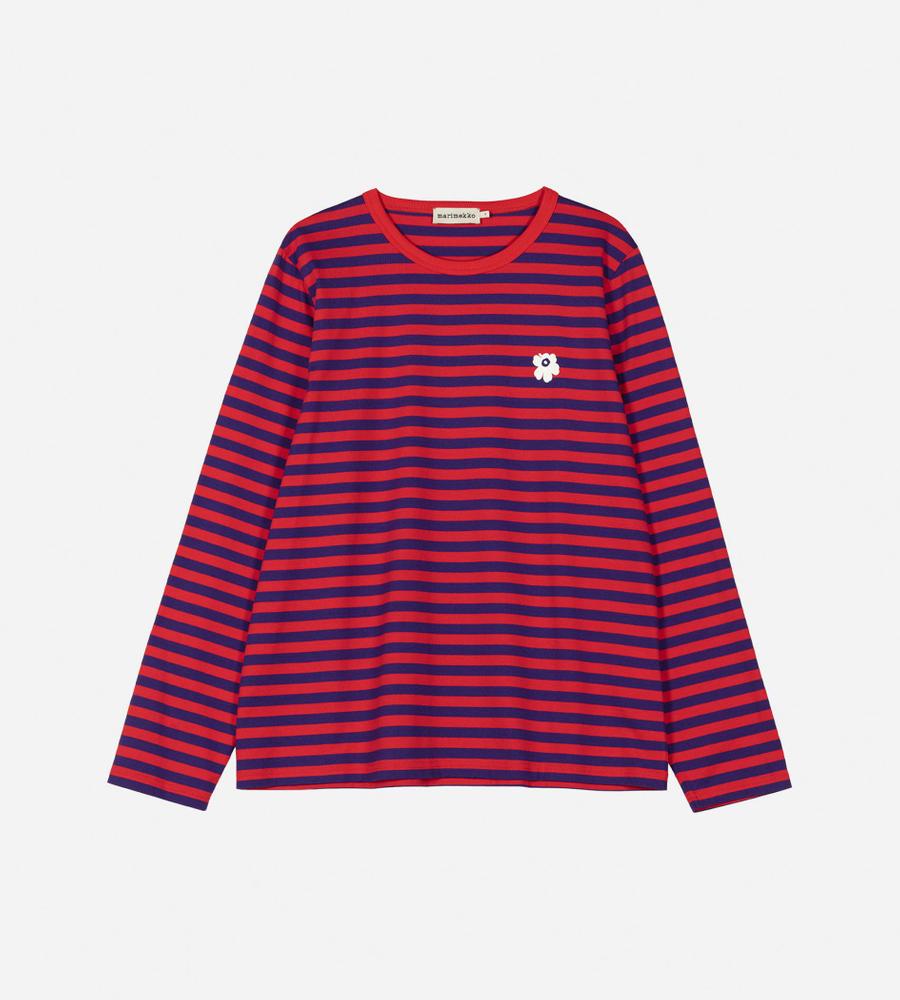 2色のボーダー柄が着こなしの華やかなアクセントになるOネック長袖カットソー。平等性を表現しているMarimekkoのボーダー柄。左胸のUnikko柄の小さなフラワーモチーフがスタイリッシュなワンポイント。ユニセックスなサイズ感もモダンなポイント。明るいムードのスタイリングが実現するアイテムです。