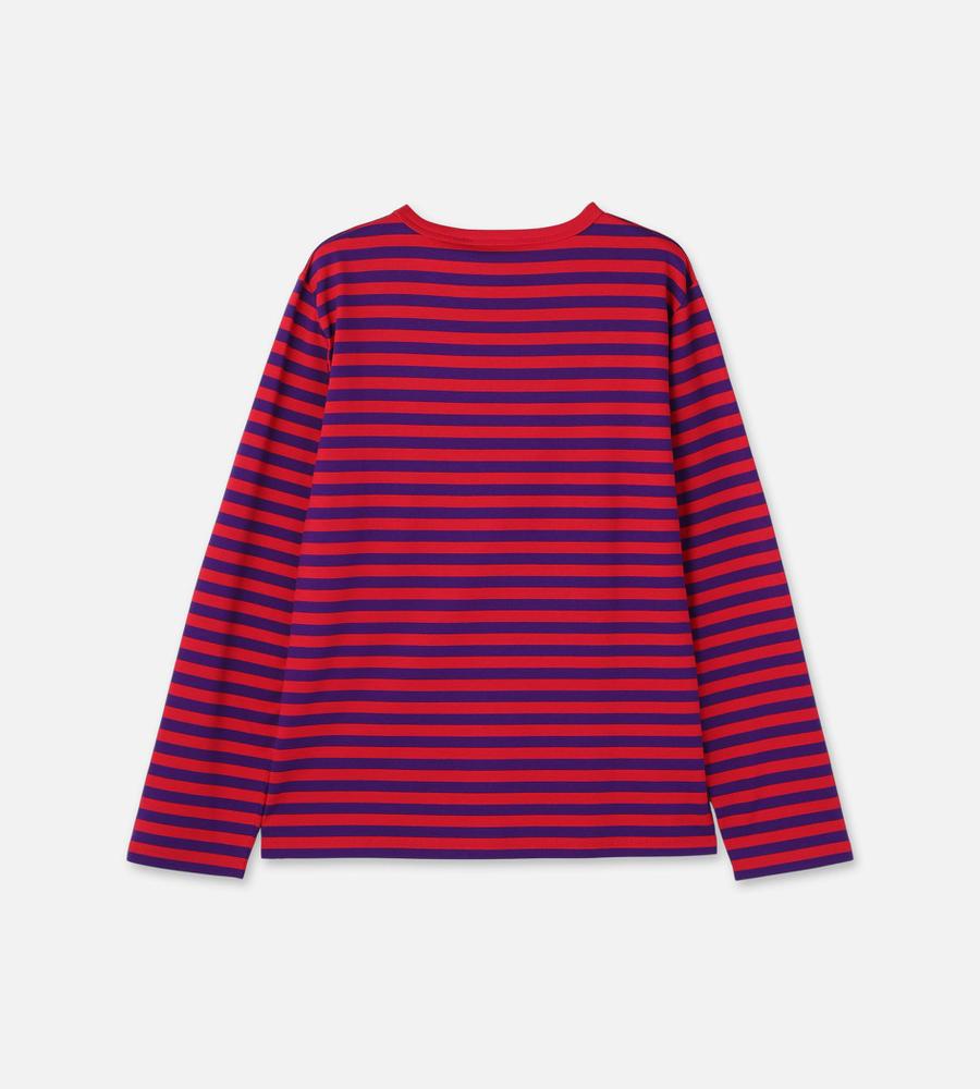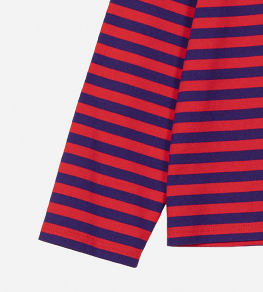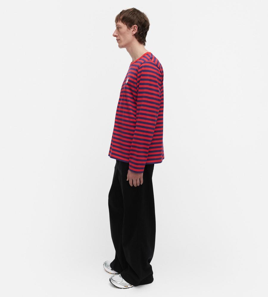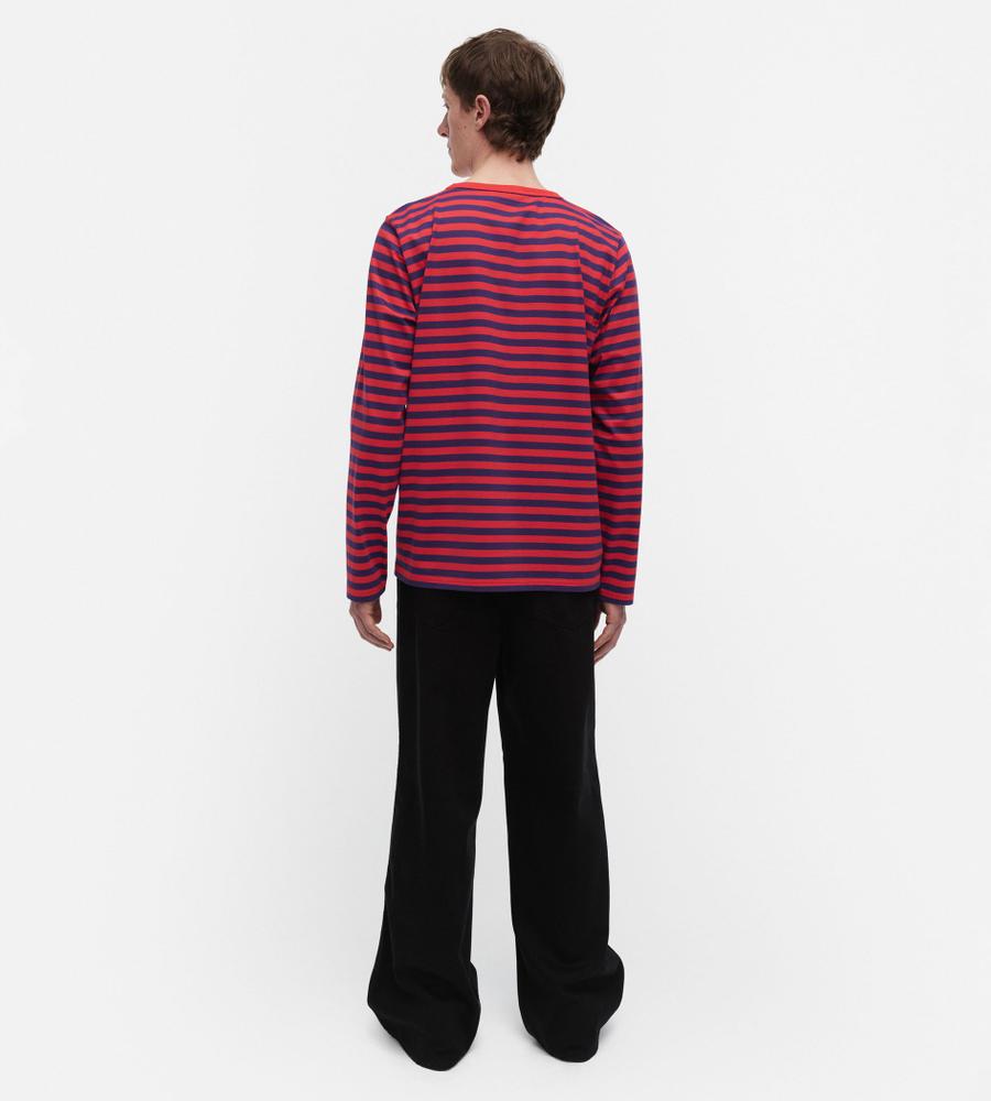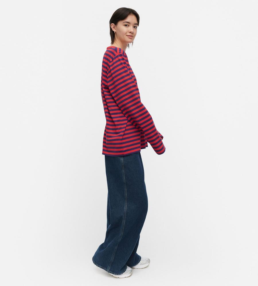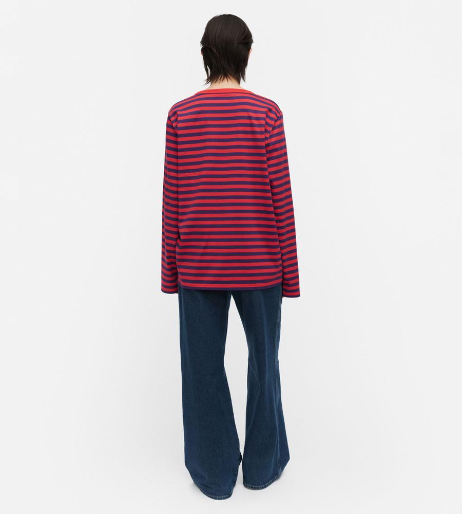 2色のボーダー柄が着こなしの華やかなアクセントになるOネック長袖カットソー。平等性を表現しているMarimekkoのボーダー柄。左胸のUnikko柄の小さなフラワーモチーフがスタイリッシュなワンポイント。ユニセックスなサイズ感もモダンなポイント。明るいムードのスタイリングが実現するアイテムです。