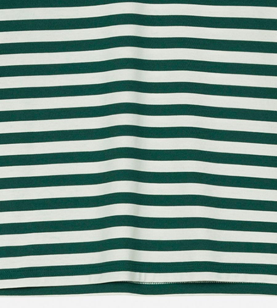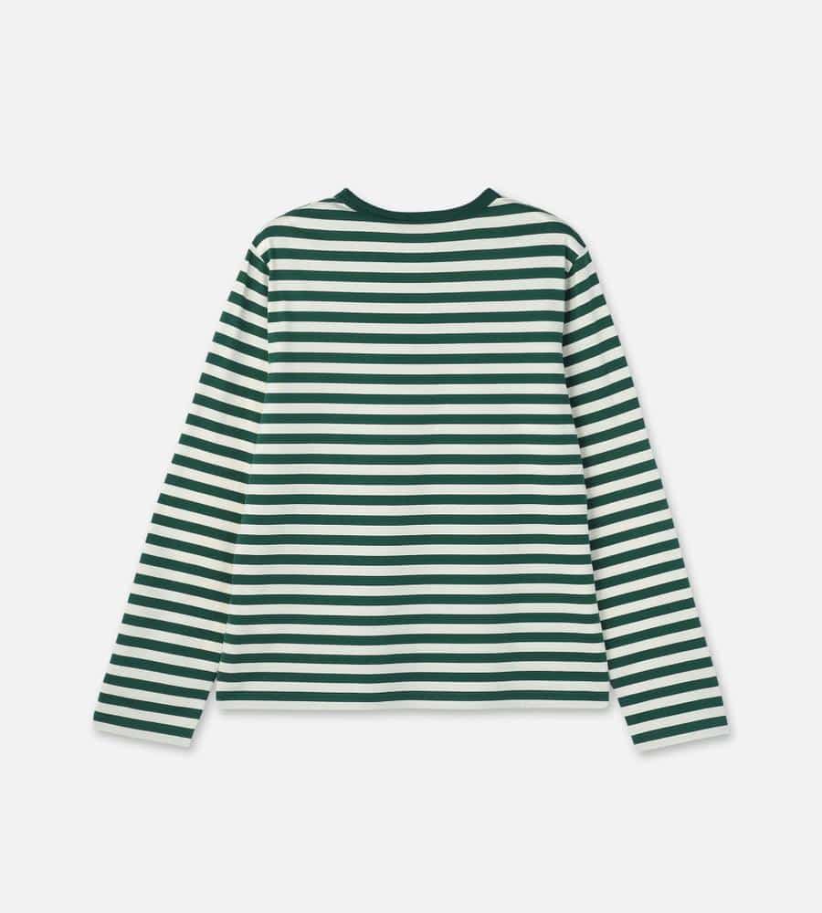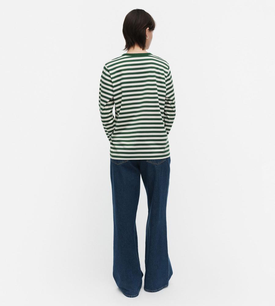 深みのあるグリーンベースのボーダー柄が着こなしの華やかなアクセントになるOネック長袖カットソー。均一なラインで平等性を表現しているMarimekkoのボーダー柄。左胸のUnikko柄の小さなフラワーモチーフがスタイリッシュなワンポイント。ユニセックスなサイズ感もモダンなポイントです。