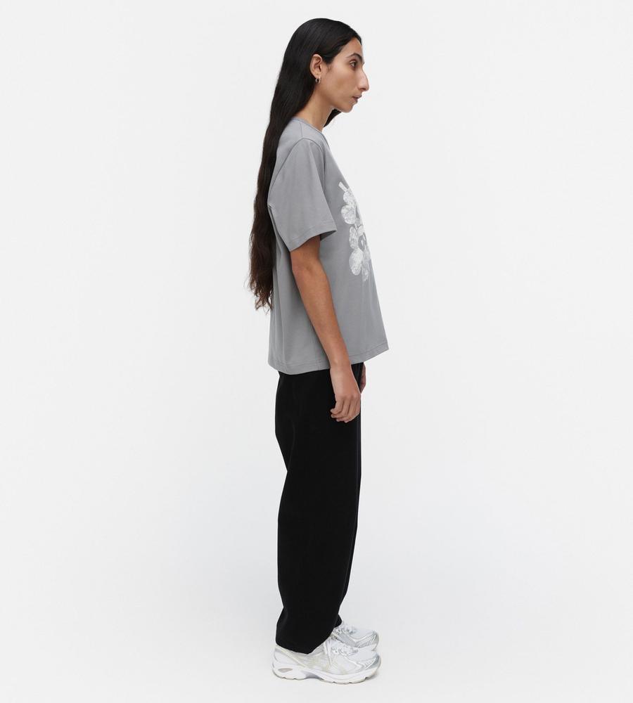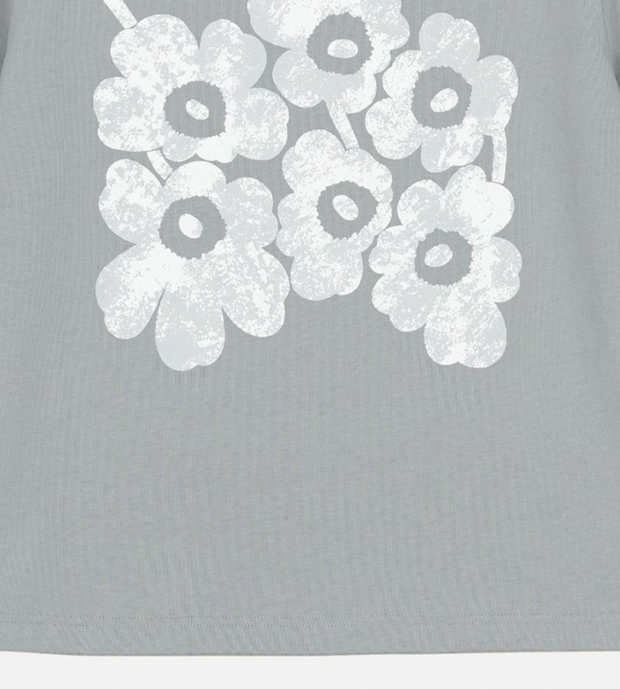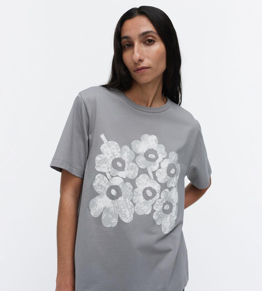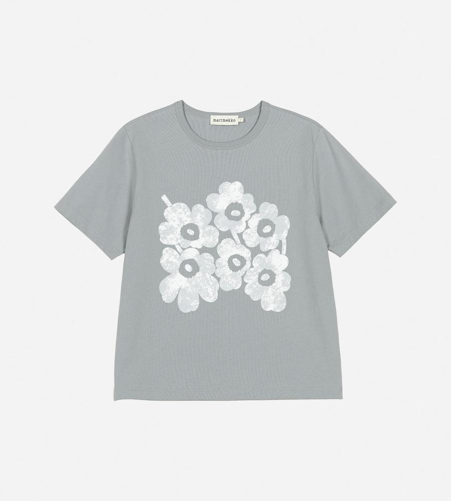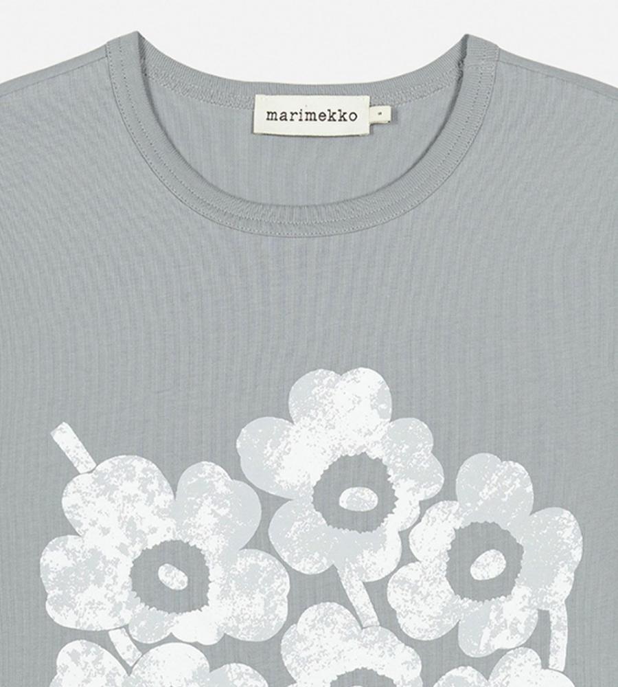 Marimekkoを代表するUnikko柄をフロントにプリントした半袖Tシャツ。水彩画のようなフラワープリントが目を惹くスタイリッシュなデザイン。ゆとりをもたせたモダンなシルエットも魅力。シンプルなデザインでさまざまなボトムとマッチします。毎日のスタイリングで活躍するアイテムです。