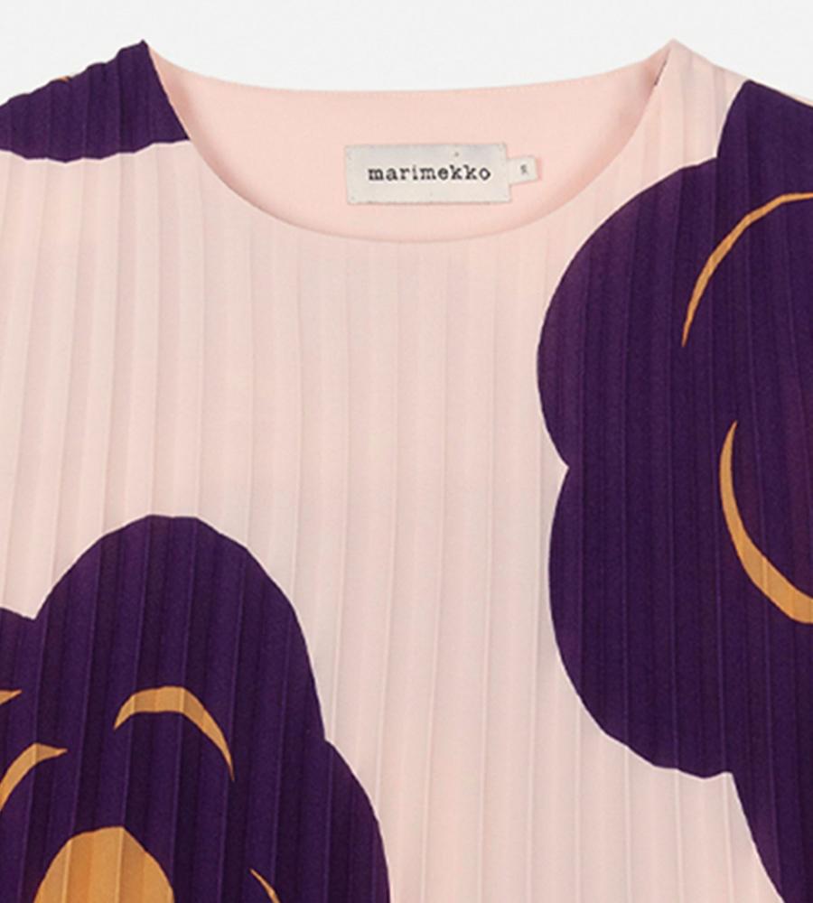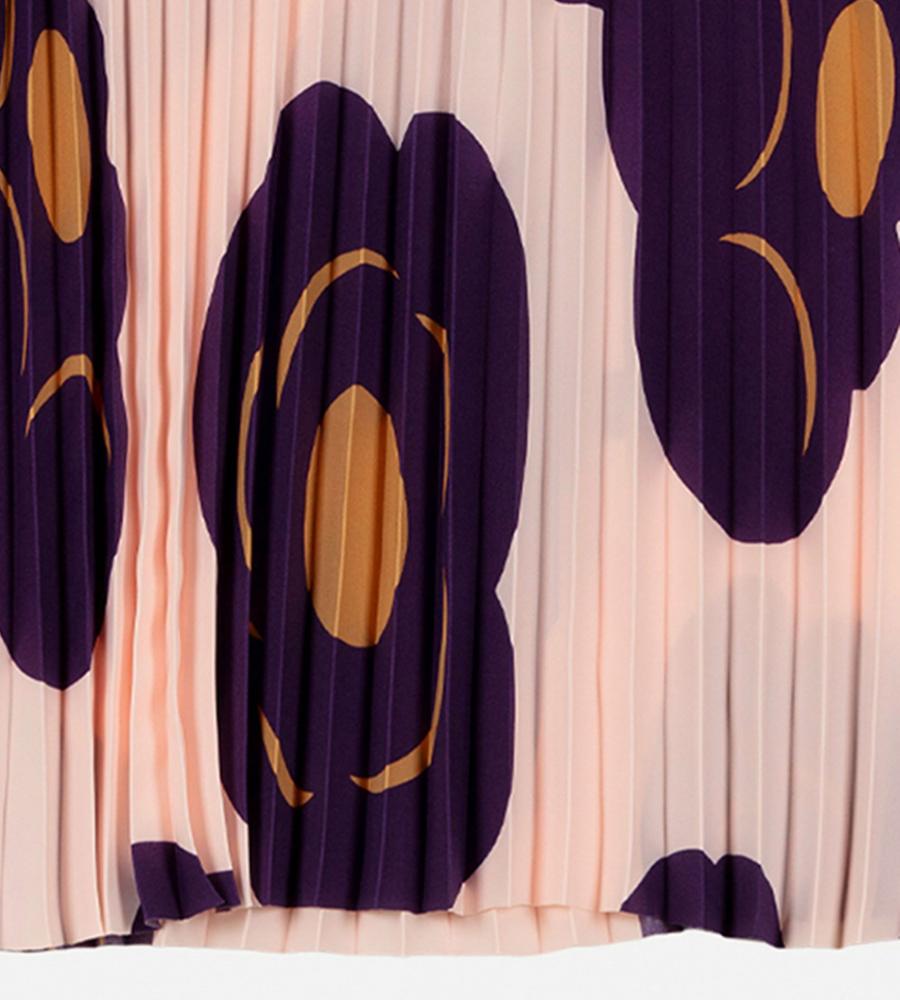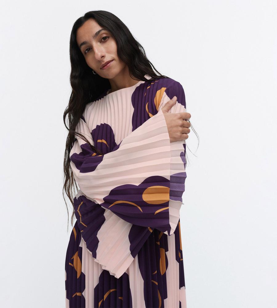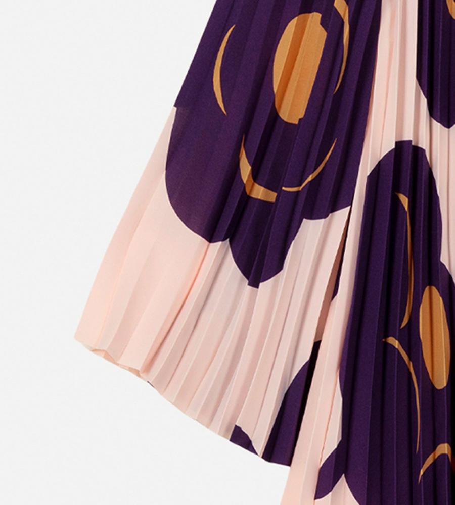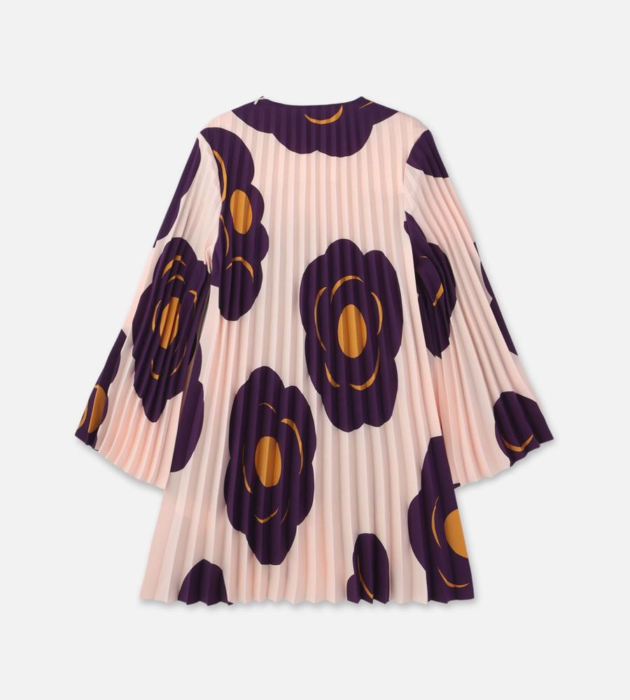 大柄のフローラルパターンを配置して存在感を際立たせたTummaプリーツワンピース。優美に広がるロングトランペットスリーブが特徴的なデザイン。ボディラインを拾わずにゆったりと着こなせるため、コンフォートなムードを纏えます。
