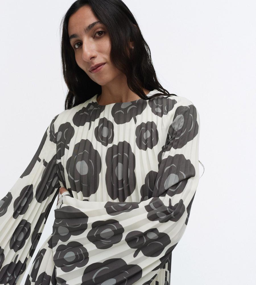 オフホワイト×ダークグレーでシックな雰囲気にまとめたTummaプリーツワンピース。優美に広がるロングトランペットスリーブが特徴的なデザイン。ボディラインを拾わずにゆったりと着こなせるため、コンフォートなムードを纏えます。
