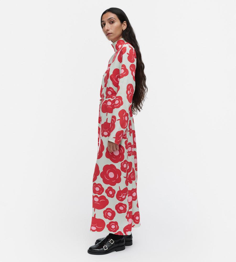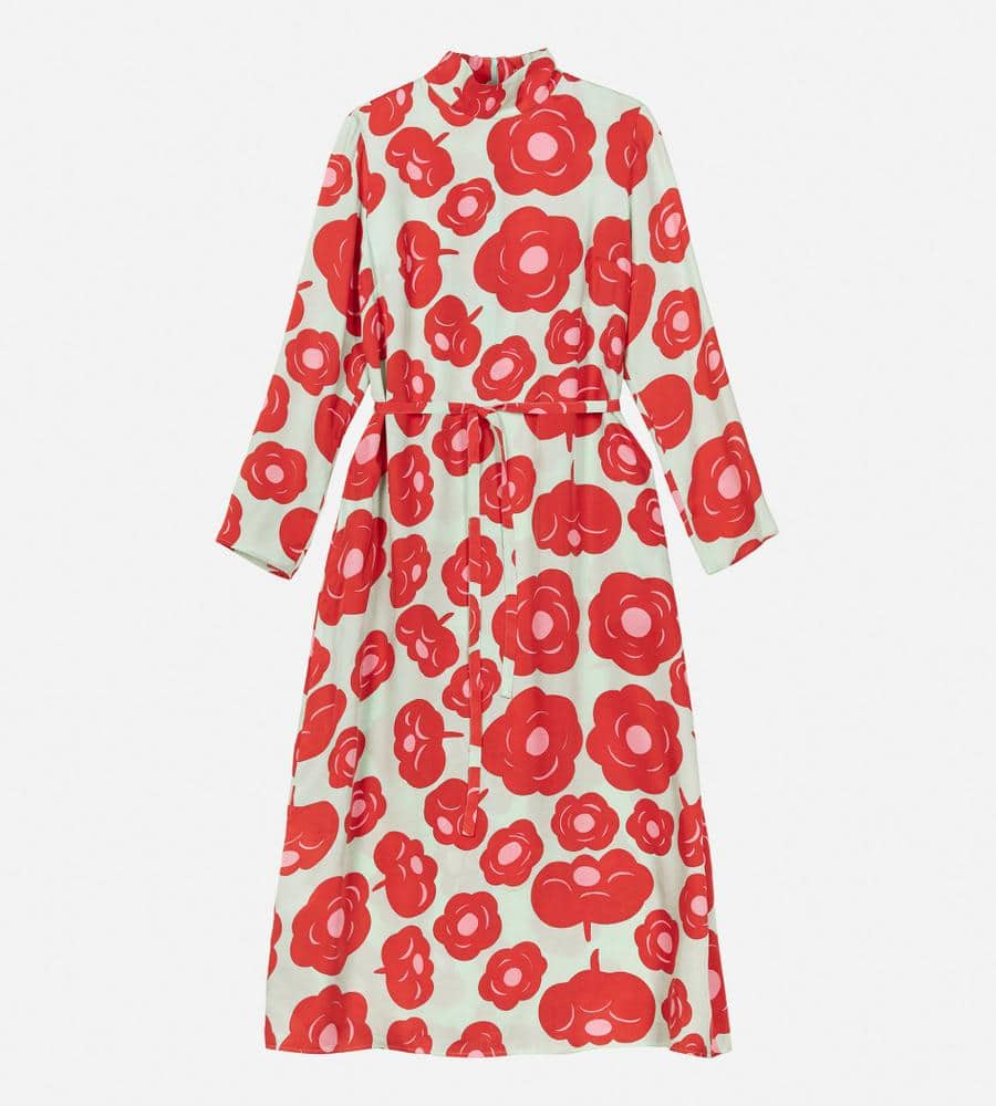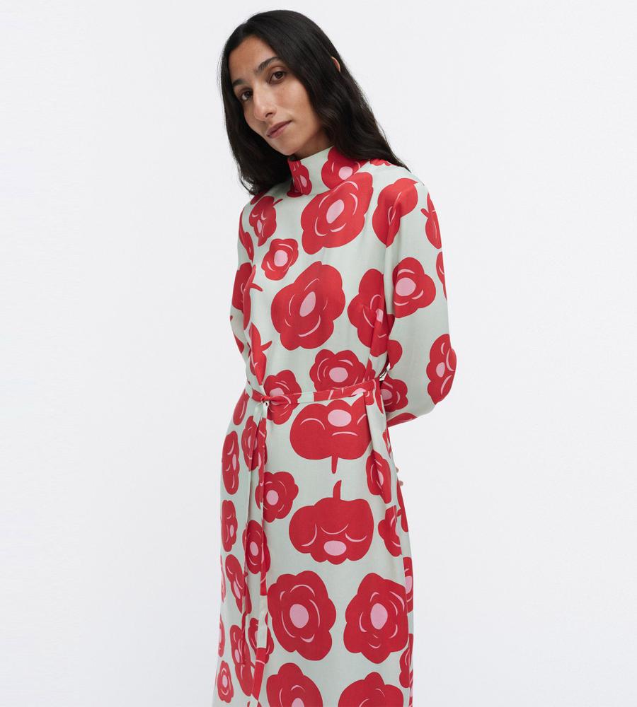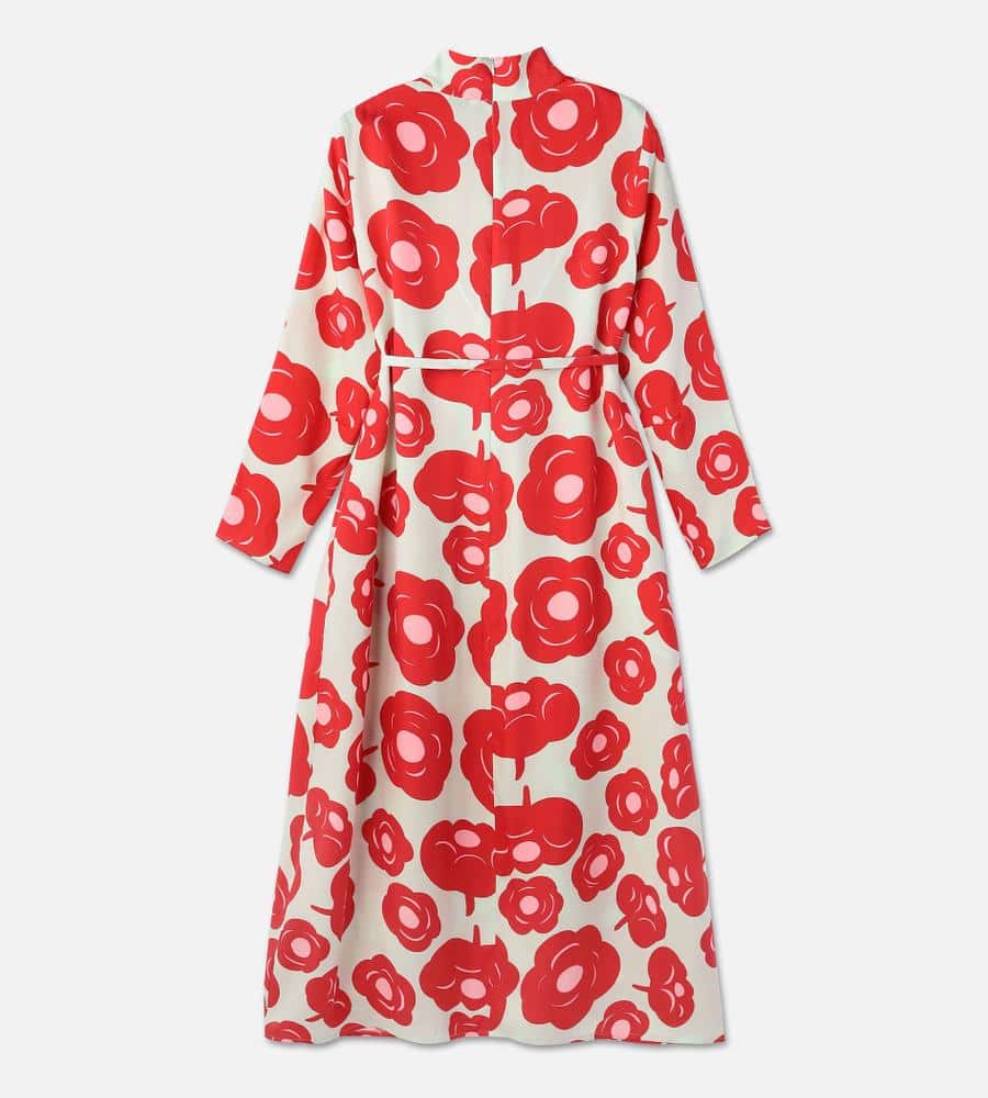 印象的なTumma柄のロング丈ワンピース。総プリントのフラワーモチーフが華やかなデザイン。共布のベルト付きで、ロング丈でもメリハリのあるシルエット。高めのスタンドカラーがモダンなシルエット。さっと一枚着るだけで、スタイリッシュなお出かけコーディネートが実現するアイテムです。