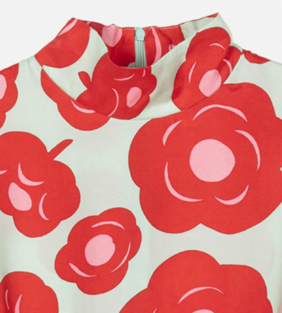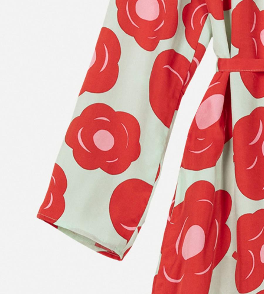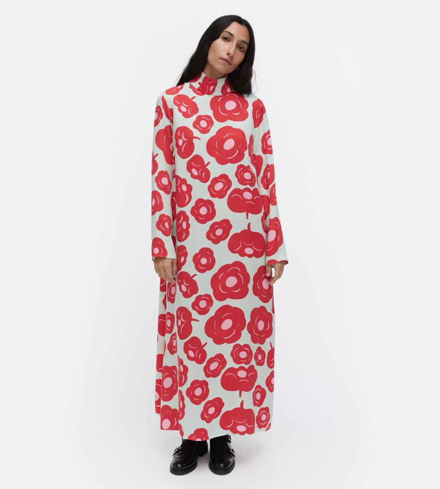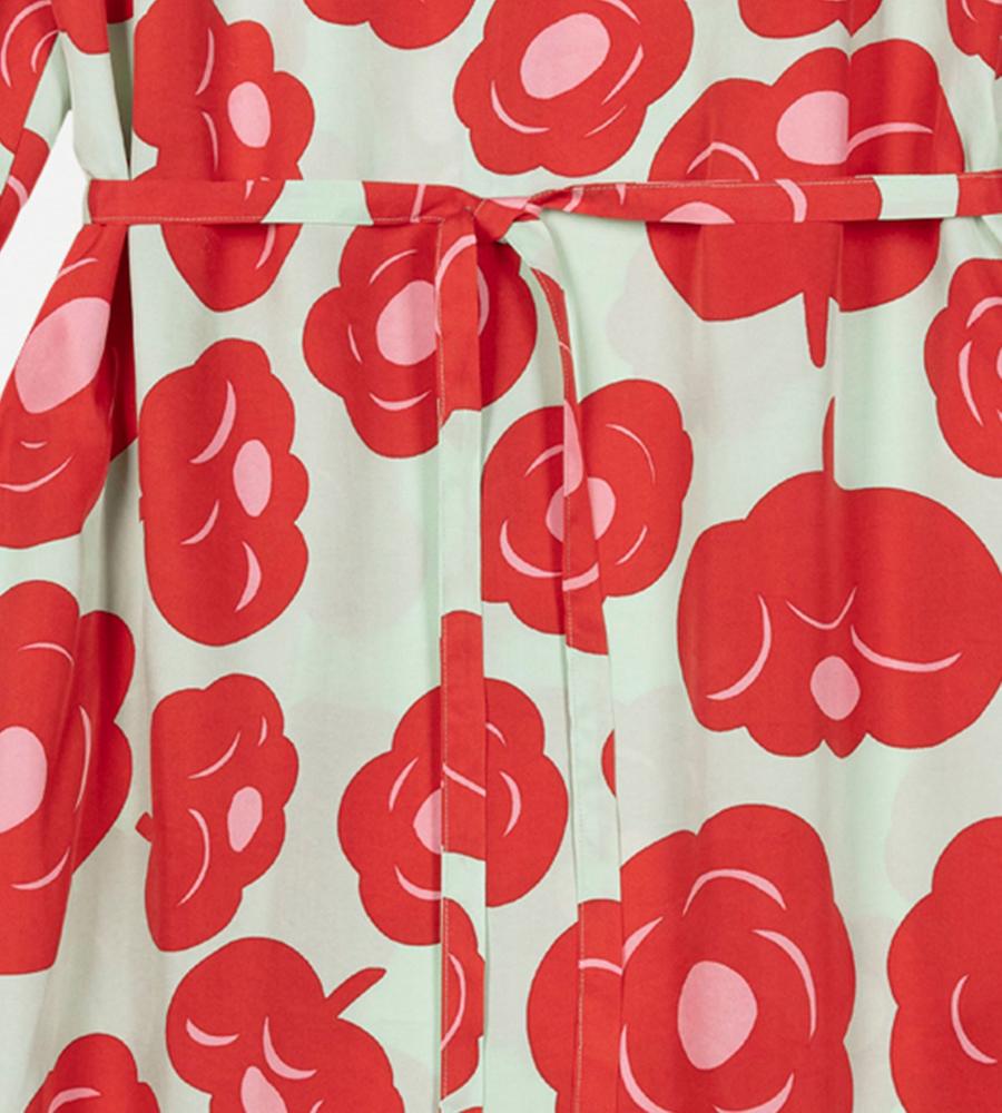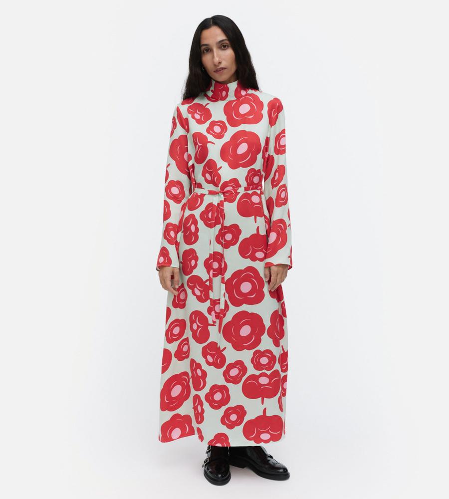印象的なTumma柄のロング丈ワンピース。総プリントのフラワーモチーフが華やかなデザイン。共布のベルト付きで、ロング丈でもメリハリのあるシルエット。高めのスタンドカラーがモダンなシルエット。さっと一枚着るだけで、スタイリッシュなお出かけコーディネートが実現するアイテムです。