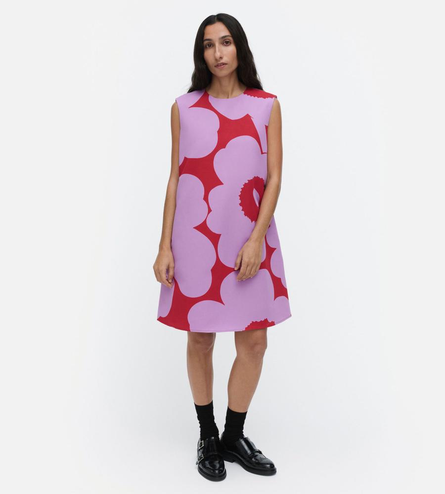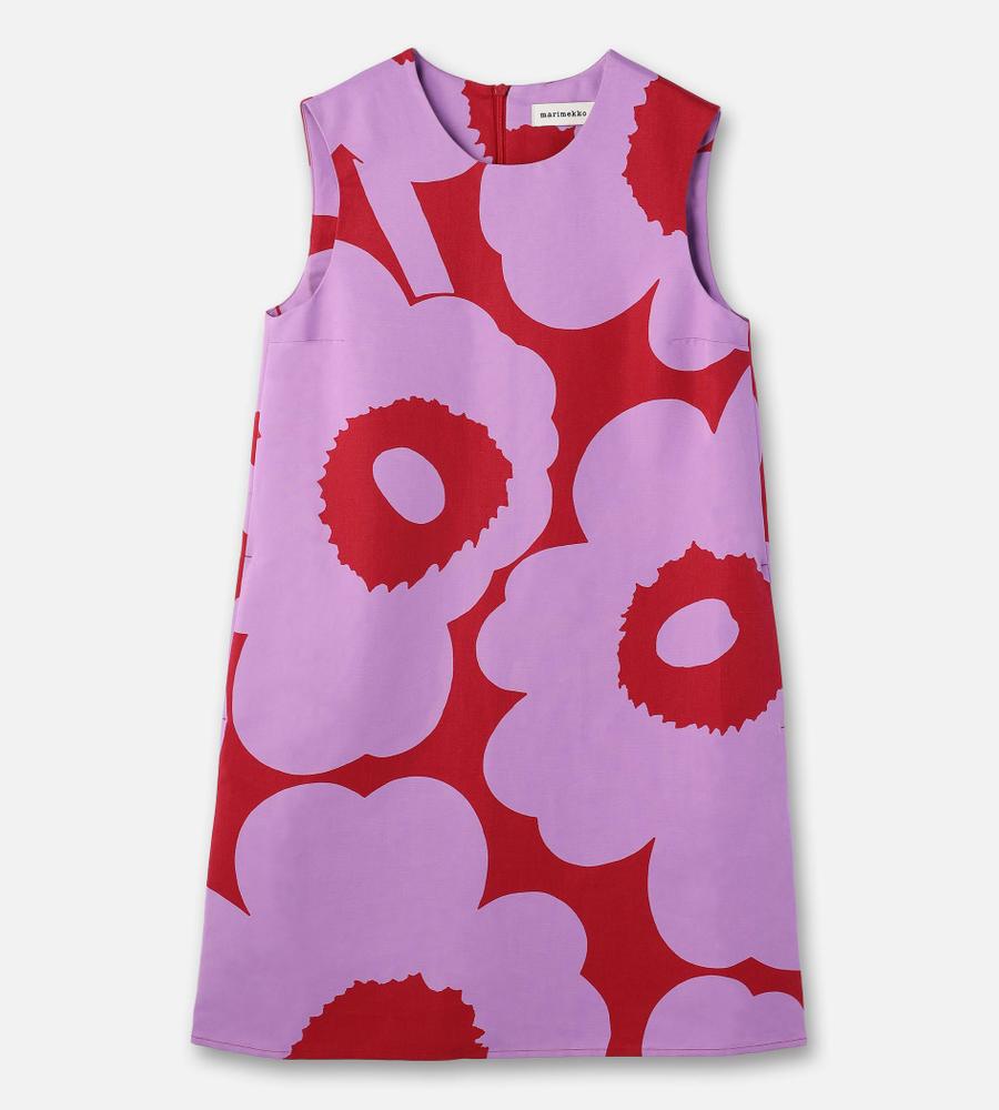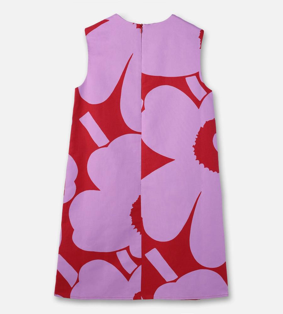 ハリのある素材感で、綺麗なシルエットをキープするノースリーブのミニドレスです。くっきりとした配色の「Unikko」柄は一枚で様になり、バッグやシューズなどの小物はシンプルなものを合わせるのがおすすめ。インナーを重ねてジャンパースカートのように着こなしたり、レギンスやパンツを重ねてチュニックのように取り入れたり、コーディネートの幅を広げてくれるアイテムです。