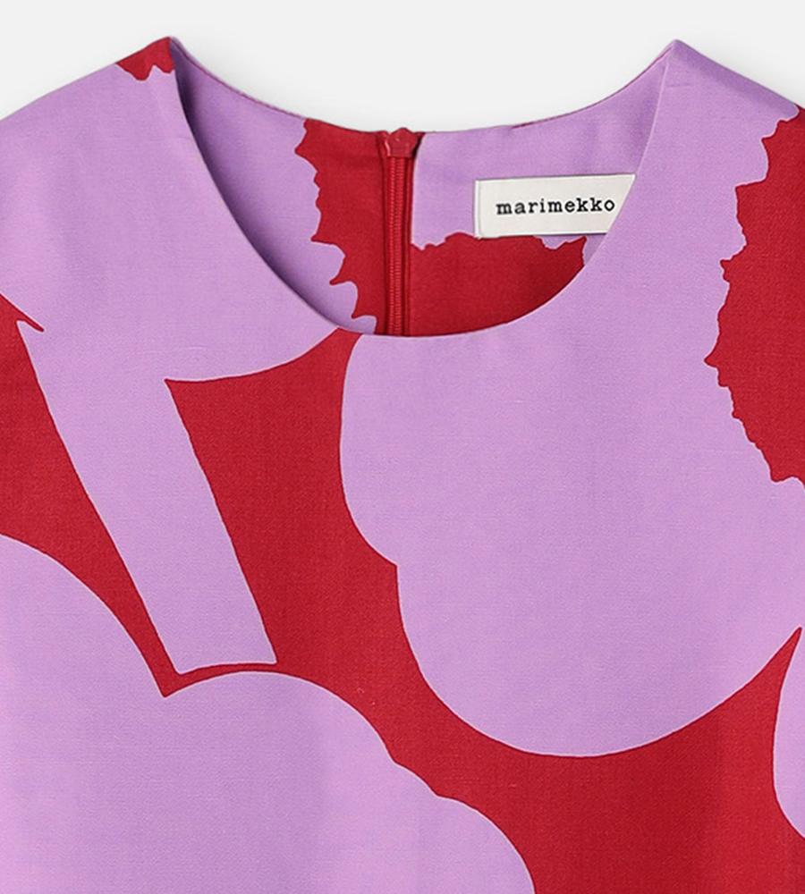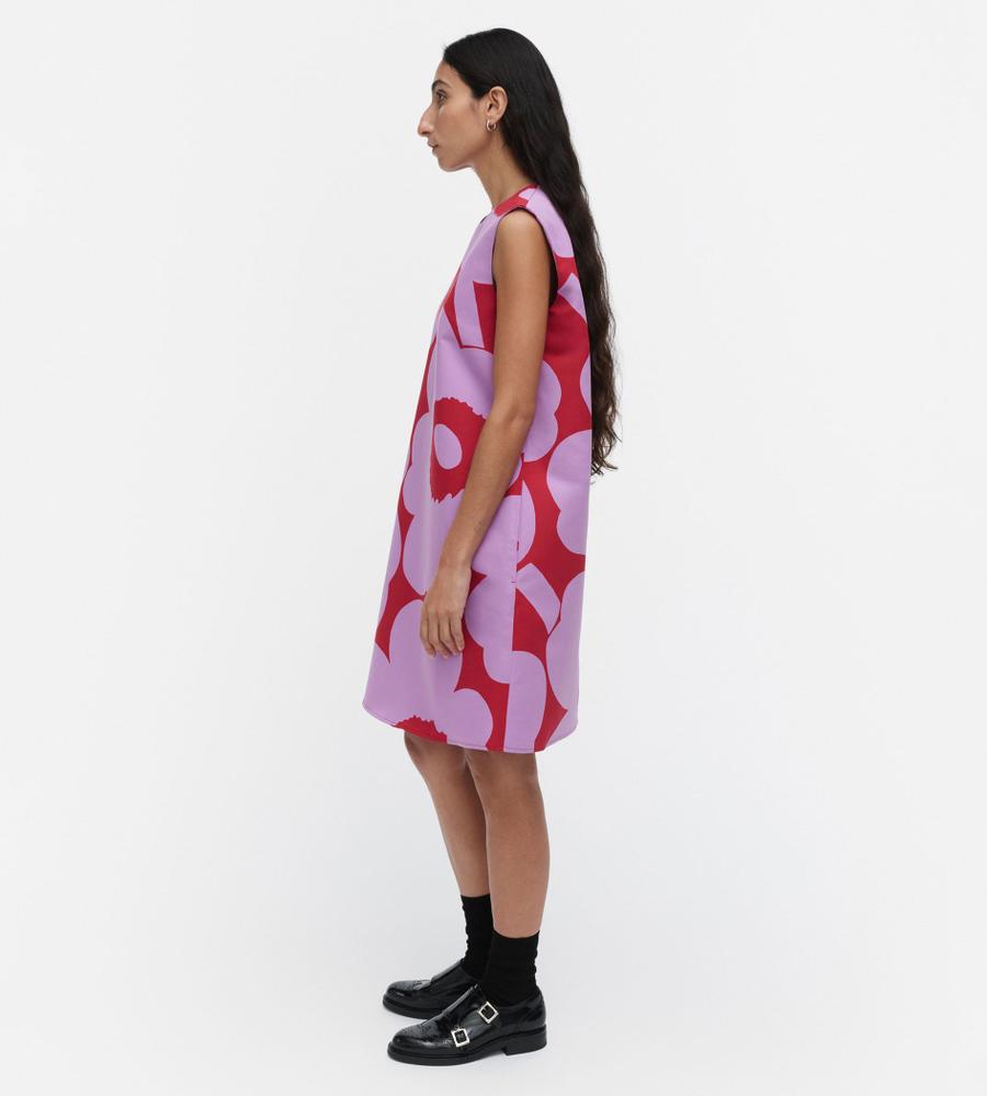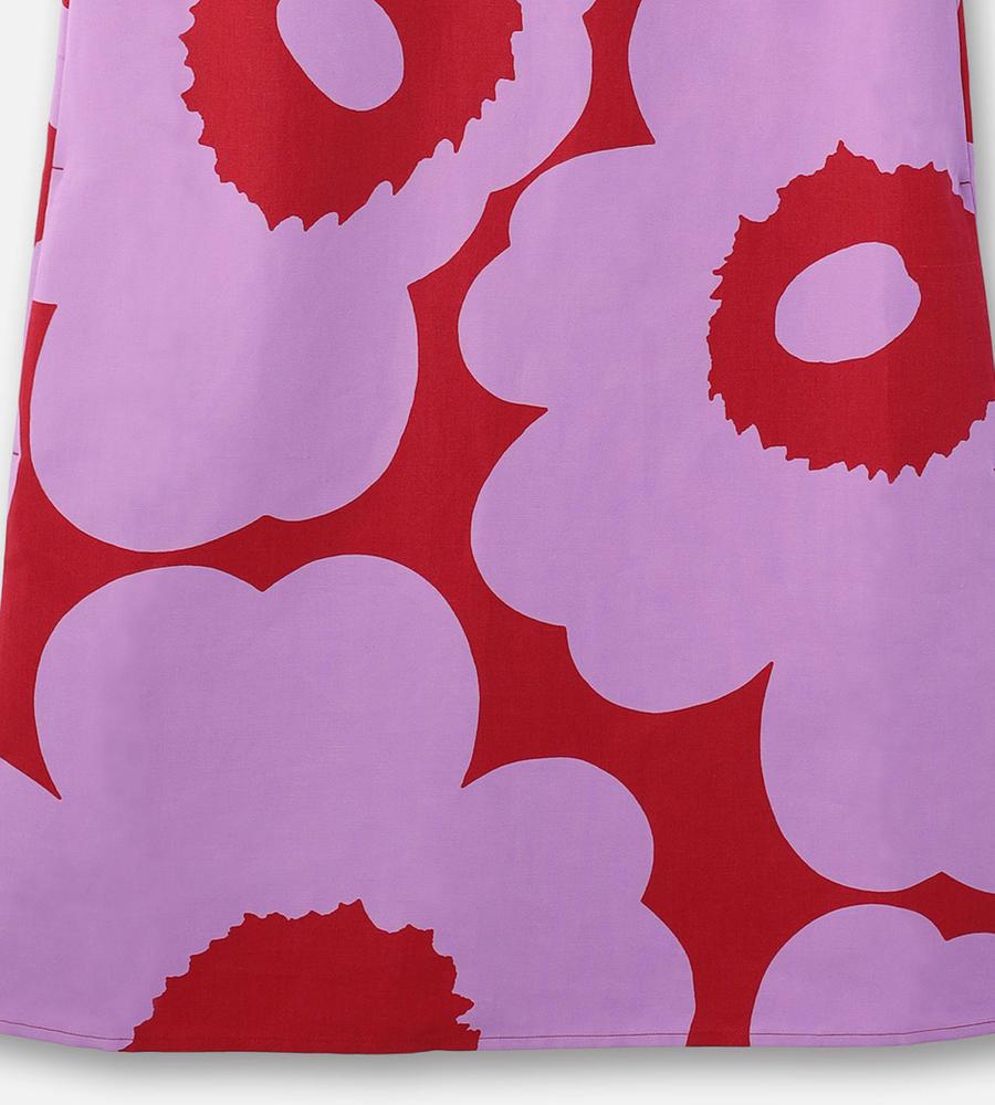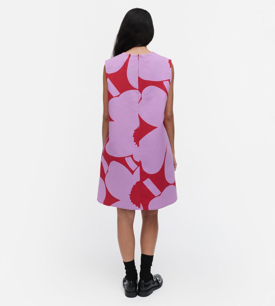 ハリのある素材感で、綺麗なシルエットをキープするノースリーブのミニドレスです。くっきりとした配色の「Unikko」柄は一枚で様になり、バッグやシューズなどの小物はシンプルなものを合わせるのがおすすめ。インナーを重ねてジャンパースカートのように着こなしたり、レギンスやパンツを重ねてチュニックのように取り入れたり、コーディネートの幅を広げてくれるアイテムです。