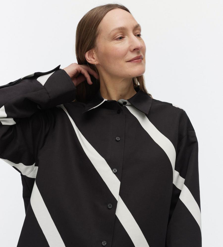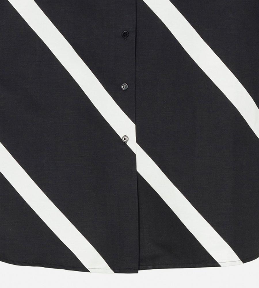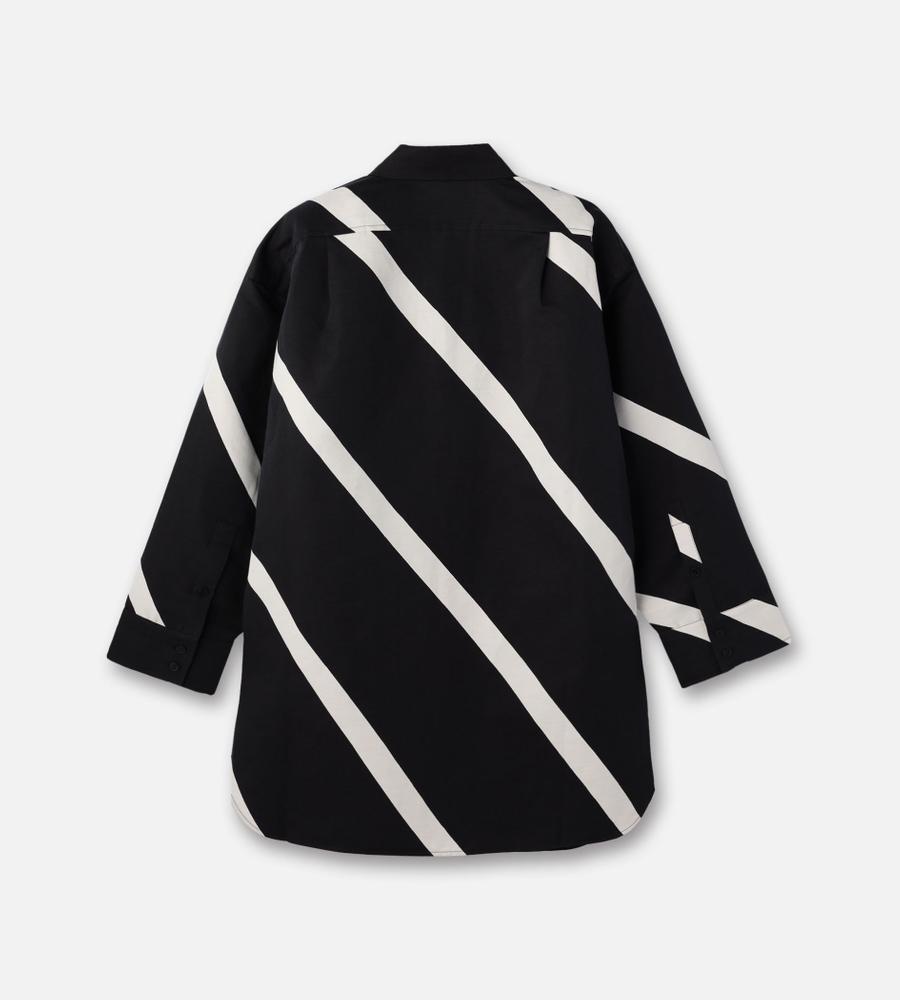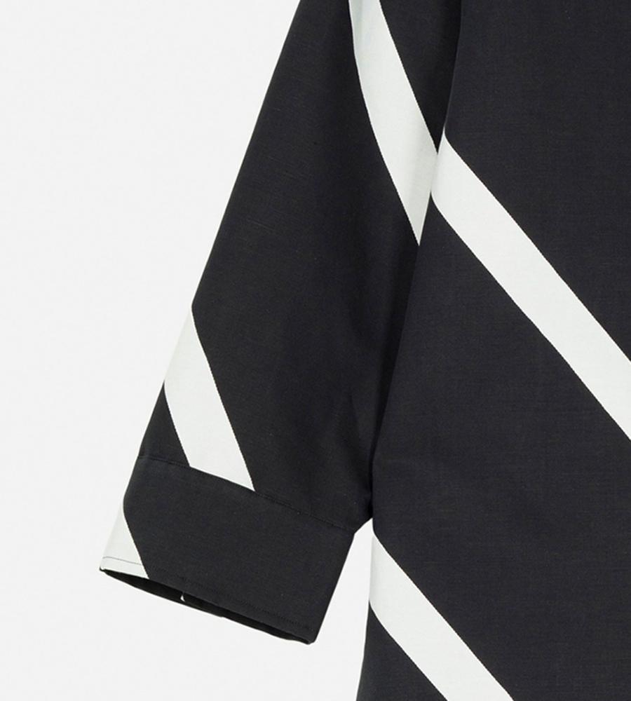 斜めのストライプ柄「Basso」の長袖シャツです。ヒップが隠れるチュニック丈で、袖や身幅にゆとりを持たせているのが特徴。体のラインを拾いにくく、幅広い体型をカバーしてくれる一着です。シンプルな柄で取り入れやすく、ゆったりシルエットでもすっきり見えします。
