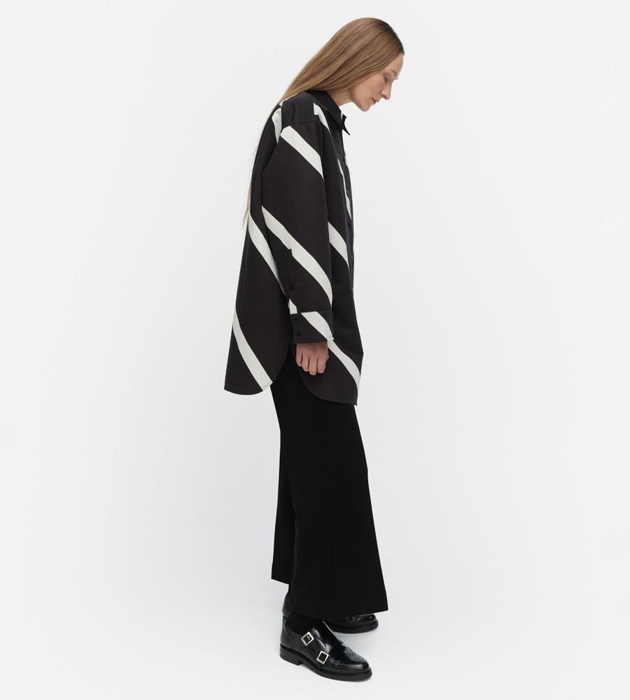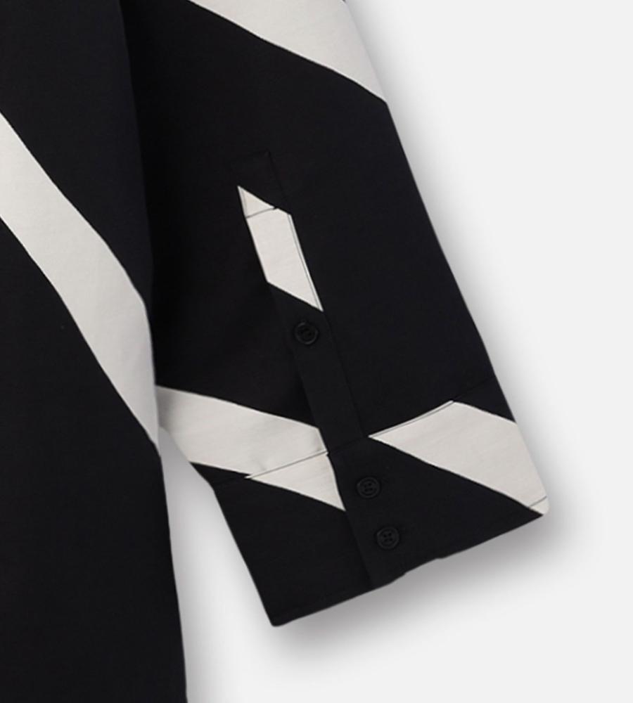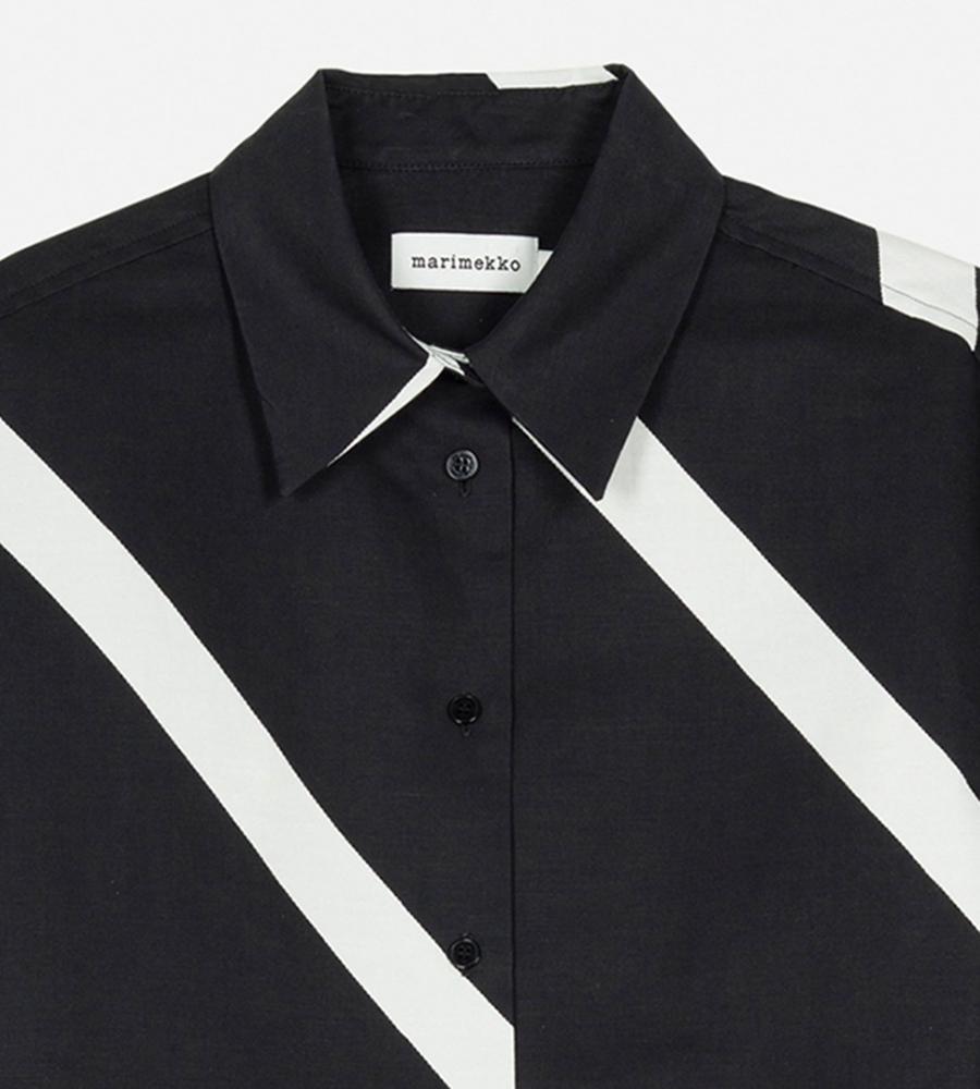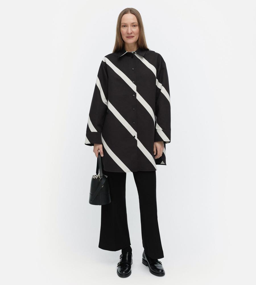 斜めのストライプ柄「Basso」の長袖シャツです。ヒップが隠れるチュニック丈で、袖や身幅にゆとりを持たせているのが特徴。体のラインを拾いにくく、幅広い体型をカバーしてくれる一着です。シンプルな柄で取り入れやすく、ゆったりシルエットでもすっきり見えします。