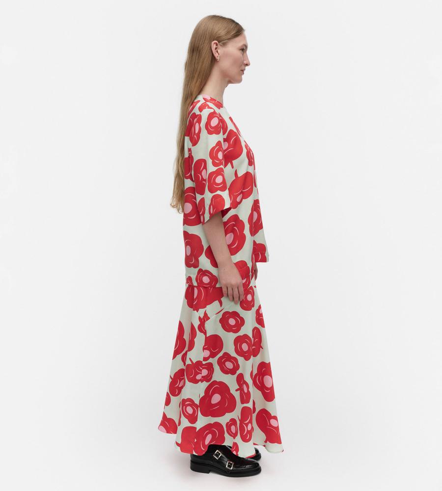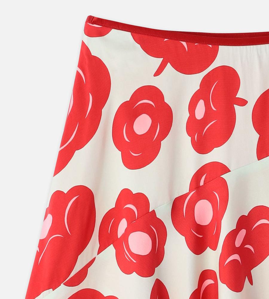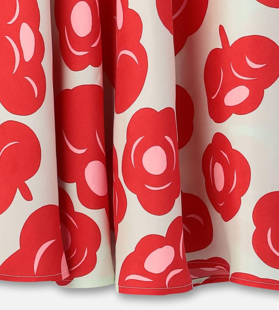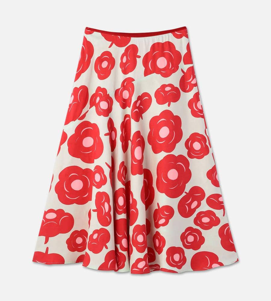 華やかなTumma柄のロング丈スカート。全体にプリントされたフラワーモチーフが目を惹くデザイン。裾に向かってフレアに広がるドレープ感のあるフェミニンなシルエット。ウエストはゴム仕様で履き心地快適なのもうれしいポイント。お手持ちのトップスに合わせて、スタイリッシュなコーディネートが実現するアイテムです。