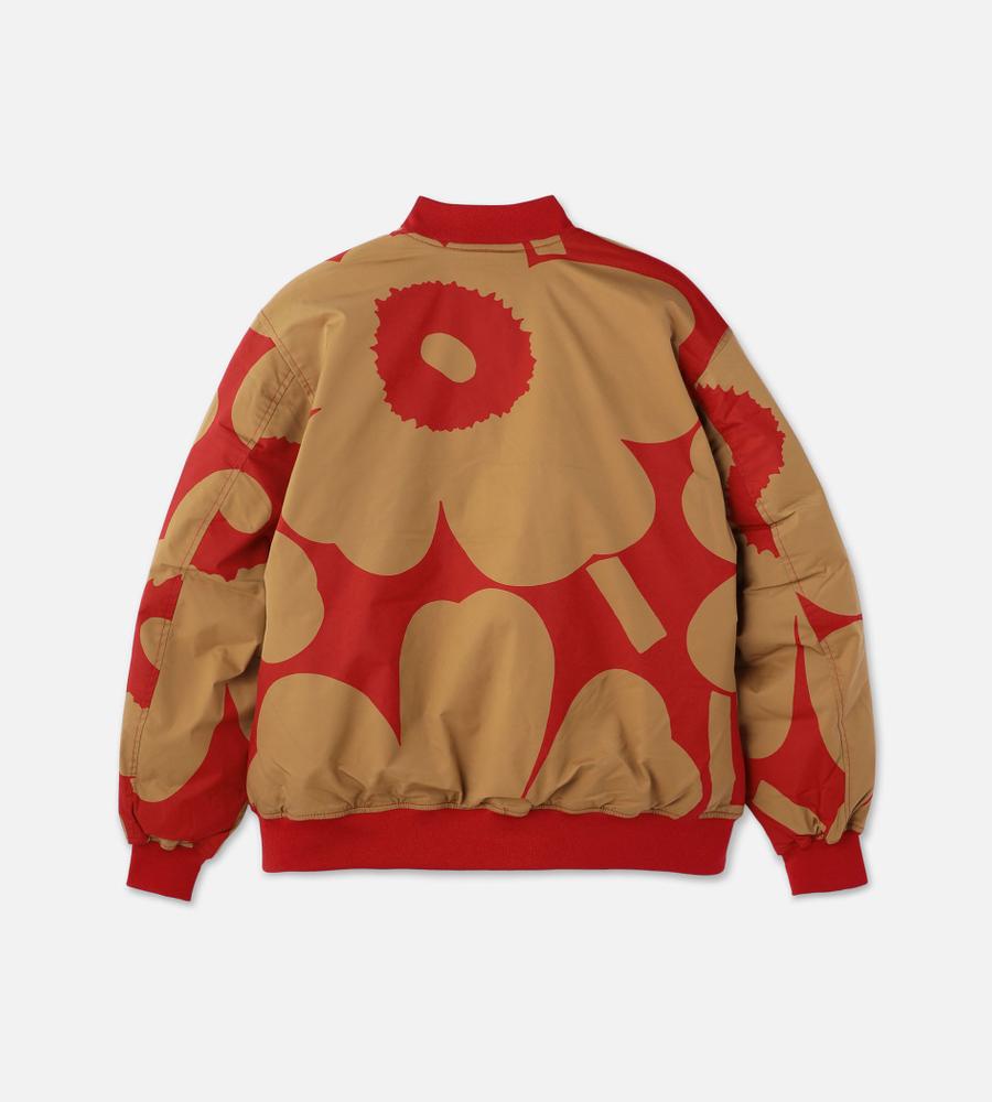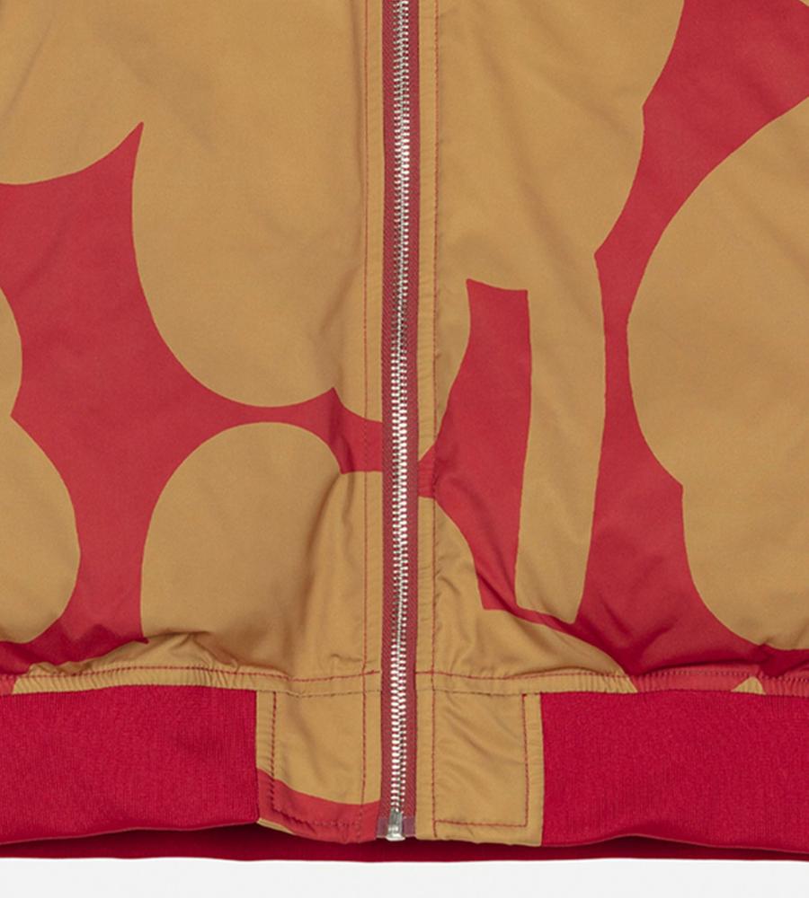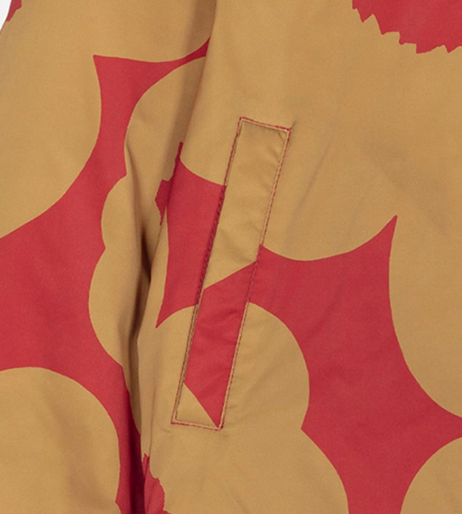 大柄の Unikkoパターンをレッド×ブラウンで仕上げたスタイリングの主役になる中綿コート。100%リサイクルポリエステルを採用。フロントはファスナー仕様、サイドにポケットを配置。首まわり、袖先、裾はリブで切り替えメリハリのあるデザインに。