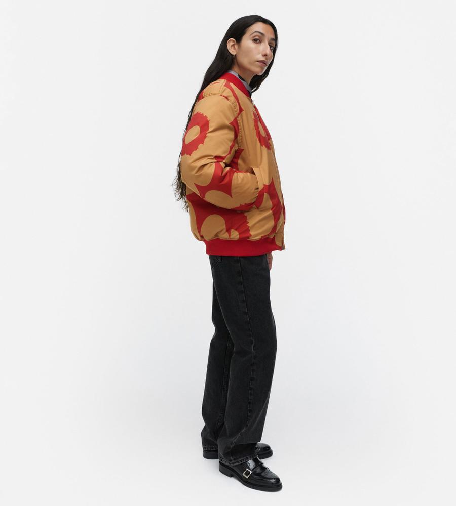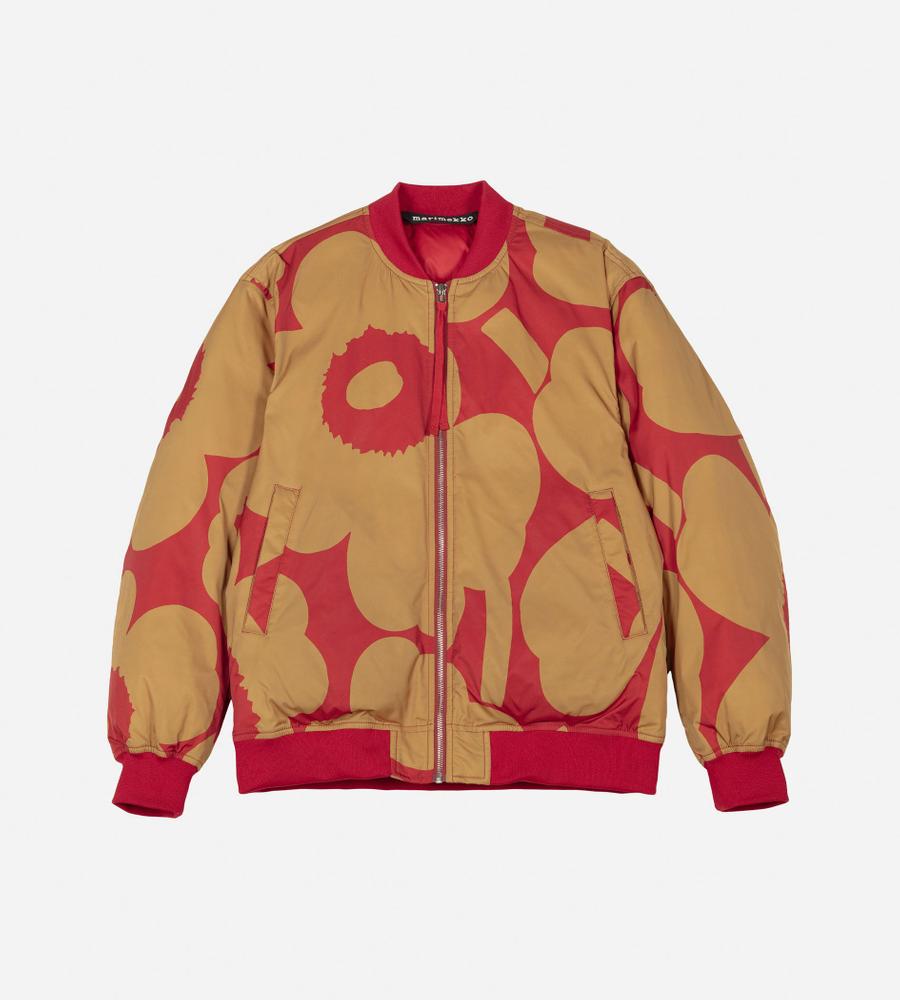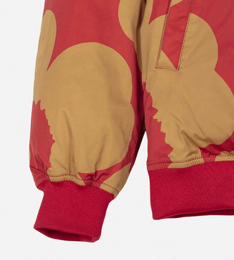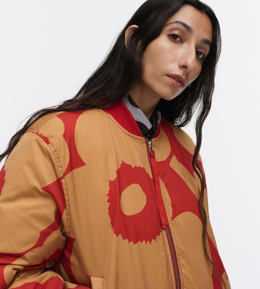 大柄の Unikkoパターンをレッド×ブラウンで仕上げたスタイリングの主役になる中綿コート。100%リサイクルポリエステルを採用。フロントはファスナー仕様、サイドにポケットを配置。首まわり、袖先、裾はリブで切り替えメリハリのあるデザインに。