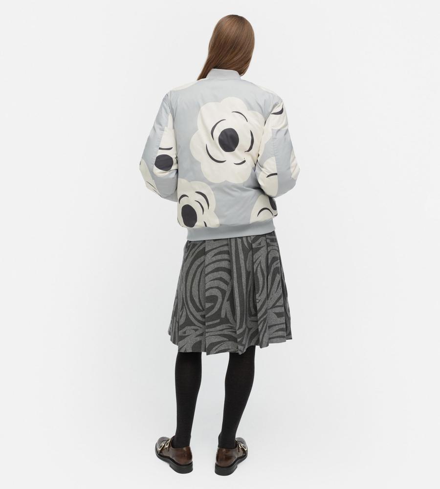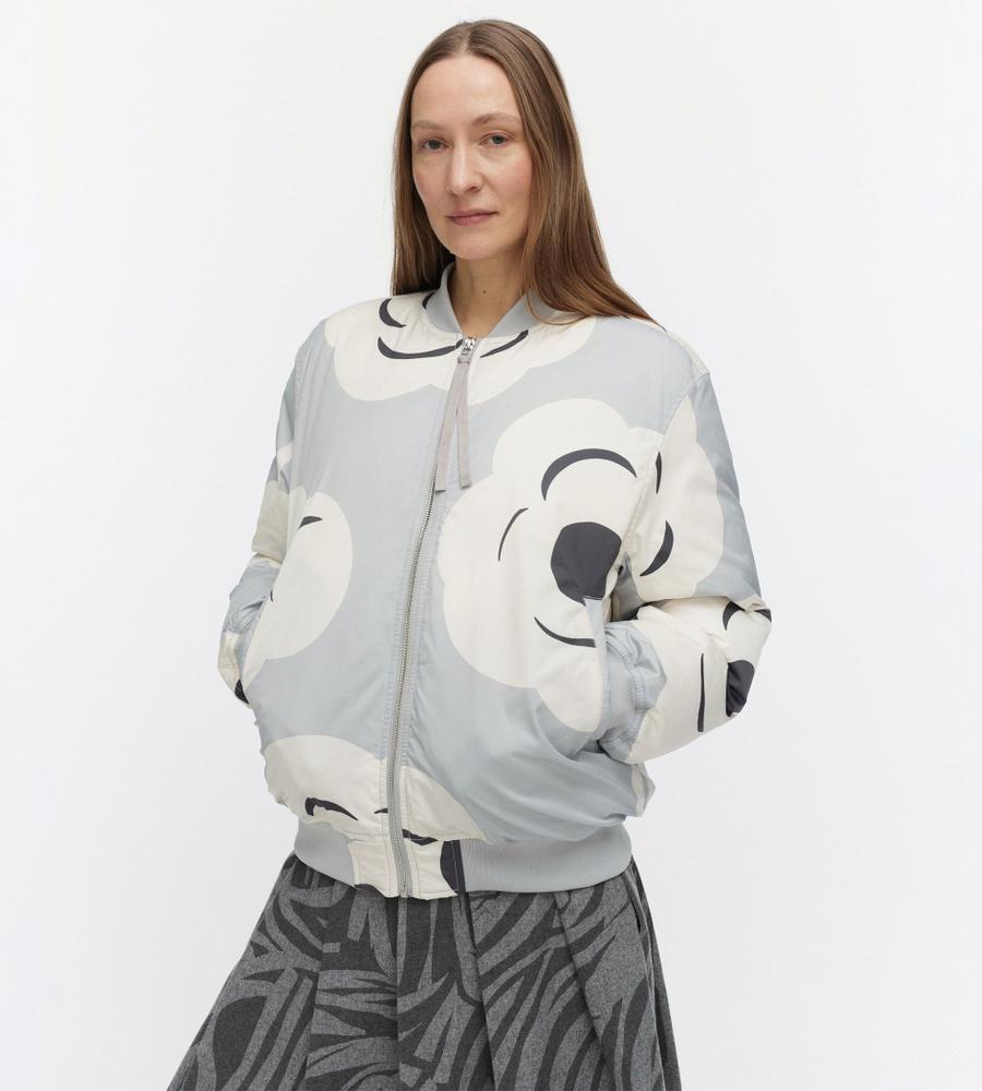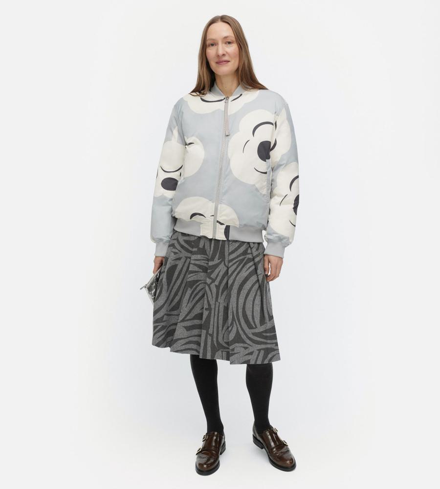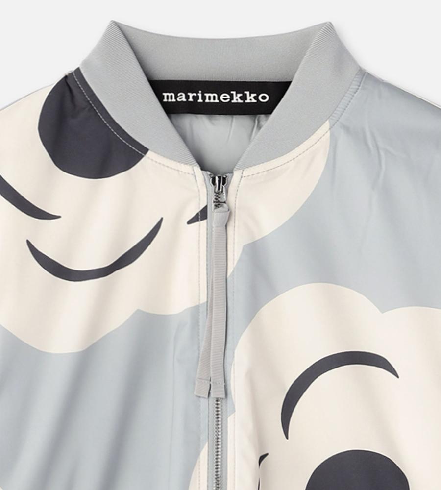 グレー×オフホワイトでカジュアルシックな印象に仕上げたTummaパターンの中綿コート。100%リサイクルポリエステルを採用。フロントはファスナー仕様、サイドにポケットを配置。首まわり、袖先、裾はリブで切り替えメリハリのあるデザインに。